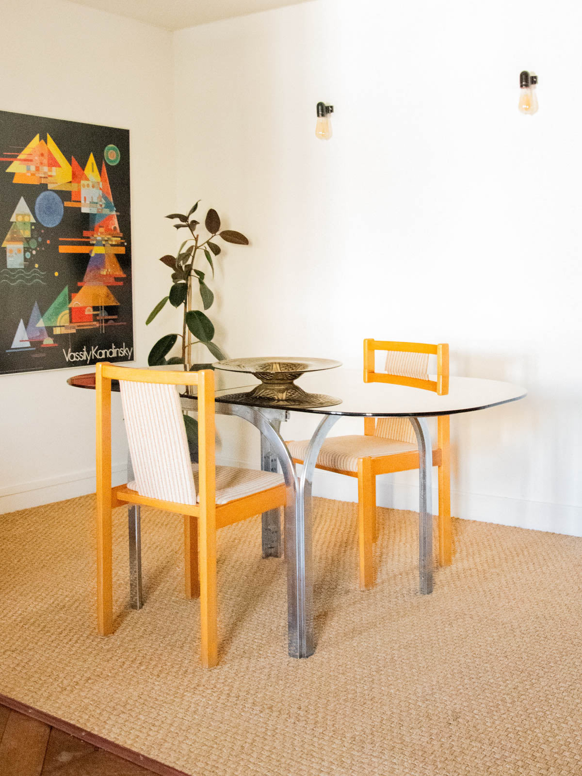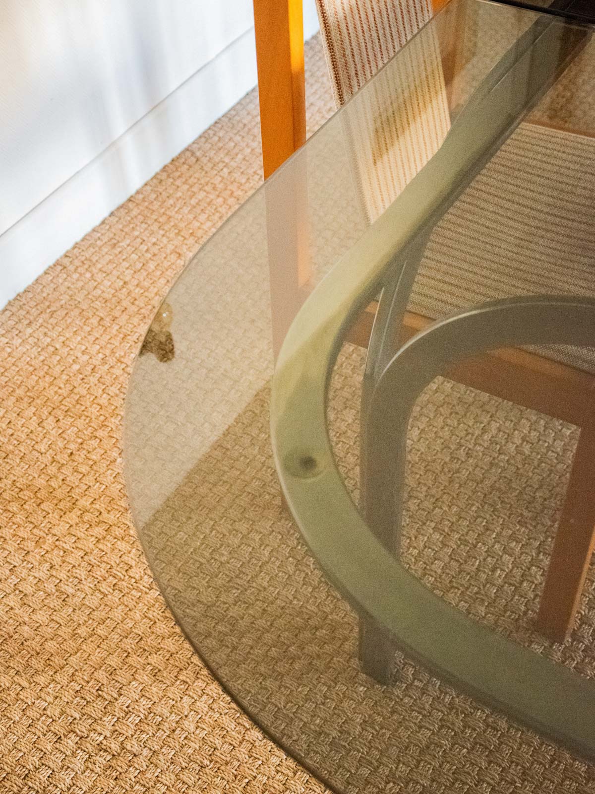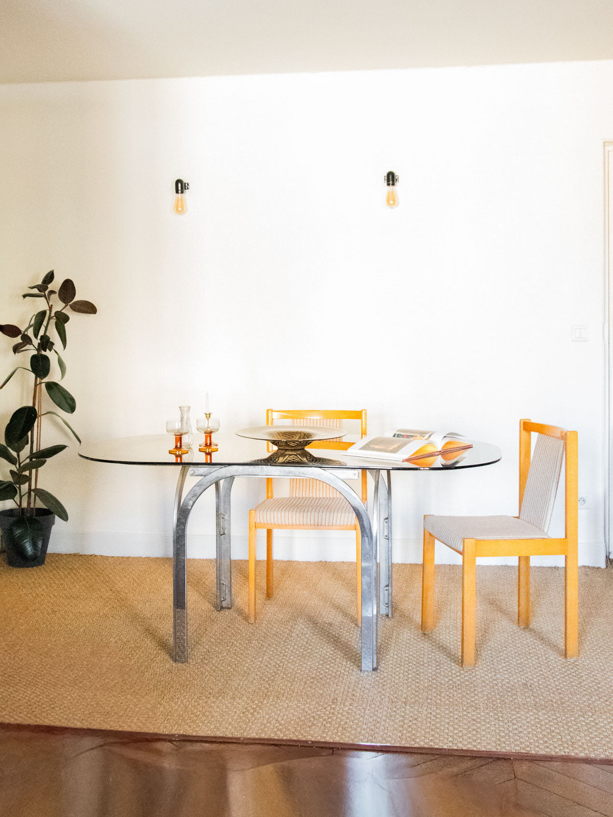 Adoptez cette table en métal chromé au plateau en verre fumé, dont l'allure contemporaine apporte une note élégante et graphique à la salle à manger ou au salon; ses proportions généreuses offrent une belle capacité d'accueil pour 4 à 6 convives et elle peut se compléter d'une rallonge pour agrandir l'espace lors des réceptions. La structure demande une réparation lorsque la rallonge est positionnée sur les pieds. Quelques marques d'usage qui font son authenticité.
