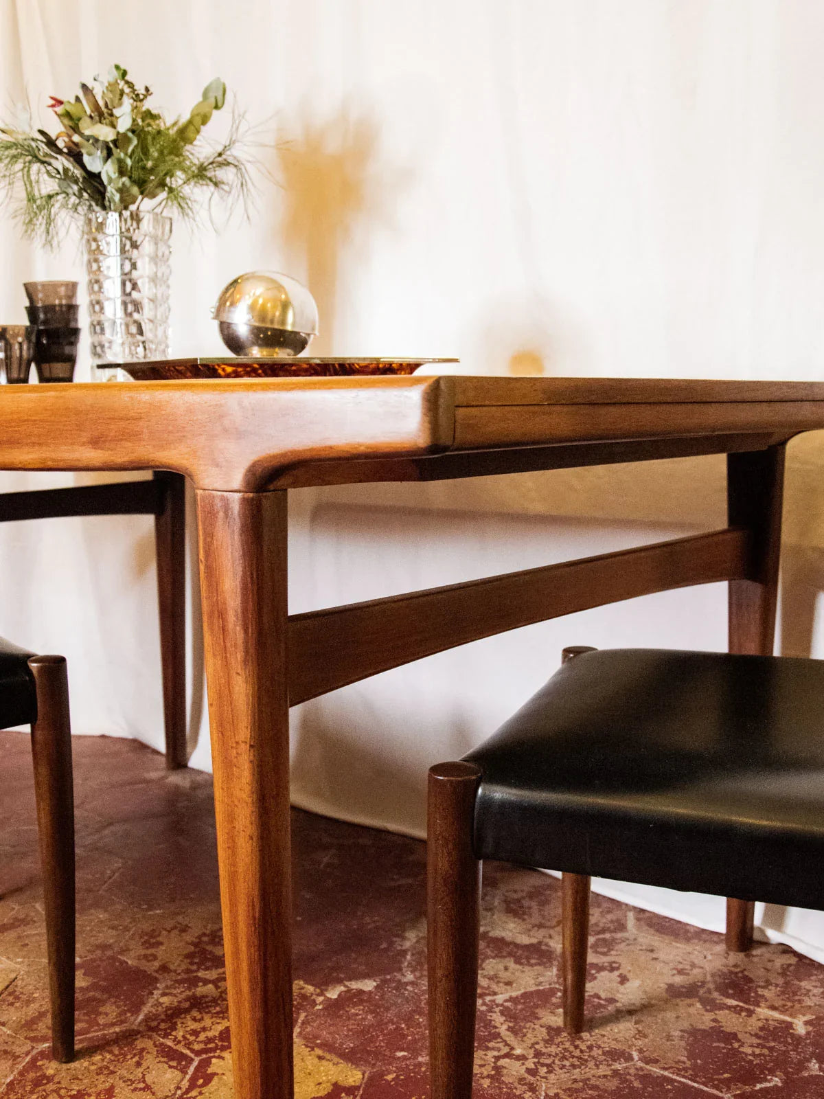 Adoptez cette table en bois massif de palissandre, pensée pour accueillir naturellement 4 à 6 convives et créer des instants conviviaux. Le plateau récemment refait révèle le veinage profond et la chaleur du bois, tandis que ses proportions équilibrées lui permettent de s'intégrer aussi bien dans une cuisine que dans une salle à manger intime. Sa robustesse invite à un usage quotidien et sa finition soigneuse assure un aspect net et durable; elle est proposée sans rallonges, en excellent état et sans aucune rayure.