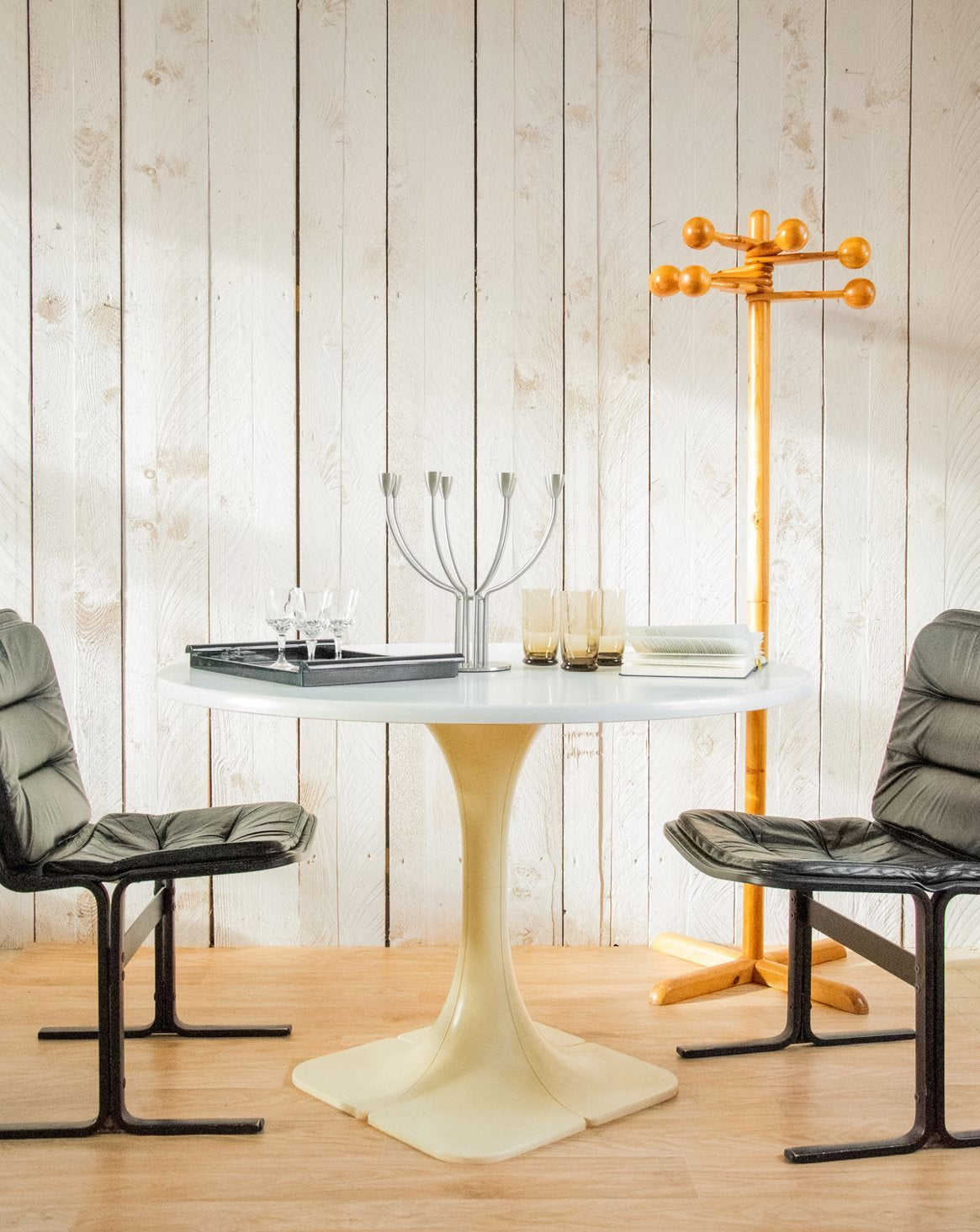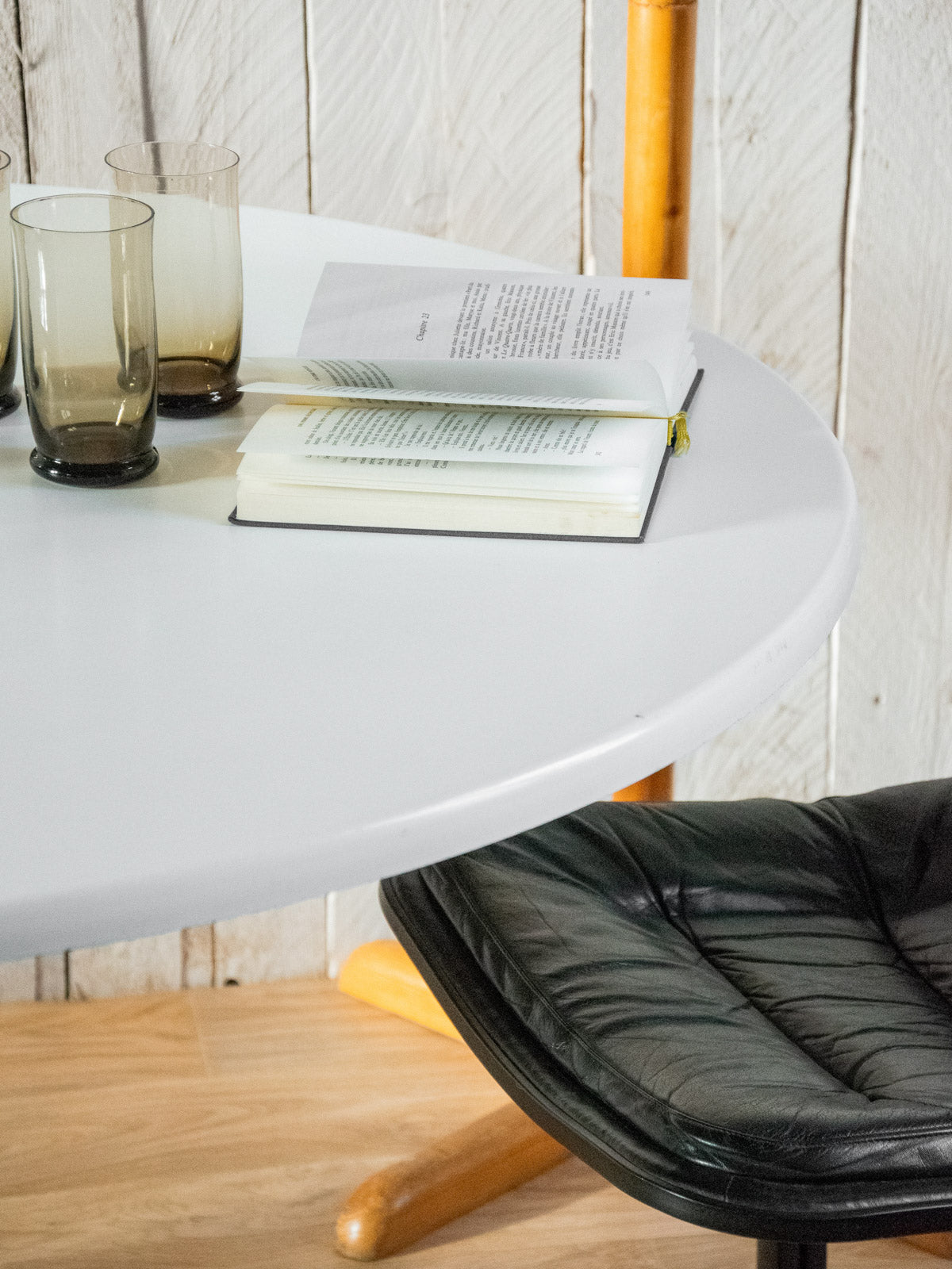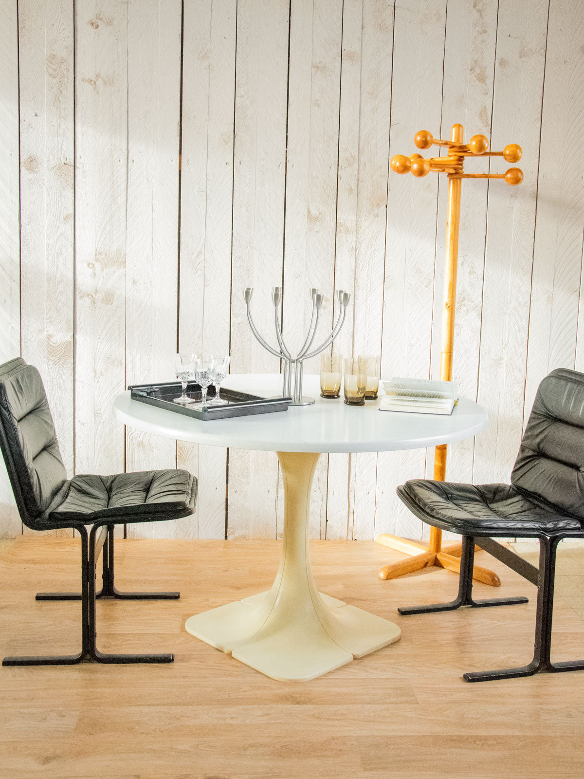 Adoptez cette table tulipe au design iconique, idéale pour recevoir 4 à 6 convives dans un esprit élégant et convivial. Sa silhouette épurée, son plateau généreux et son piètement central libèrent l'espace et favorisent une circulation fluide, tout en apportant une présence graphique et contemporaine à la pièce. La finition soignée met en valeur une allure sobre qui s'accorde aussi bien à un intérieur moderne qu'à une décoration plus douce. Deux tous petits éclats dans le plateau et très légères traces du temps, pour parfaire son charme.