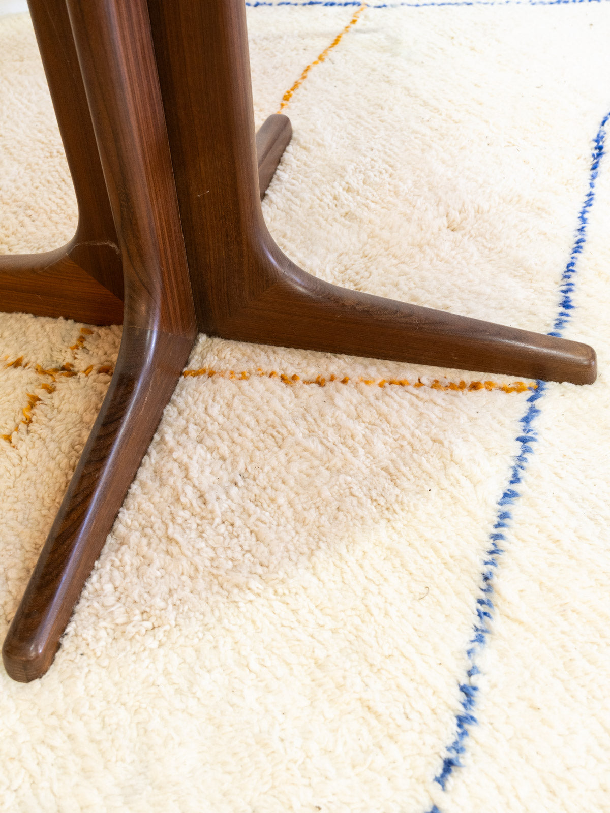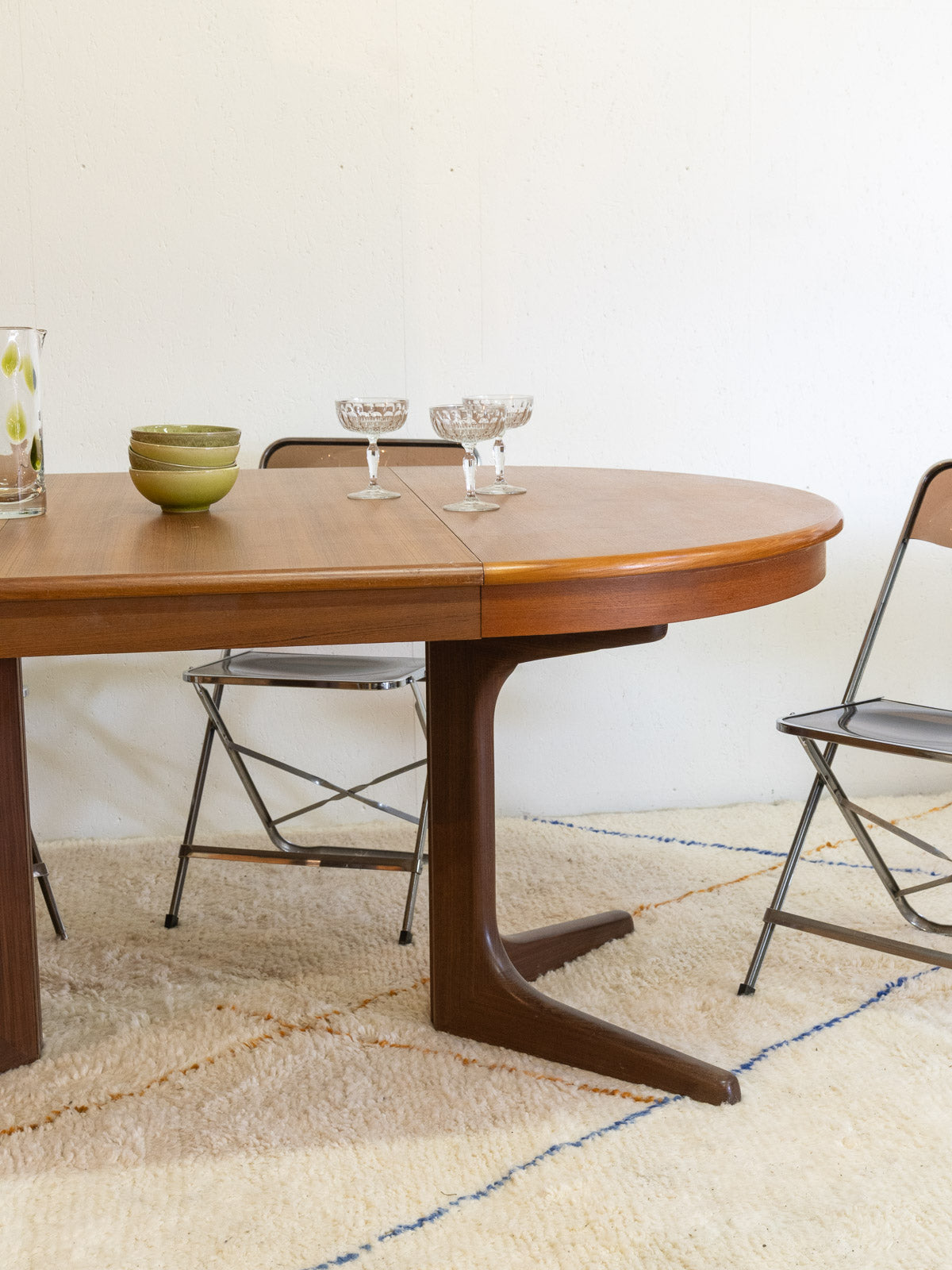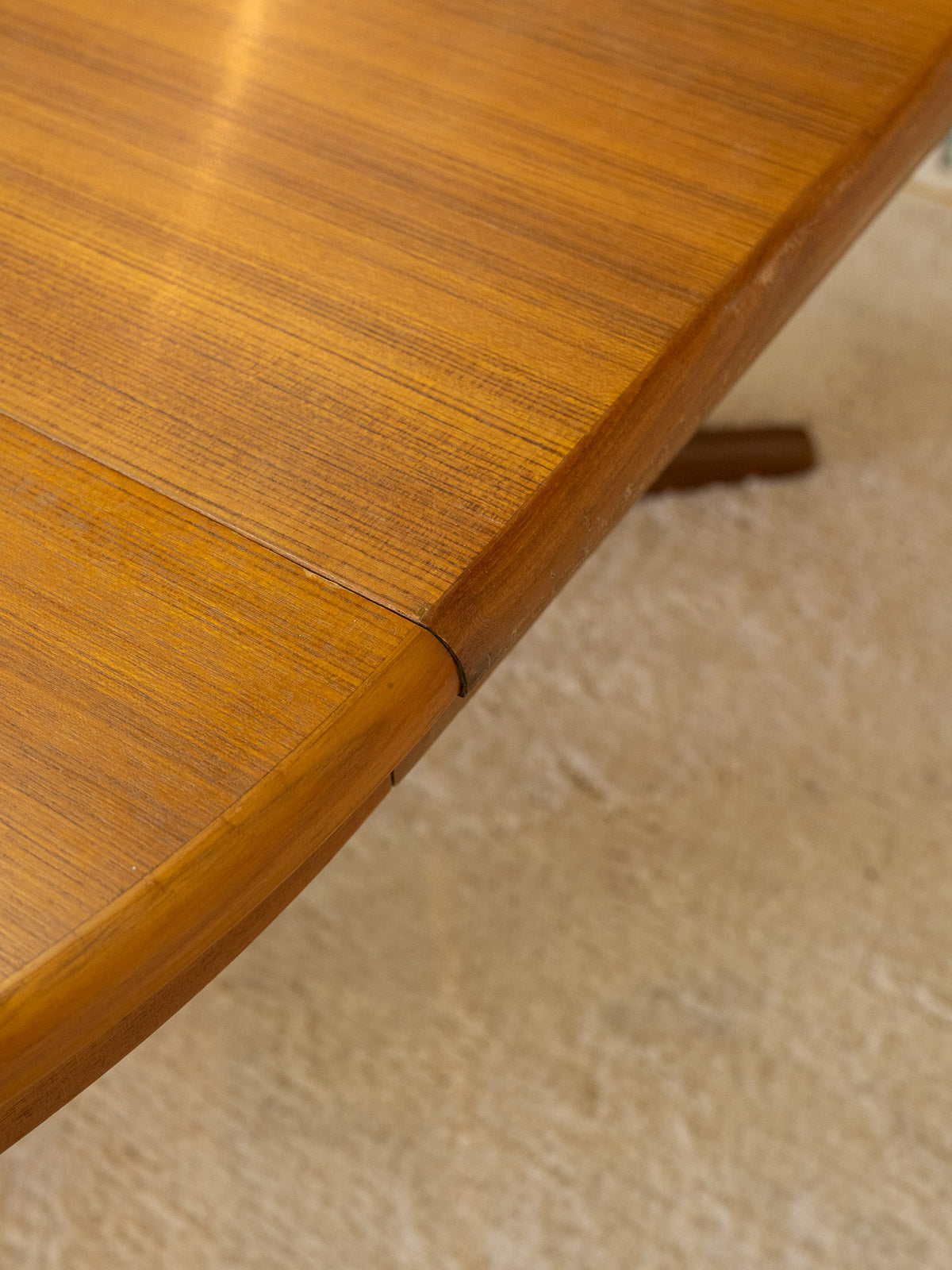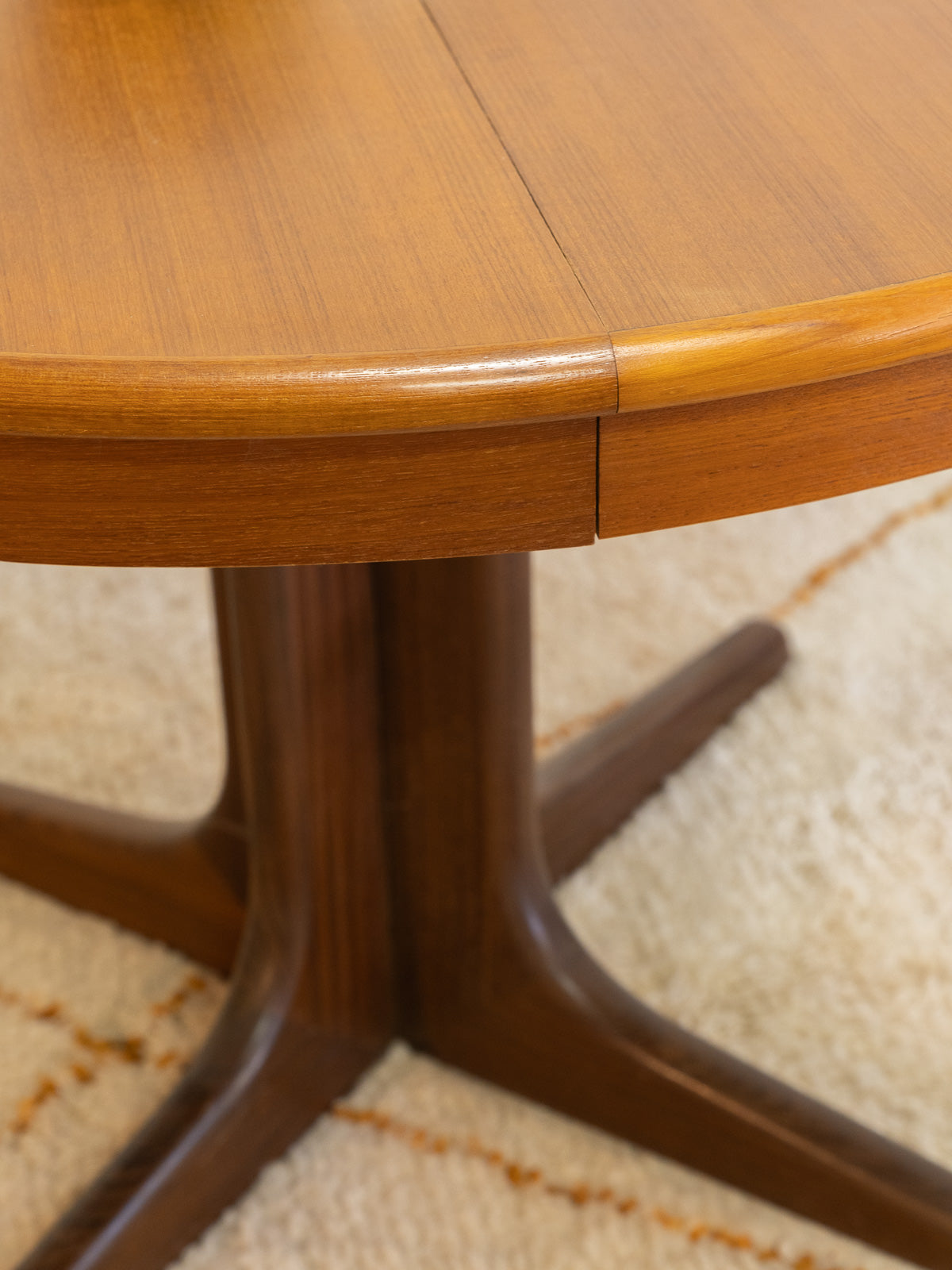 Sublimez votre salle à manger avec cette table ronde en teck attribuée à Roche Bobois, au plateau généreux capable d'accueillir 4 à 6 convives. Son design et la possibilité d'ajouter une rallonge au centre offrent une modularité idéale pour les repas quotidiens ou les dîners plus conviviaux, tandis que la patine chaleureuse et les pieds légèrement plus foncés apportent un contraste élégant. Quelques traces du temps présentes qui font son authenticité.
