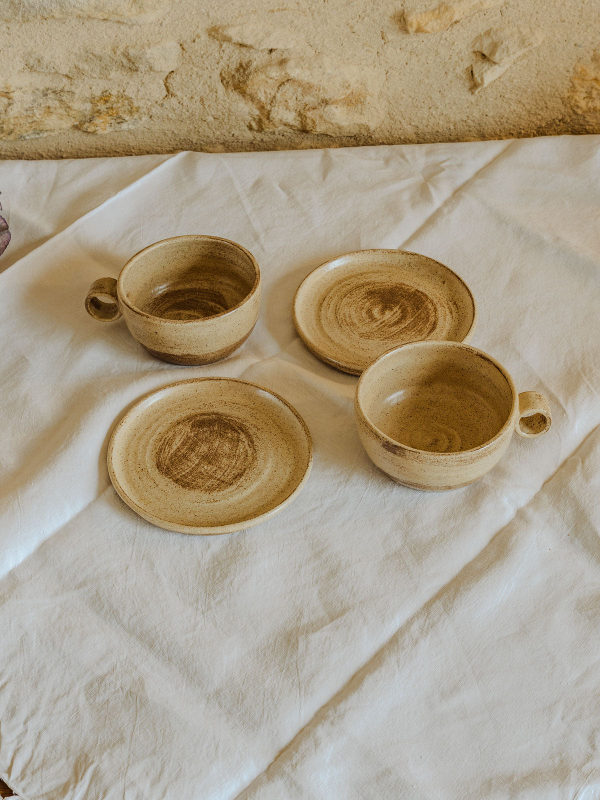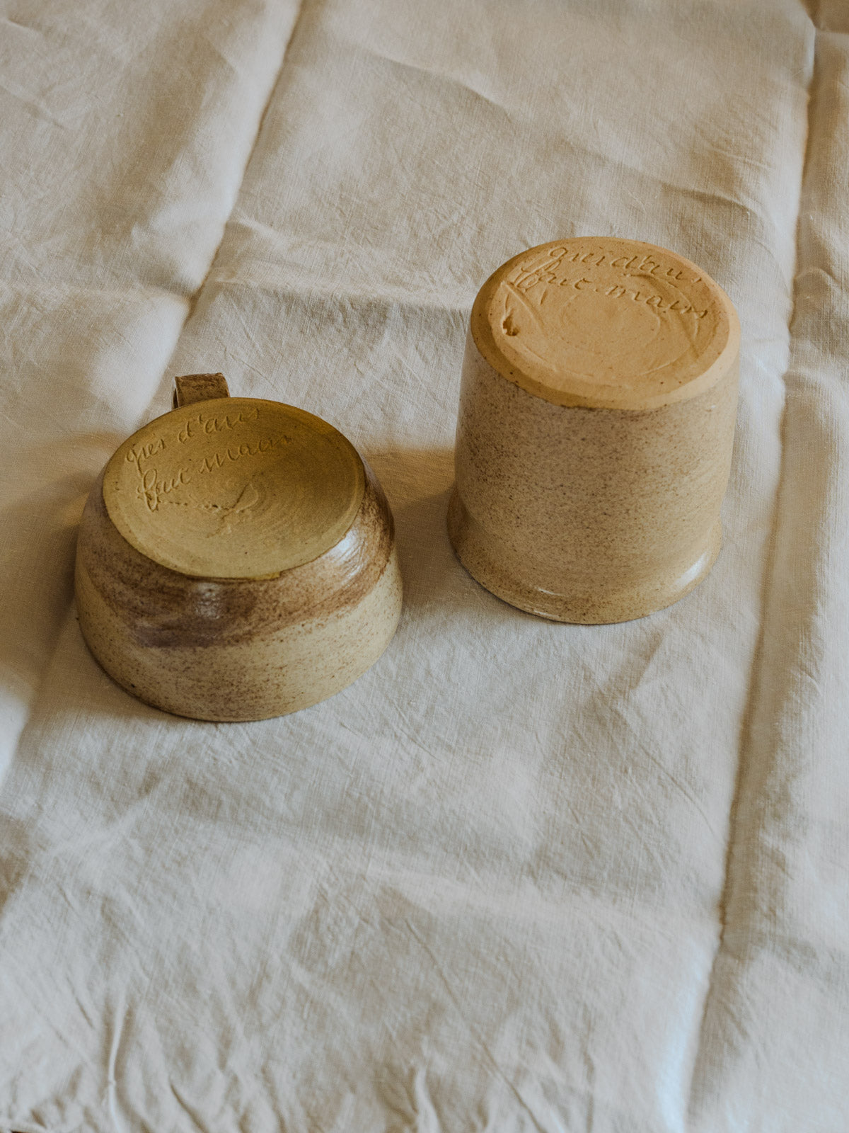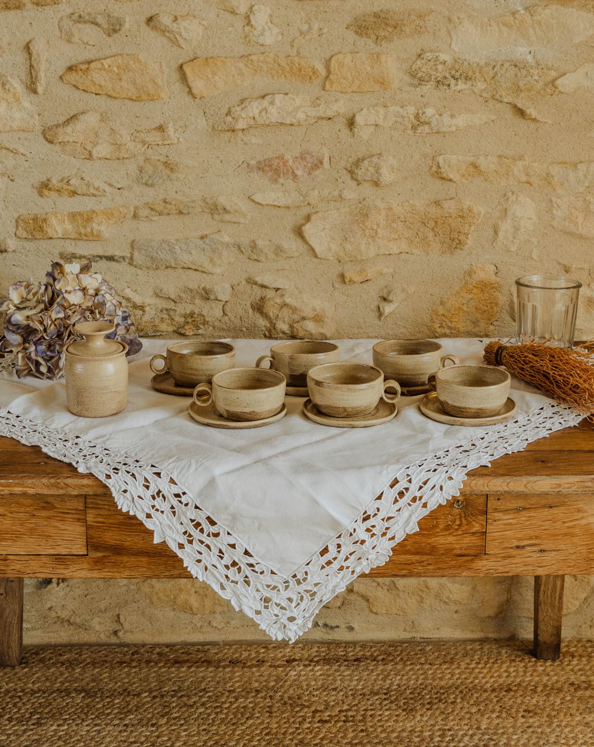 Invitez ce service à café artisanal en grès, probablement originaire de la Dordogne, composé de six tasses, six soucoupes et d'un sucrier fait main. Les formes contenues et la pâte de grès offrent une prise chaleureuse et un fini mat qui valorise chaque pause café, tandis que le format des tasses convient aux dégustations intimes et aux tables resserrées. Son style sobre et légèrement rustique crée une ambiance conviviale et authentique, idéale pour des moments partagés autour d'une boisson.