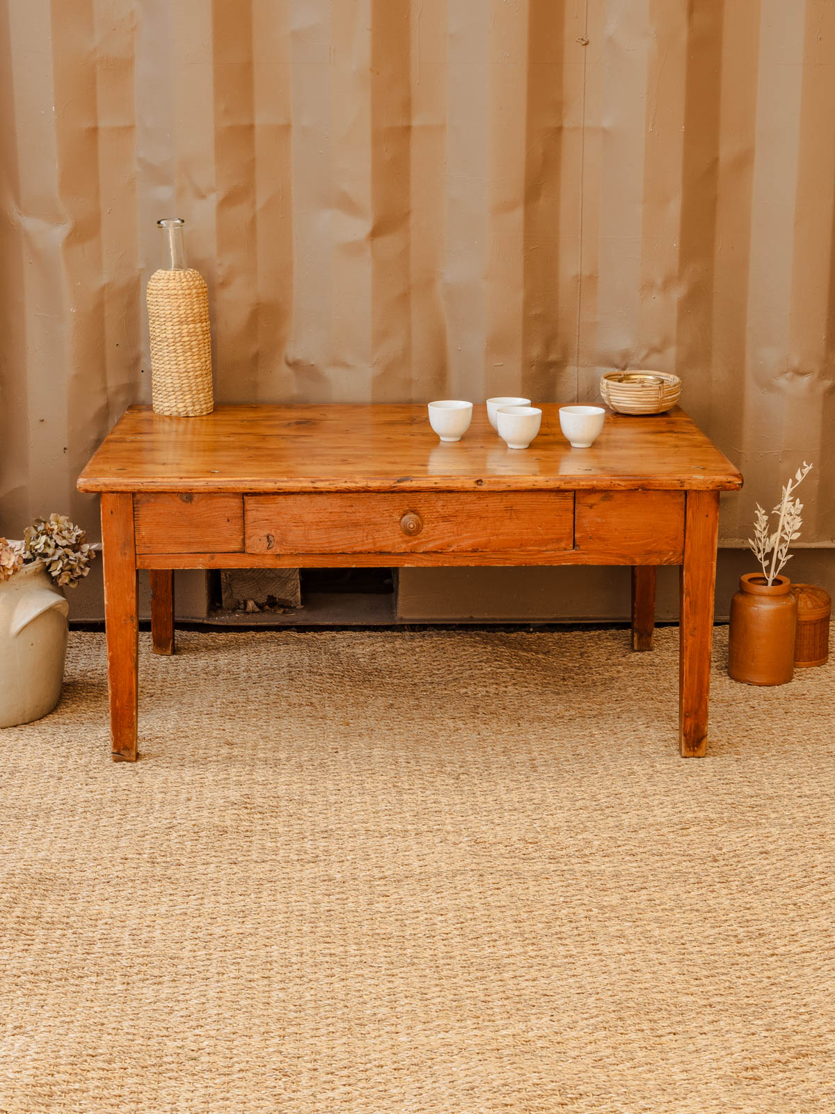 Découvrez cette table basse en pin de teinté foncé, aux lignes simples et à l'allure chaleureuse, qui impose une présence discrète dans le salon. Son plateau et ses proportions accueillent livres, plateau et objets du quotidien, tandis que son tiroir unique muni d'une poignée ronde offre un rangement pratique. La patine du bois et la teinte profonde créent une ambiance conviviale, facile à marier avec un intérieur contemporain ou rustique. Quelques traces du temps présentes qui racontent son histoire.