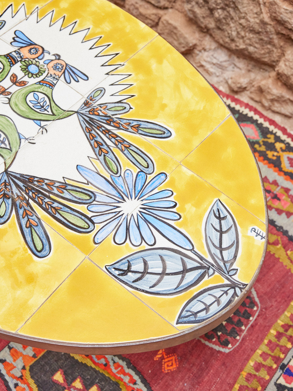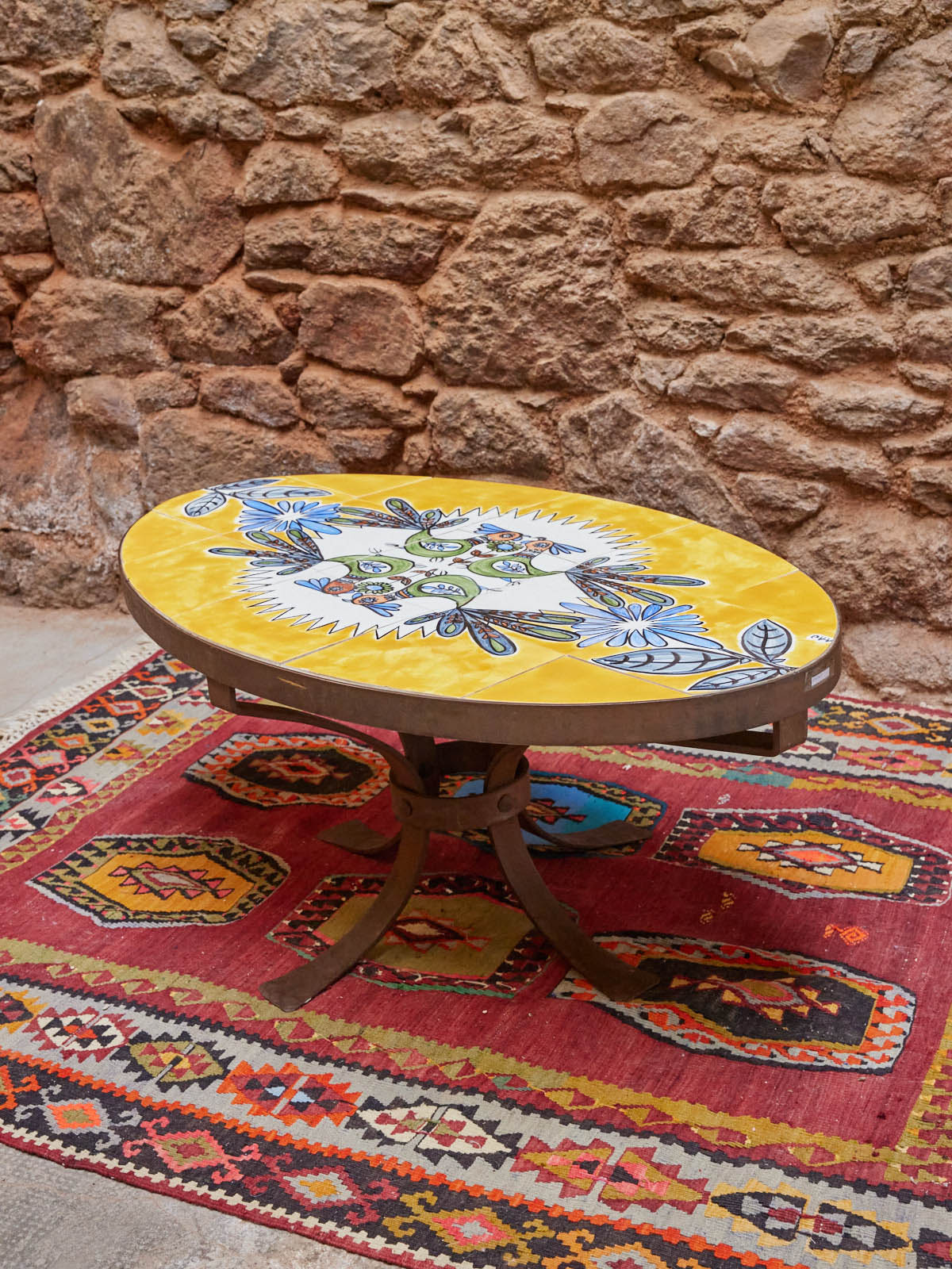 Apportez une touche de charme vintage avec cette table basse en fer forgé à la patine rouille, surmontée d'un plateau en céramique jaune orné de motifs floraux. Sa structure ajourée et ses proportions délicates en font un meuble polyvalent, idéal pour une petite terrasse, un coin repas intime ou comme table d'appoint dans un intérieur inspiré de l'artisanat. Le contraste entre le métal travaillé et la céramique invite une ambiance chaleureuse et champêtre, parfaite pour les moments conviviaux.