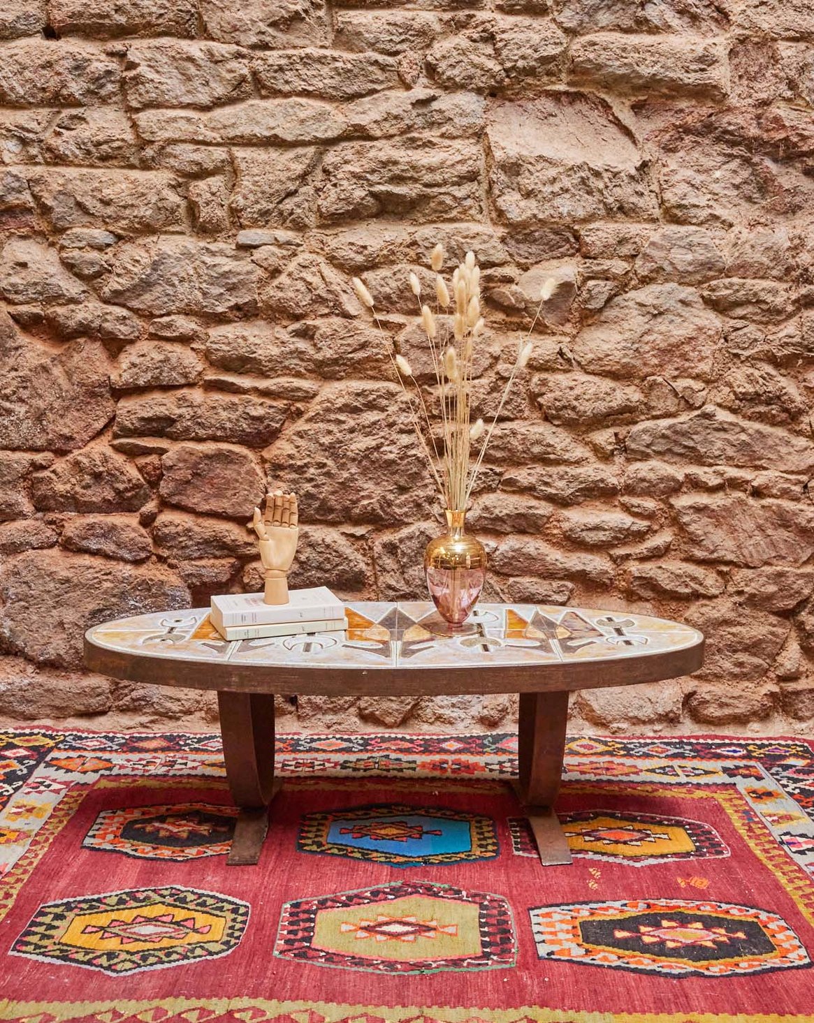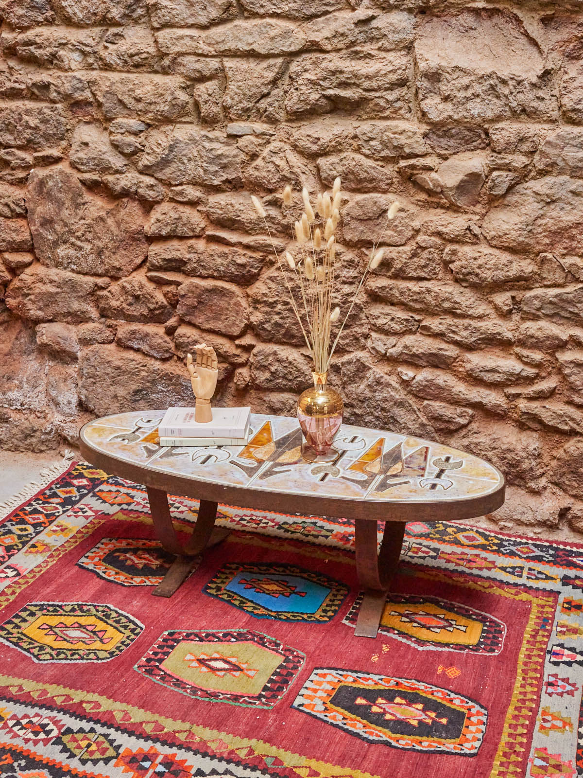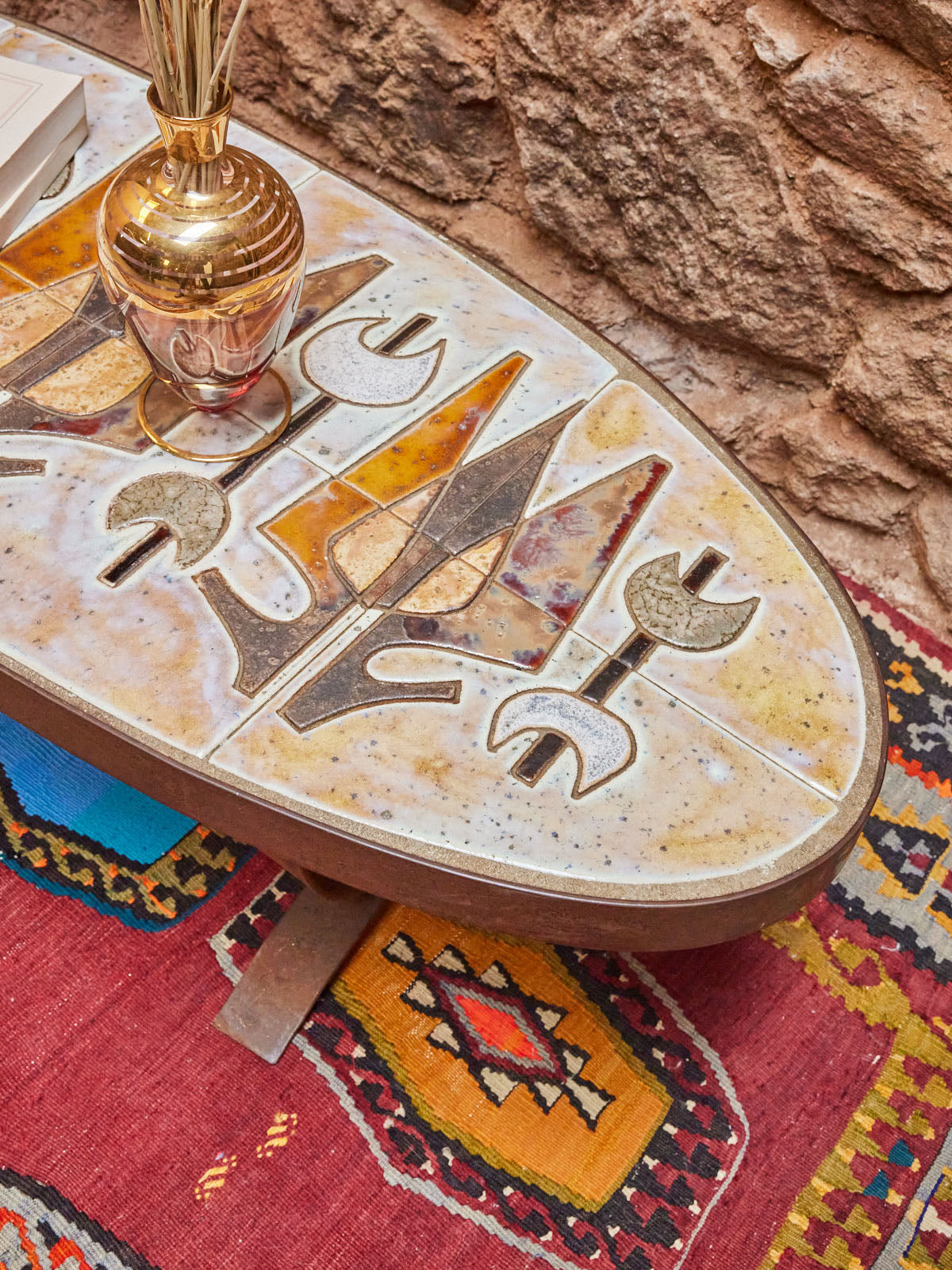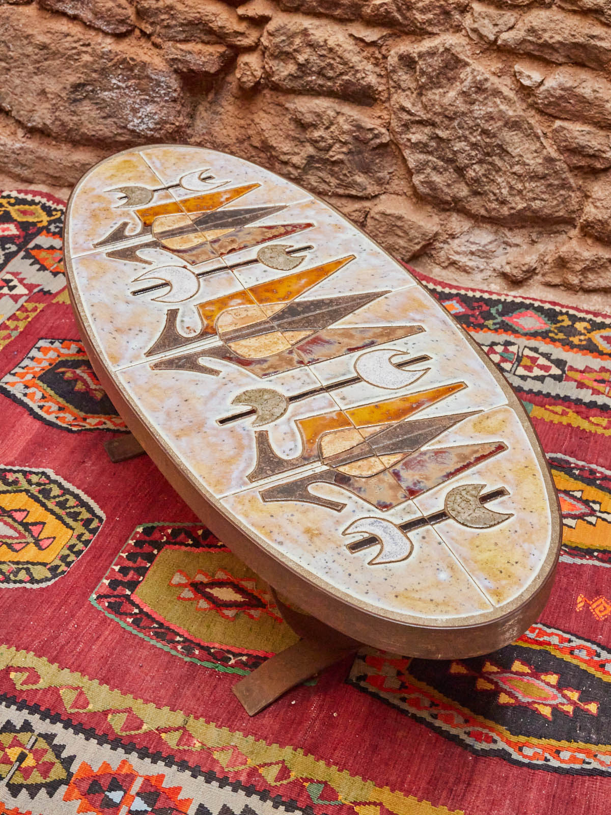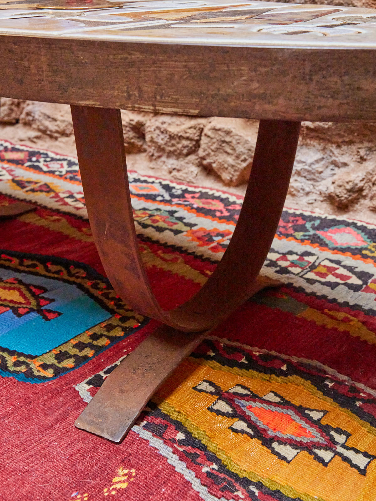 Adoptez cette table basse ovale en céramique signée Raymond Corroyez, posée sur un piètement en fer forgé à la patine rouille. Sa surface lisse dialogue avec la robustesse du métal, offrant un plateau idéal pour livres, objets décoratifs et moments partagés. Le contraste entre la délicatesse de la céramique et le caractère industriel du fer apporte une présence à la fois élégante et chaleureuse au salon. Légères traces du temps présentes.