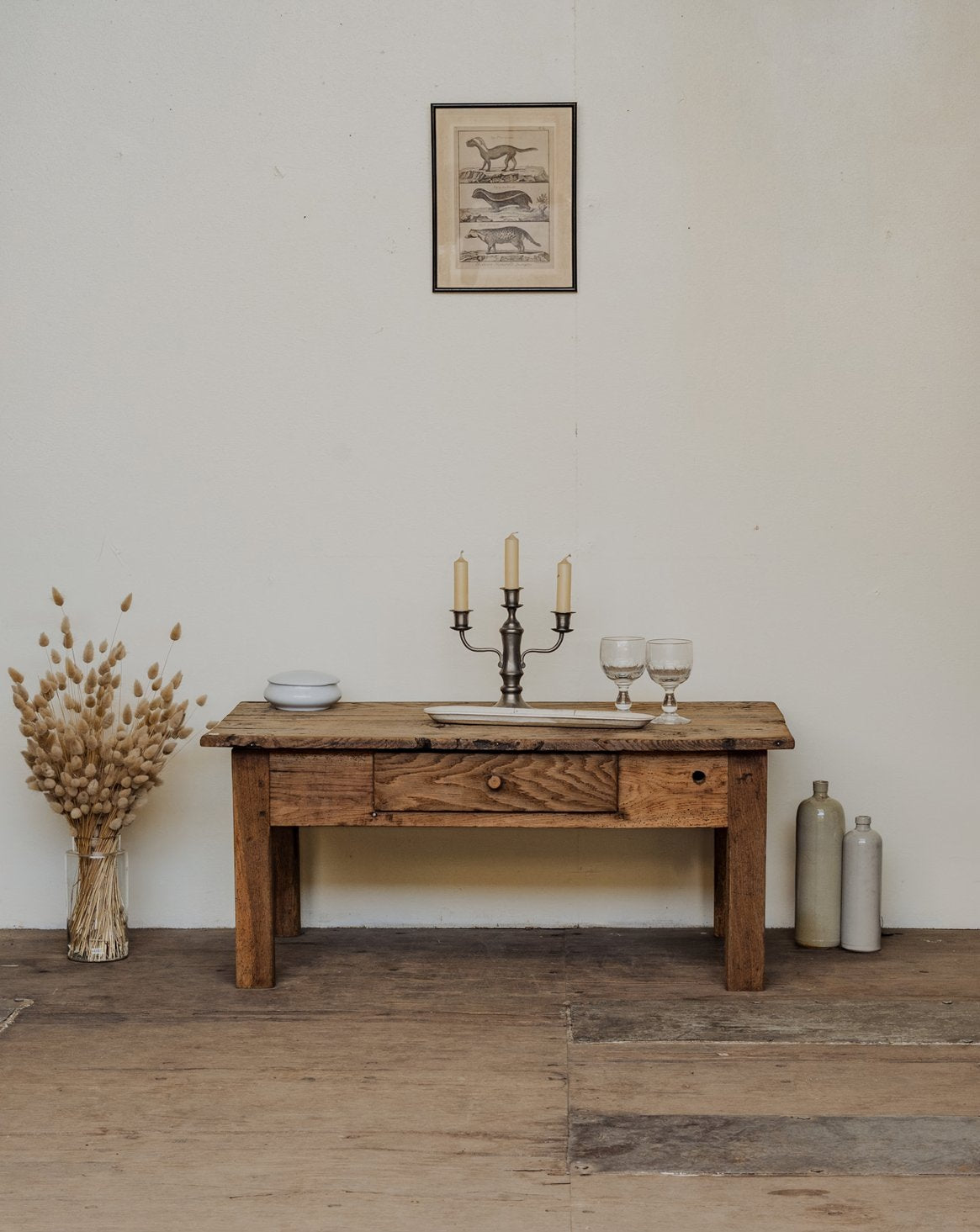 Ajoutez une touche chaleureuse à votre salon avec cette table basse en noyer, dotée d'un tiroir discret pour ranger télécommandes et magazines. Le bois révèle des nuances claires et foncées qui lui donnent un caractère naturel et raffiné. Ses proportions permettent d'accueillir tasses, livres et objets décoratifs tout en conservant une silhouette légère, et son design sobre s'accorde aussi bien aux intérieurs contemporains qu'aux ambiances plus classiques. Quelques marques d'usage qui font son authenticité.