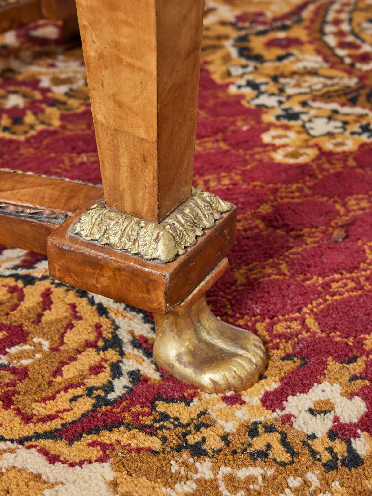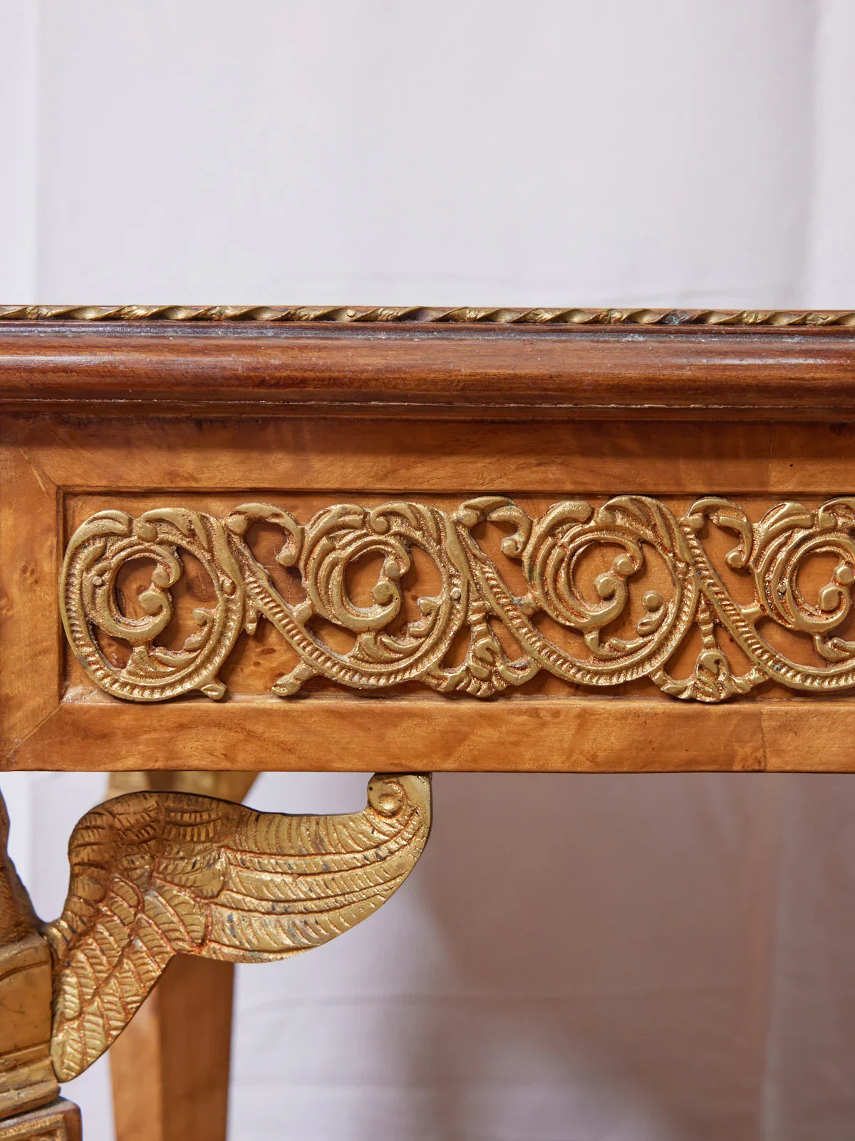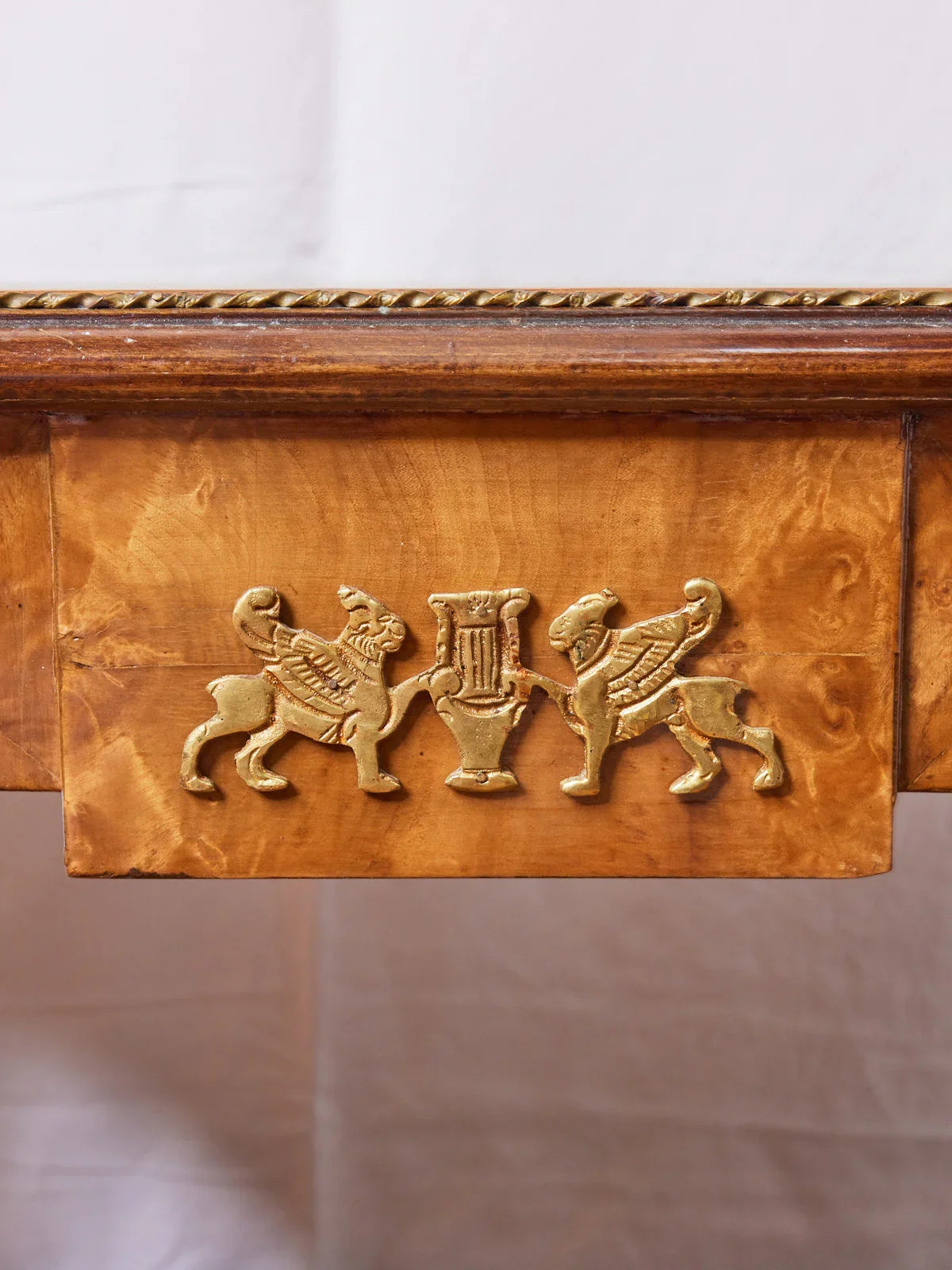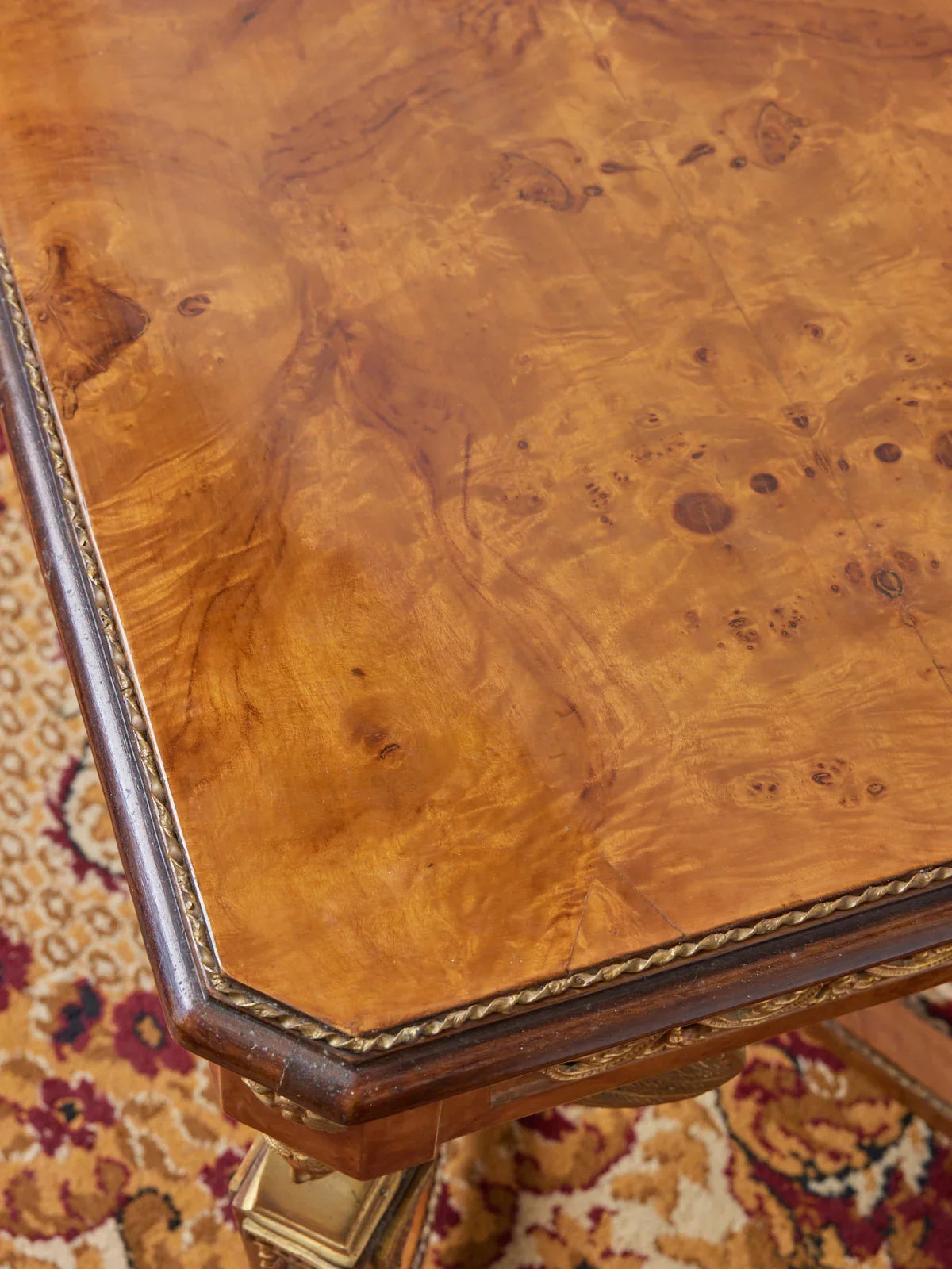 Sublimez votre salon avec cette table basse de style Empire en loupe d'orme, rehaussée de raffinés détails en laiton, son veinage graphique et son plateau au format équilibré mettent en valeur livres et objets décoratifs tout en structurant l'espace autour du canapé. Le contraste bois-chaud et métal apporte une élégance sobre et une présence apaisante, parfaite pour une ambiance intimiste ou conviviale. Adaptée aux usages quotidiens, elle conserve une belle allure d'origine.