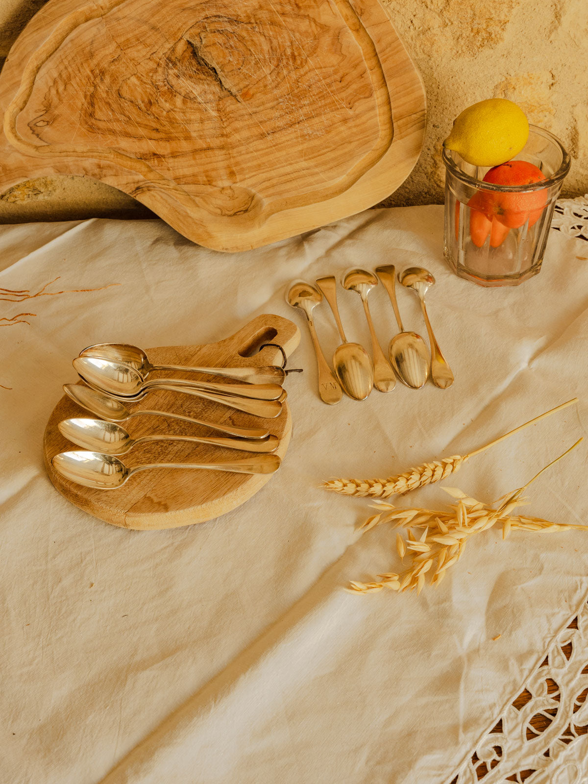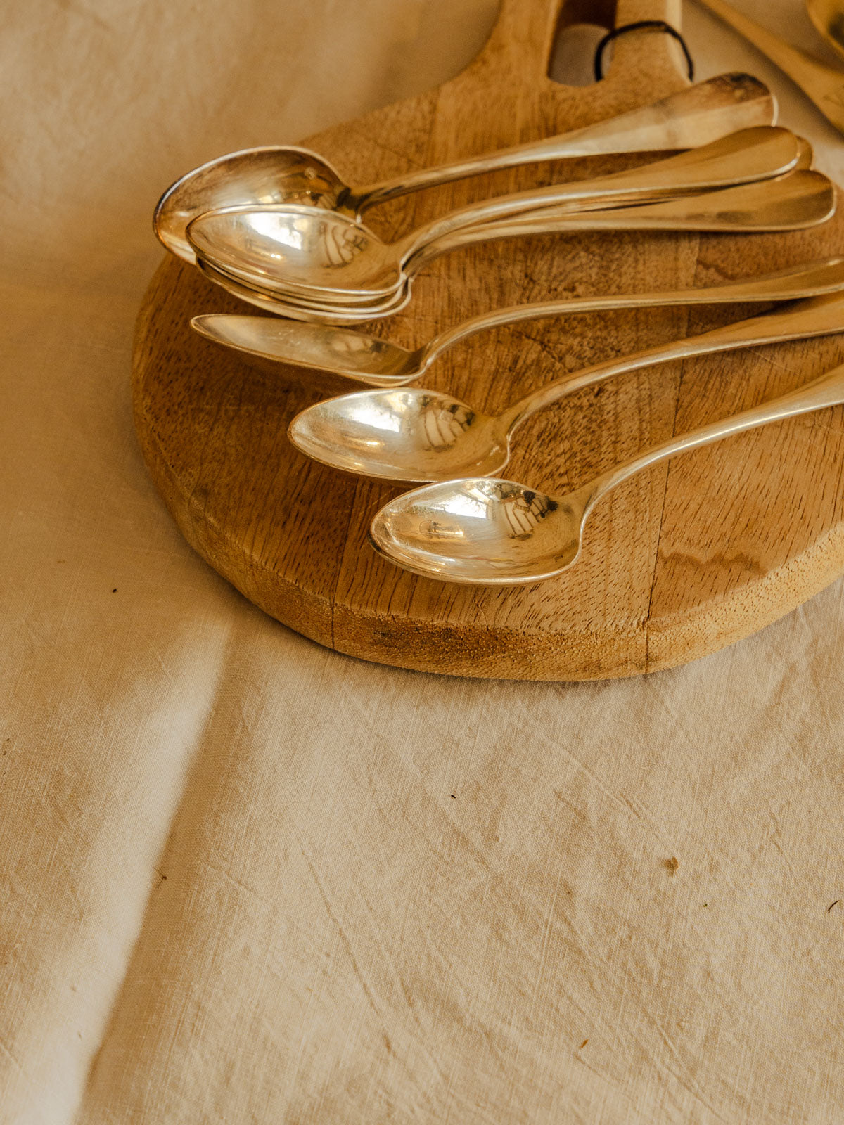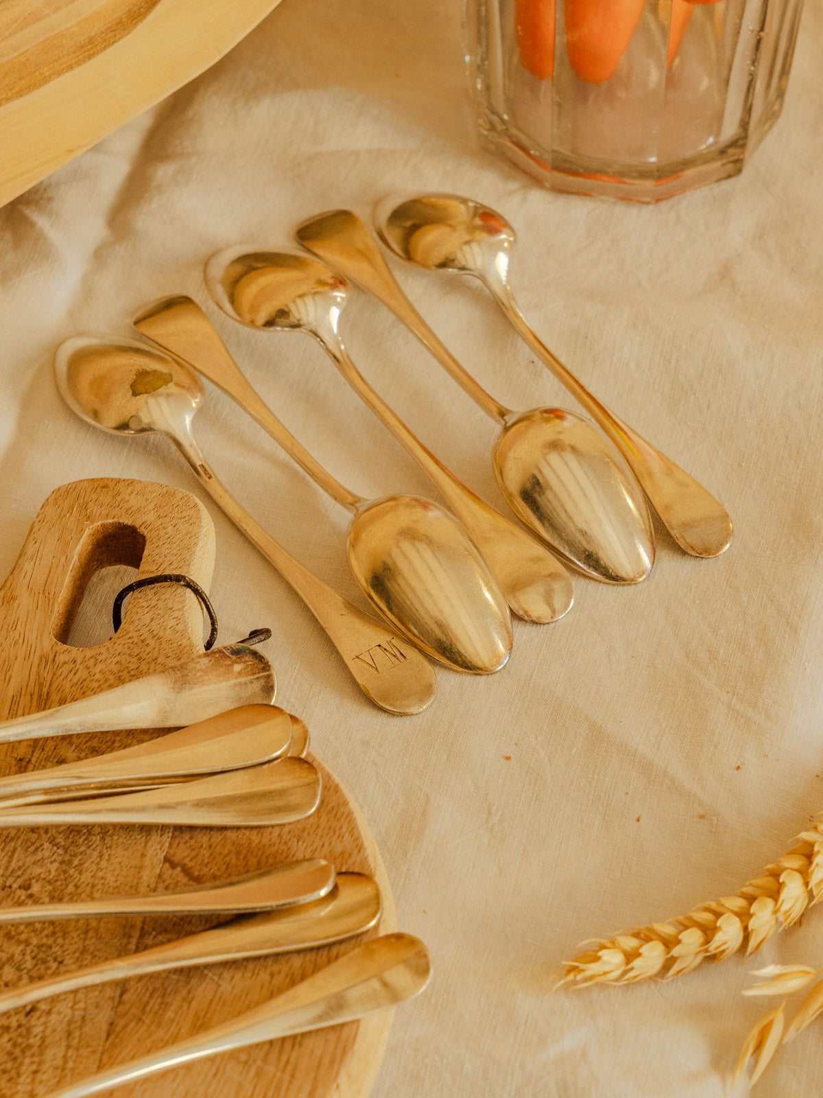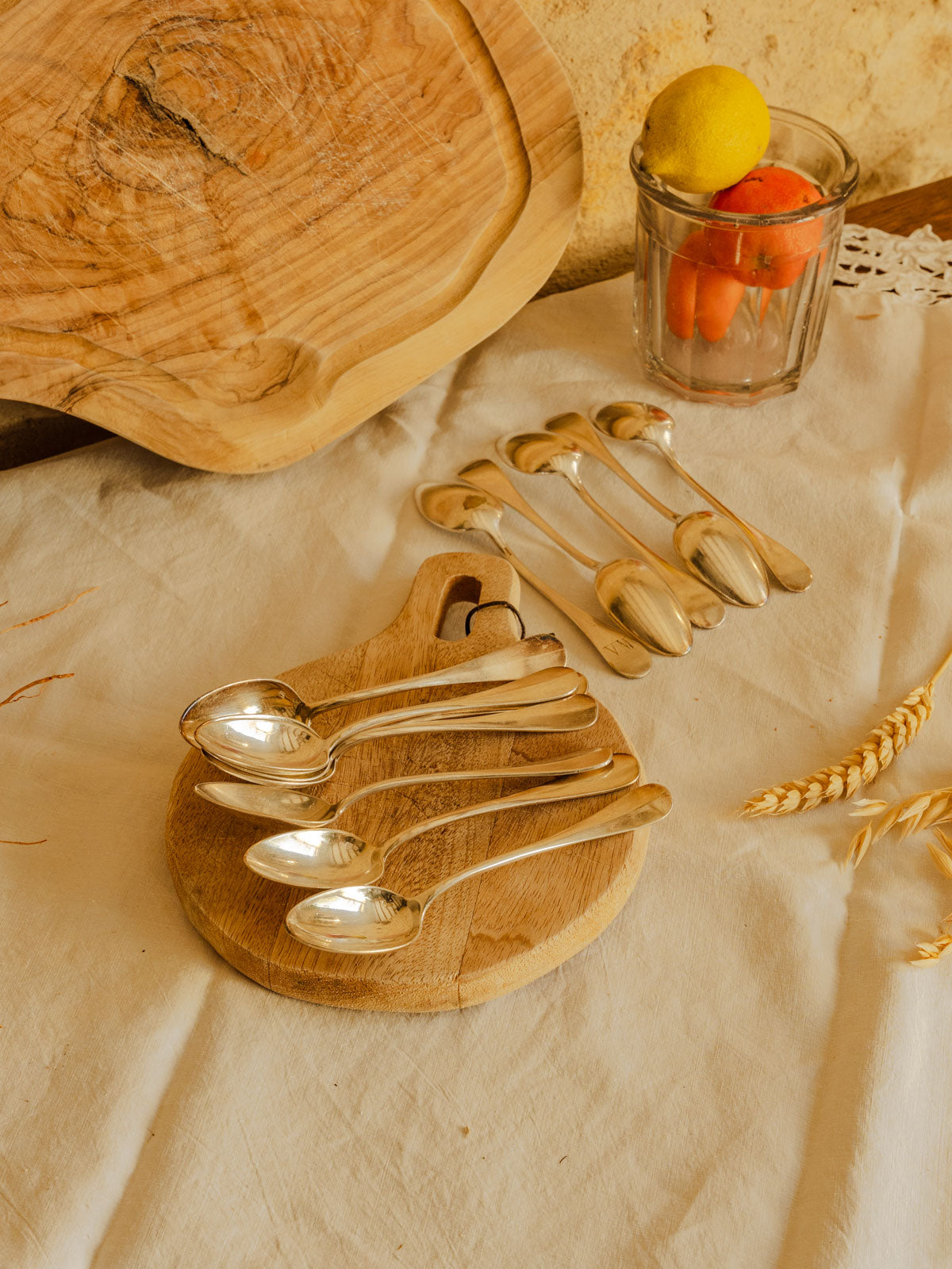 Apportez un charme rétro à votre table avec ce lot de 12 cuillères à café en argent, estampillées "18g", au dessin sobre et élégant typique d'une époque révolue. Leur format délicat et leurs proportions fines les rendent idéales pour le service du café, les goûters et les moments conviviaux, tandis que le métal patiné apporte une chaleur discrète à votre vaisselle. Une des cuillères est gravée V.M., accentuant le caractère singulier de l'ensemble.