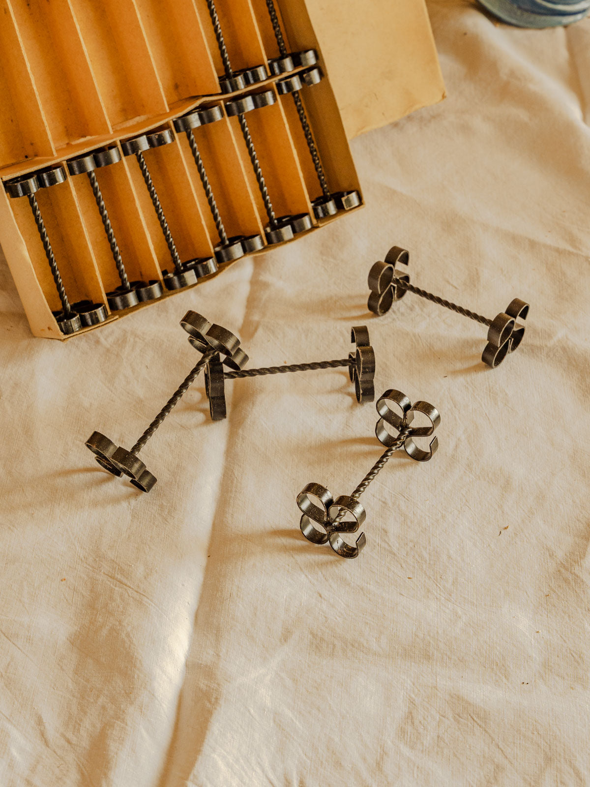 Adoptez cet ensemble de douze porte-couteaux en fer forgé des années 50, au charme artisanal et à la silhouette délicate. Leur métal apporte une note authentique et structurée à la présentation de table, idéale pour dresser une table conviviale ou compléter une vaisselle rétro. Leur format compact permet une utilisation quotidienne comme un détail décoratif qui souligne une atmosphère chaleureuse et graphique.