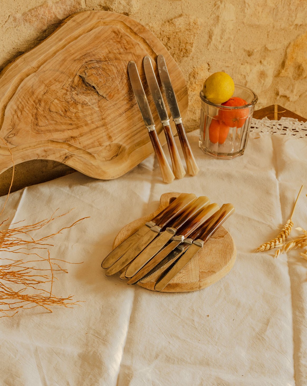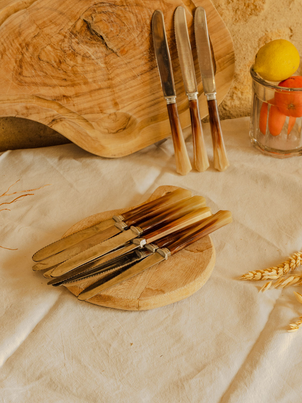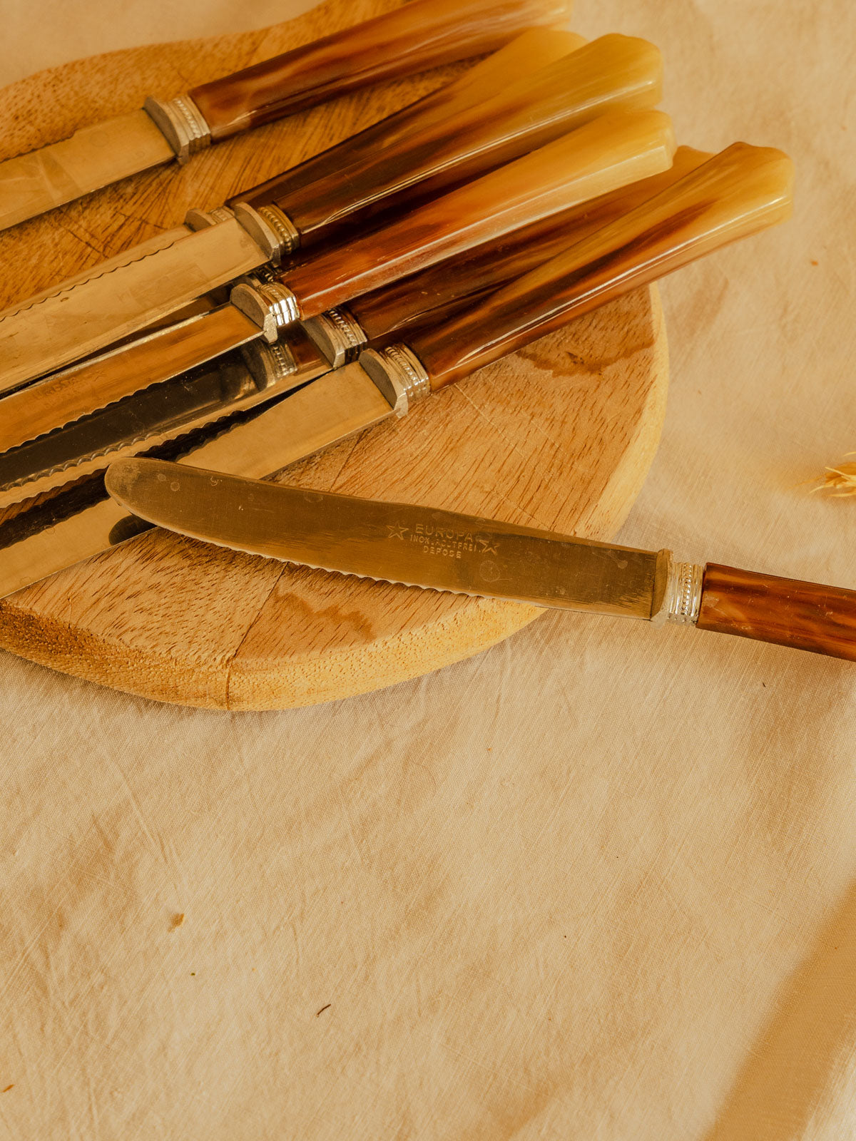 Offrez un service vintage de 12 couteaux au charme rétro, mêlant lames en inox à des manches en bakélite et gardes en métal argenté. Leur équilibre et leurs proportions en font des alliés discrets pour dresser une table d'inspiration mi-siècle ou apporter une touche d'élégance aux repas quotidiens. Solides et faciles d'entretien, ils conviennent à un usage familial ou à la présentation lors de dîners. Leur patine naturelle témoigne du vécu et renforce leur caractère.