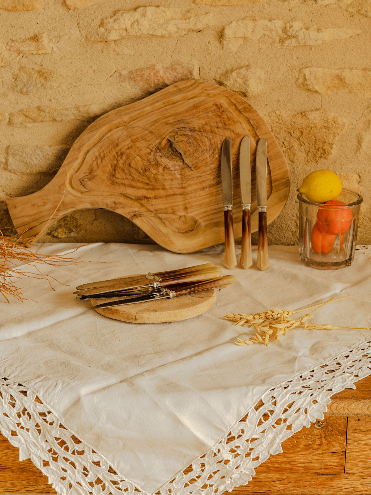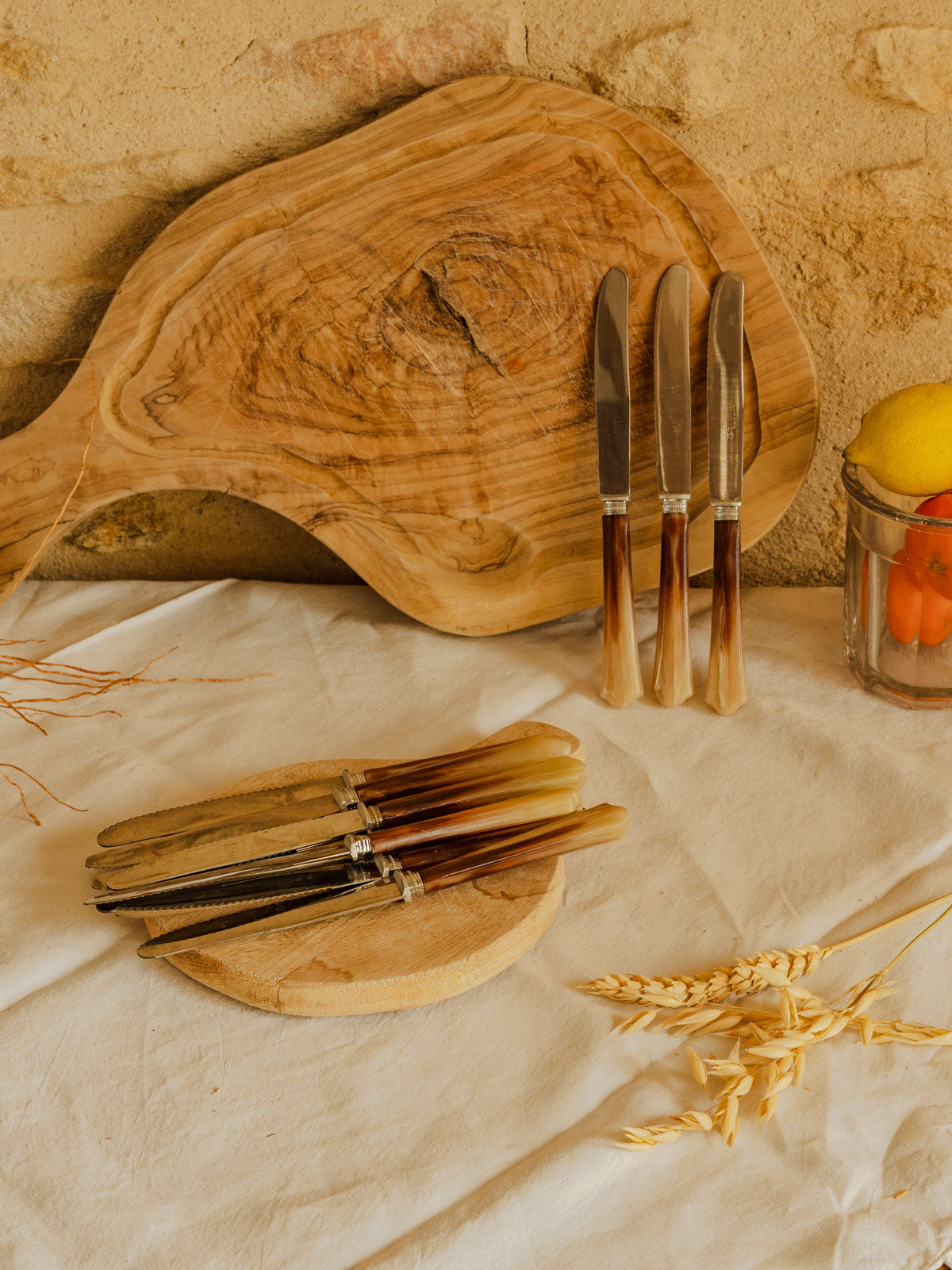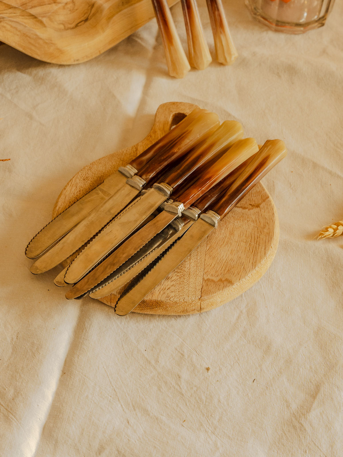 Offrez un service vintage de 12 couteaux au charme rétro, mêlant lames en inox à des manches en bakélite et gardes en métal argenté. Leur équilibre et leurs proportions en font des alliés discrets pour dresser une table d'inspiration mi-siècle ou apporter une touche d'élégance aux repas quotidiens. Solides et faciles d'entretien, ils conviennent à un usage familial ou à la présentation lors de dîners. Leur patine naturelle témoigne du vécu et renforce leur caractère.
