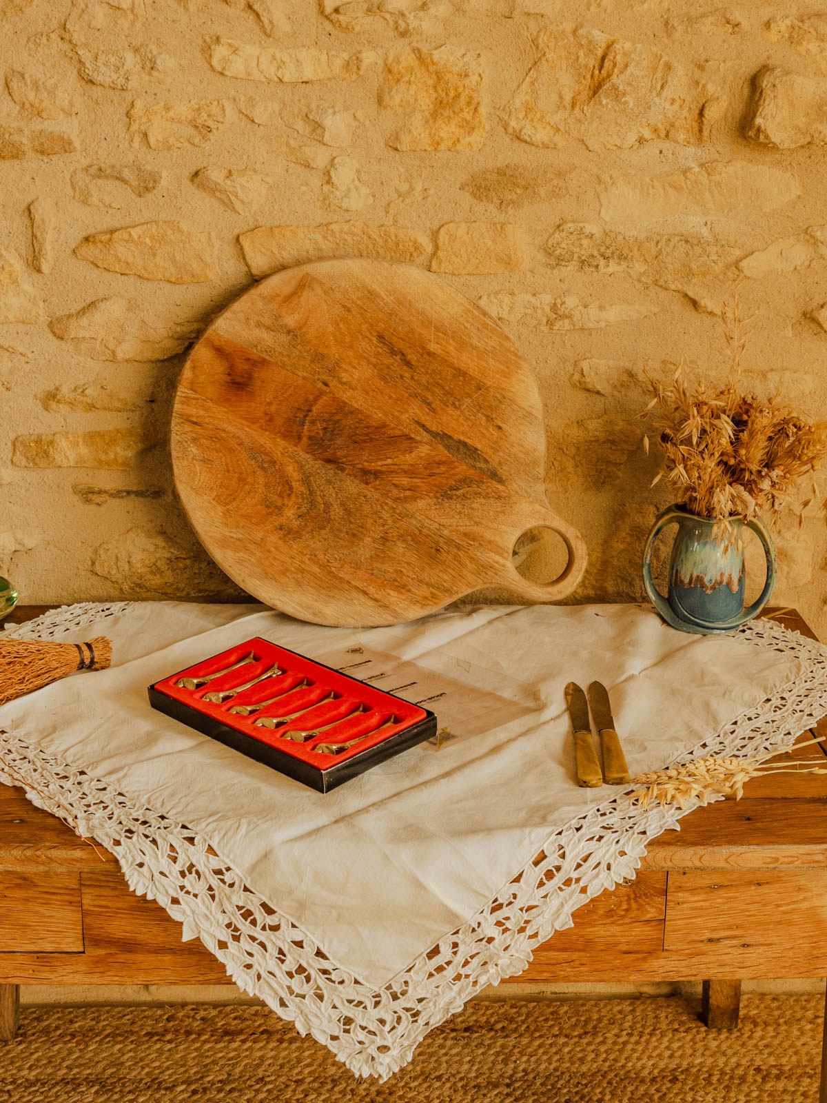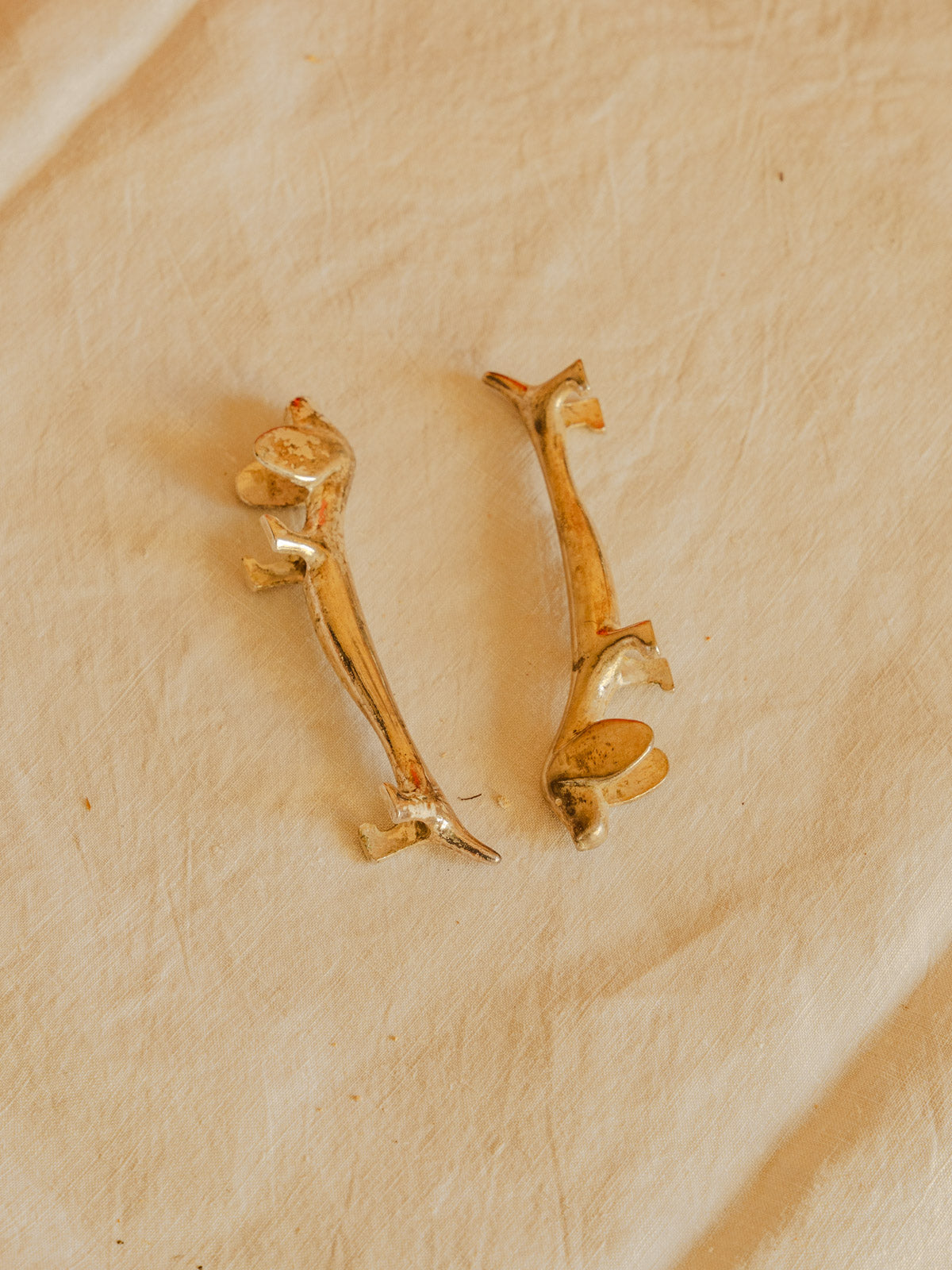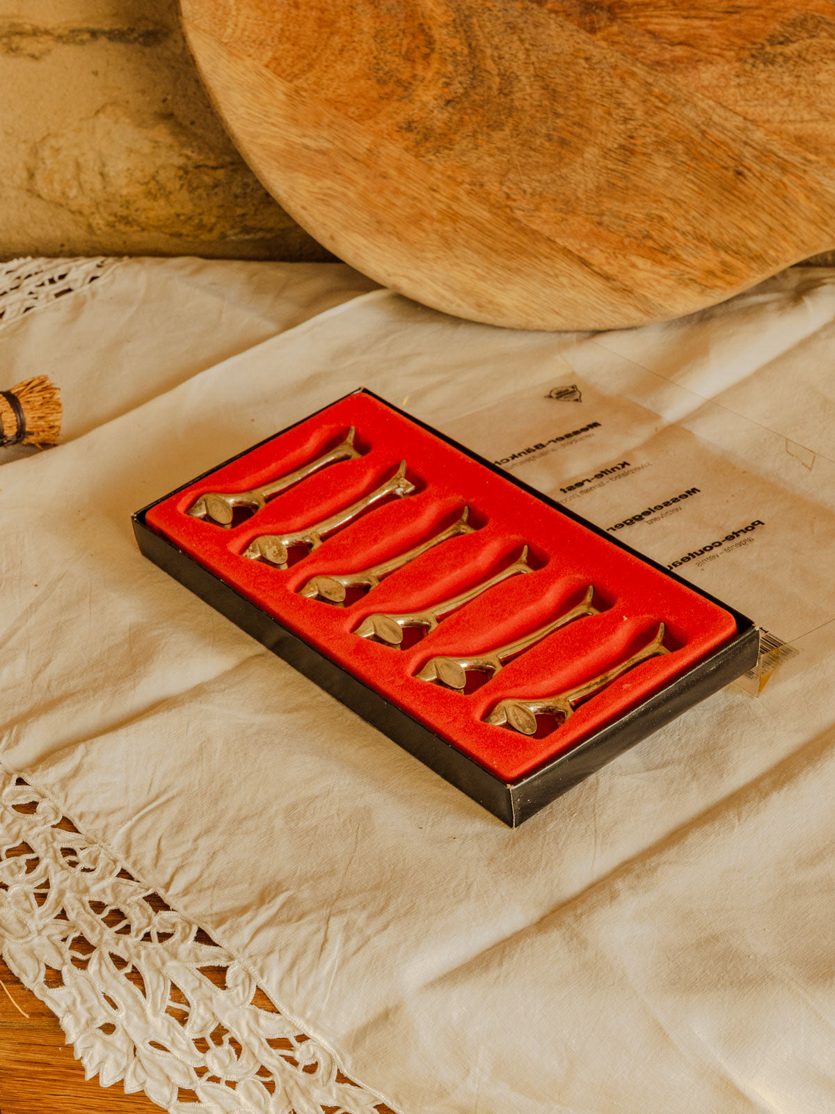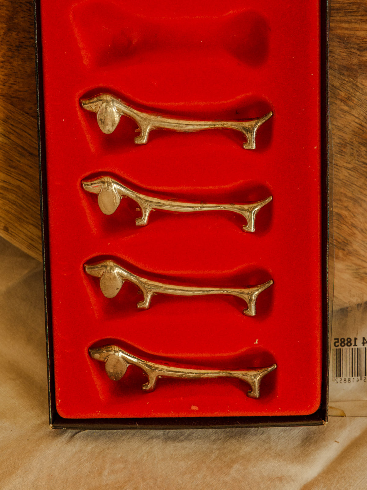 Adoptez ce lot vintage de six porte-couteaux en métal argenté, délicatement sculptés en forme de teckel. Leur petit gabarit les rend parfaits pour rythmer une table de dîner, prolonger un service apéritif ou compléter un présent raffiné, tandis que le métal évoque une élégance discrète et ludique. Ils apportent une touche de caractère et de convivialité à vos repas, tout en restant suffisamment compacts pour se glisser dans un tiroir ou une vitrine.