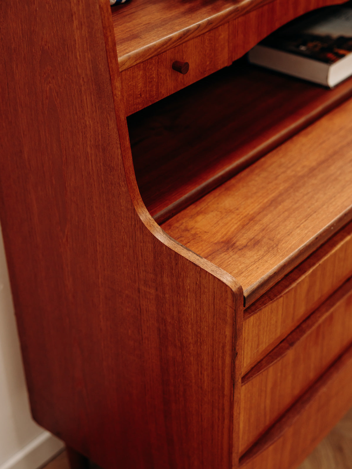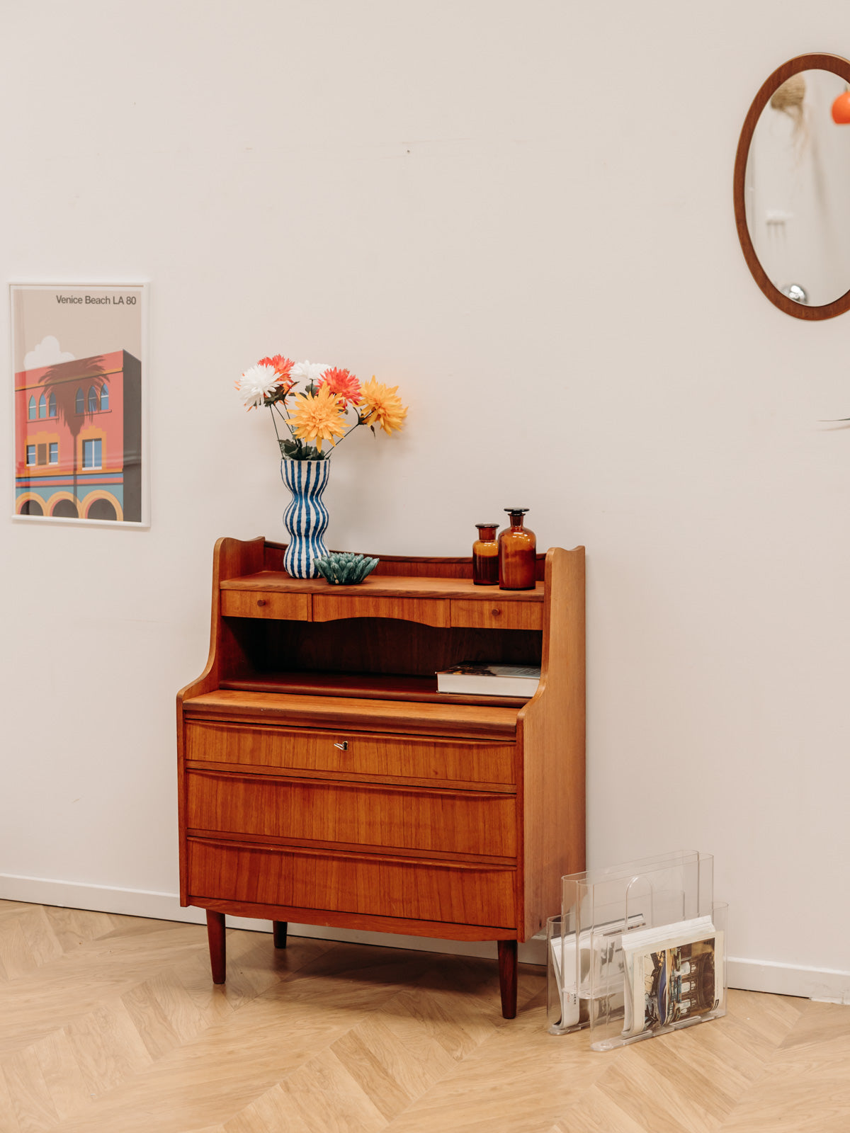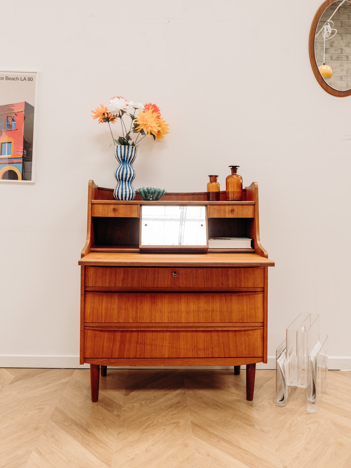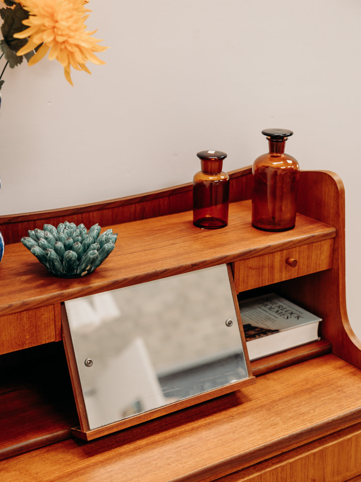 Découvrez cette coiffeuse en bois au design scandinave, idéale pour un intérieur lumineux et épuré. Le miroir intégré repliable et le plateau déroulant optimisent l'espace au quotidien, tandis que trois tiroirs et deux rangements latéraux près du miroir accueillent maquillage et accessoires. La planche supérieure offre une surface dédiée pour exposer flacons et essentiels du rituel beauté, dans un format compact adapté à chambre ou dressing. Lignes sobres et chaleur du bois pour une présence discrète et inspirante.