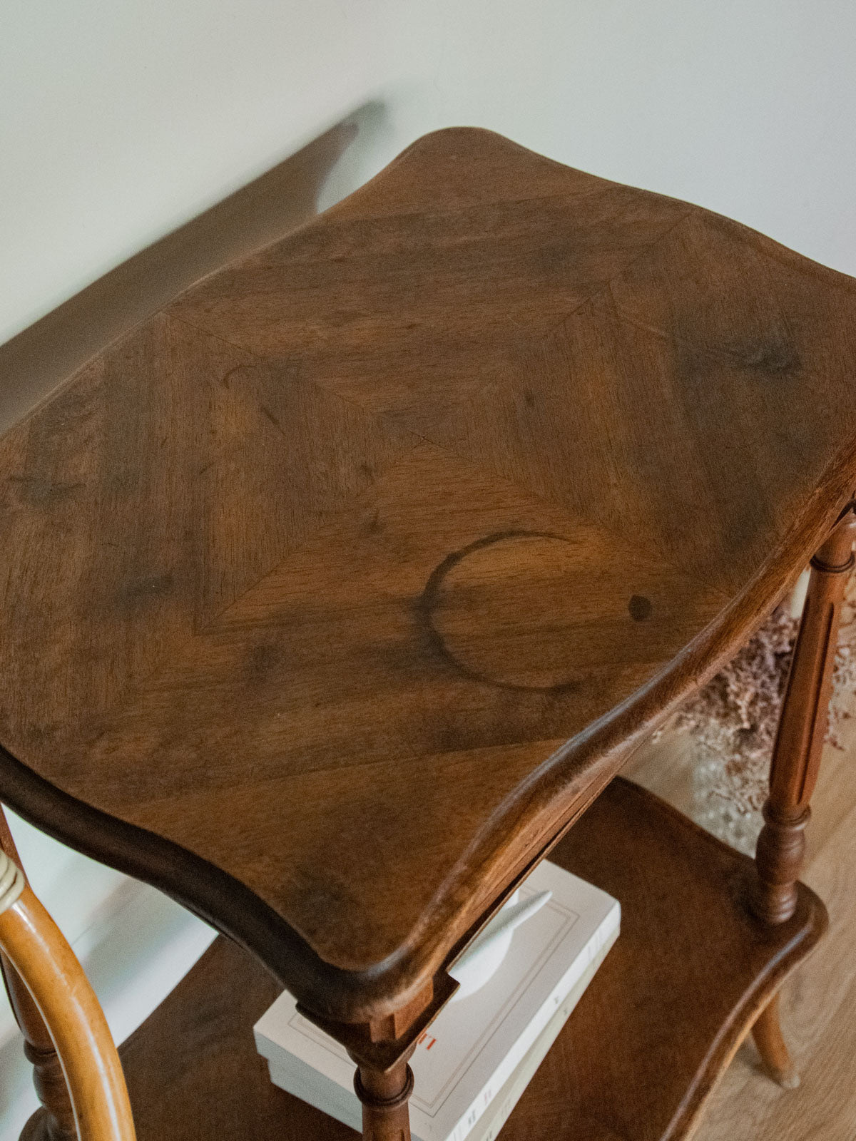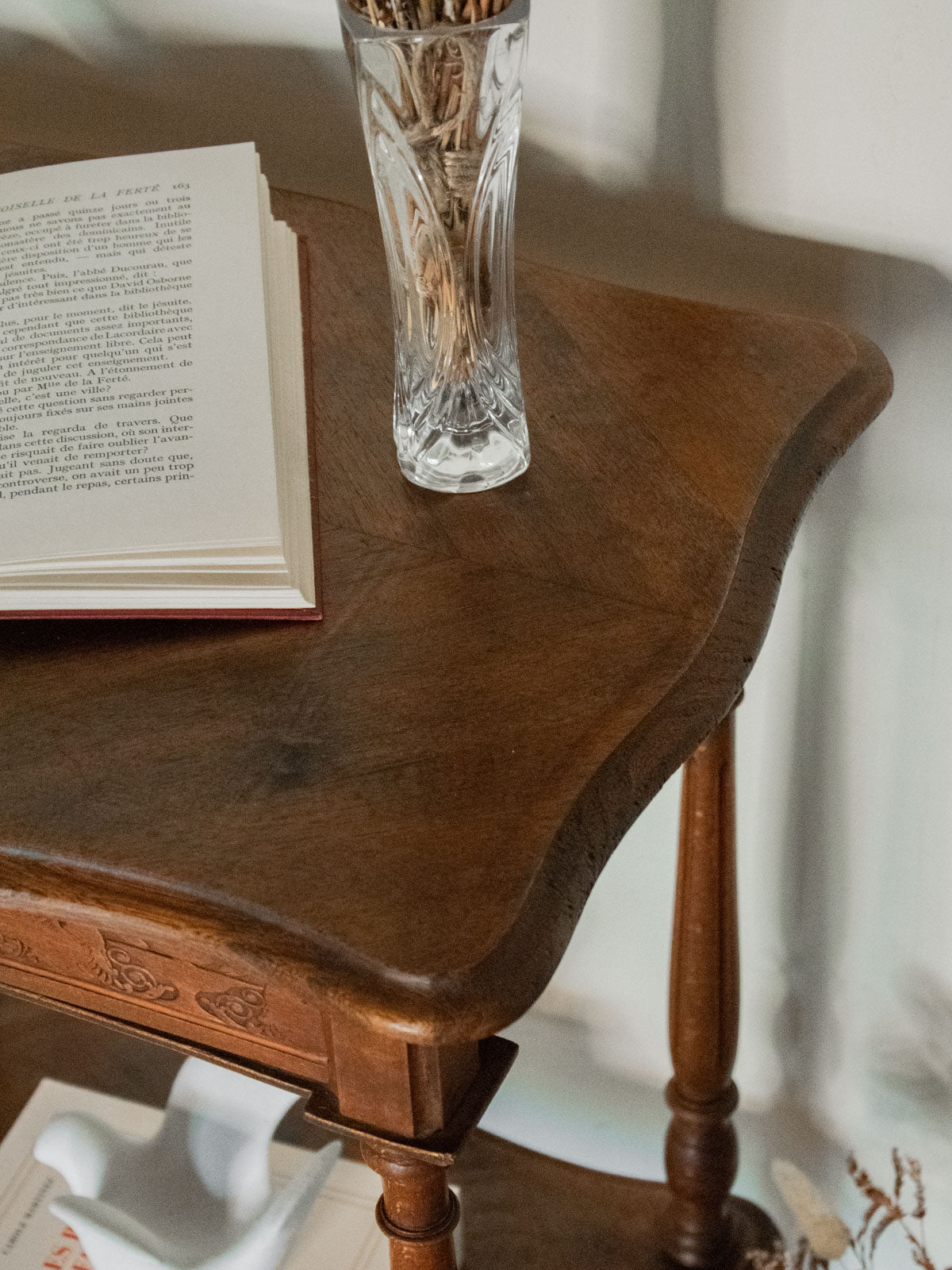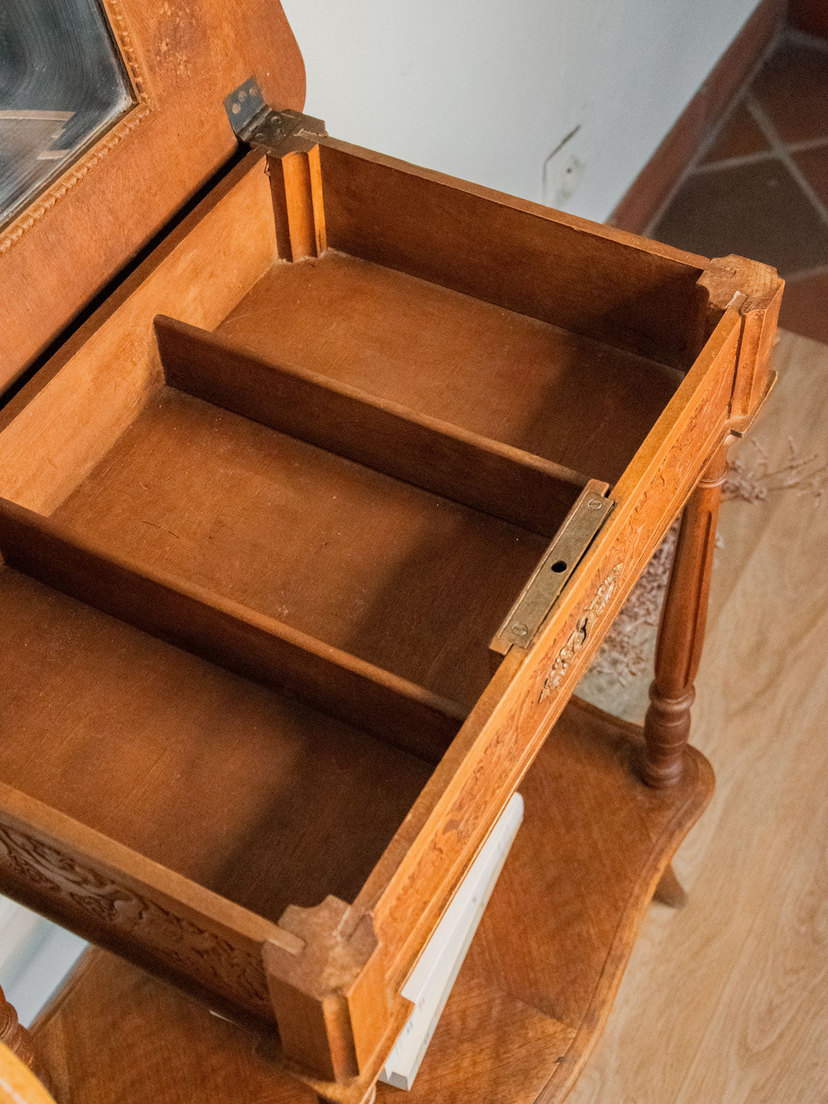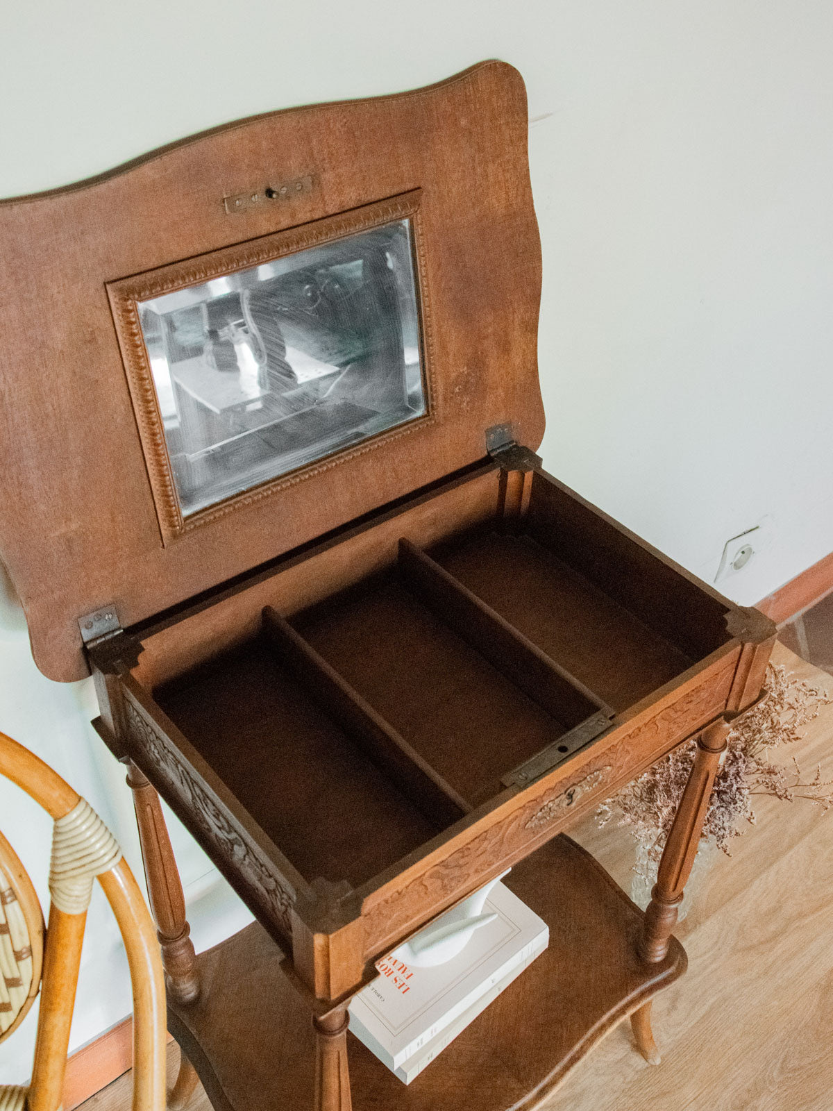 Sublimez votre intérieur avec cette coiffeuse fine en bois, son plateau ouvrant par le dessus dévoile un miroir carré orné de baguettes sculptées et un compartiment richement ouvragé sur ses quatre côtés (sans clé), offrant un espace intime pour vos routines beauté. Le plateau inférieur, taillé en arrondis rappelant le dessus, et les pieds courbés donnent une silhouette élégante et harmonieuse, parfaite pour un coin coquet et discret. Sa patine naturelle confère une atmosphère chaleureuse et authentique. Traces du temps présentes, notamment sur le plateau ainsi que sur les pieds ou le vernis est passé.