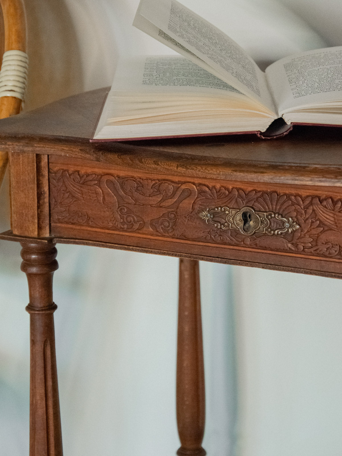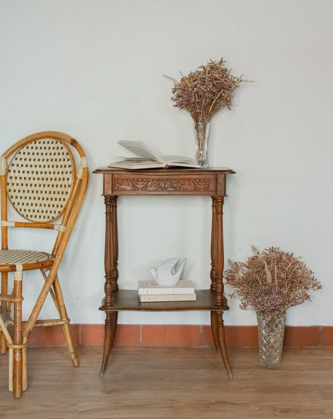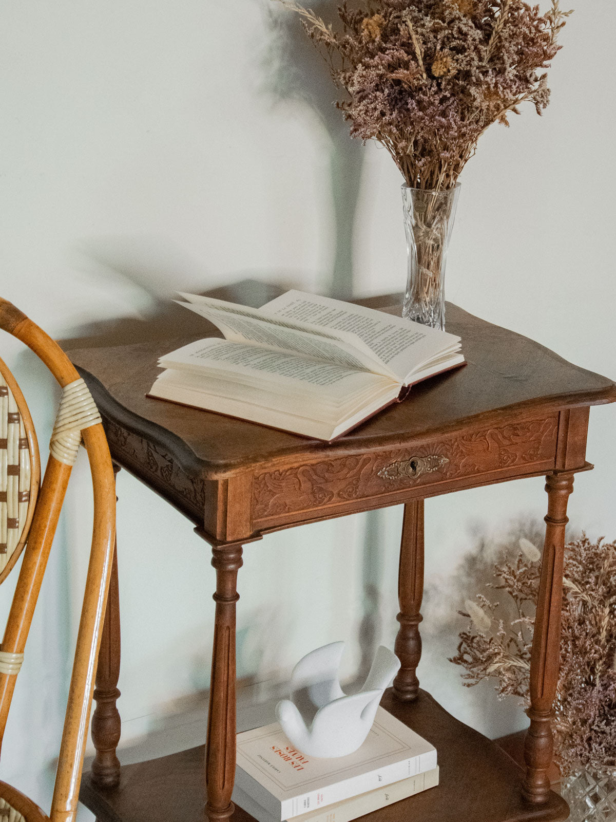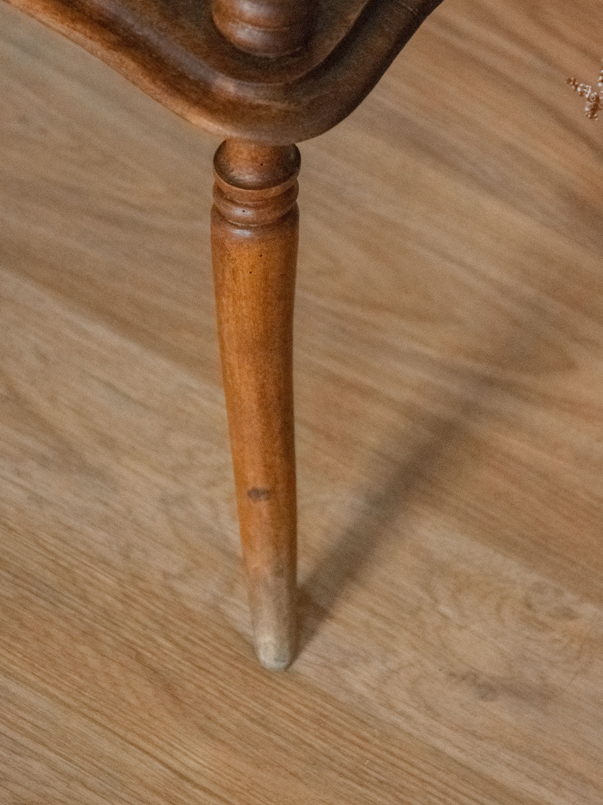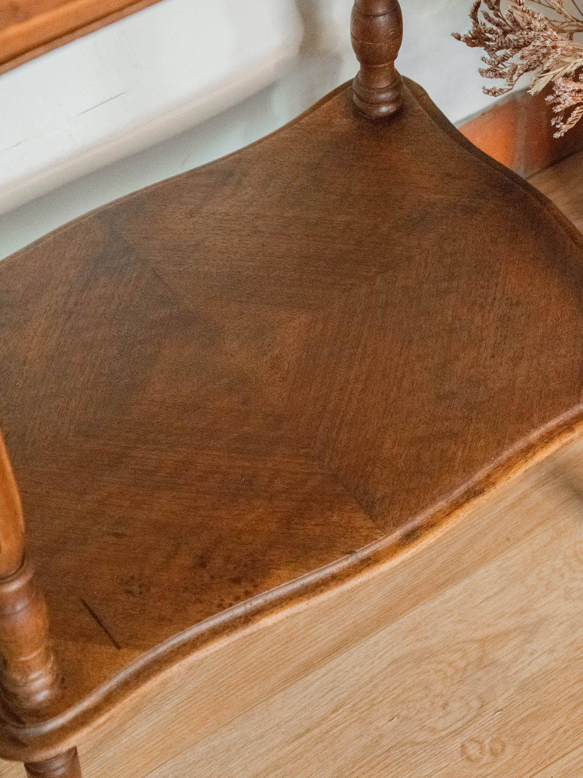 Sublimez votre intérieur avec cette coiffeuse fine en bois, son plateau ouvrant par le dessus dévoile un miroir carré orné de baguettes sculptées et un compartiment richement ouvragé sur ses quatre côtés (sans clé), offrant un espace intime pour vos routines beauté. Le plateau inférieur, taillé en arrondis rappelant le dessus, et les pieds courbés donnent une silhouette élégante et harmonieuse, parfaite pour un coin coquet et discret. Sa patine naturelle confère une atmosphère chaleureuse et authentique. Traces du temps présentes, notamment sur le plateau ainsi que sur les pieds ou le vernis est passé.