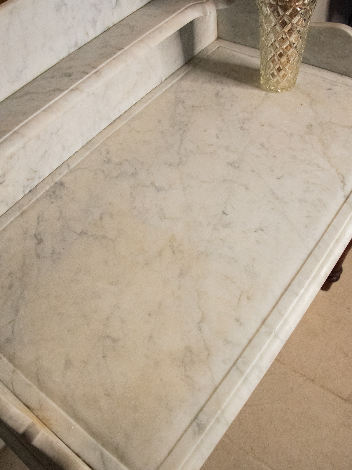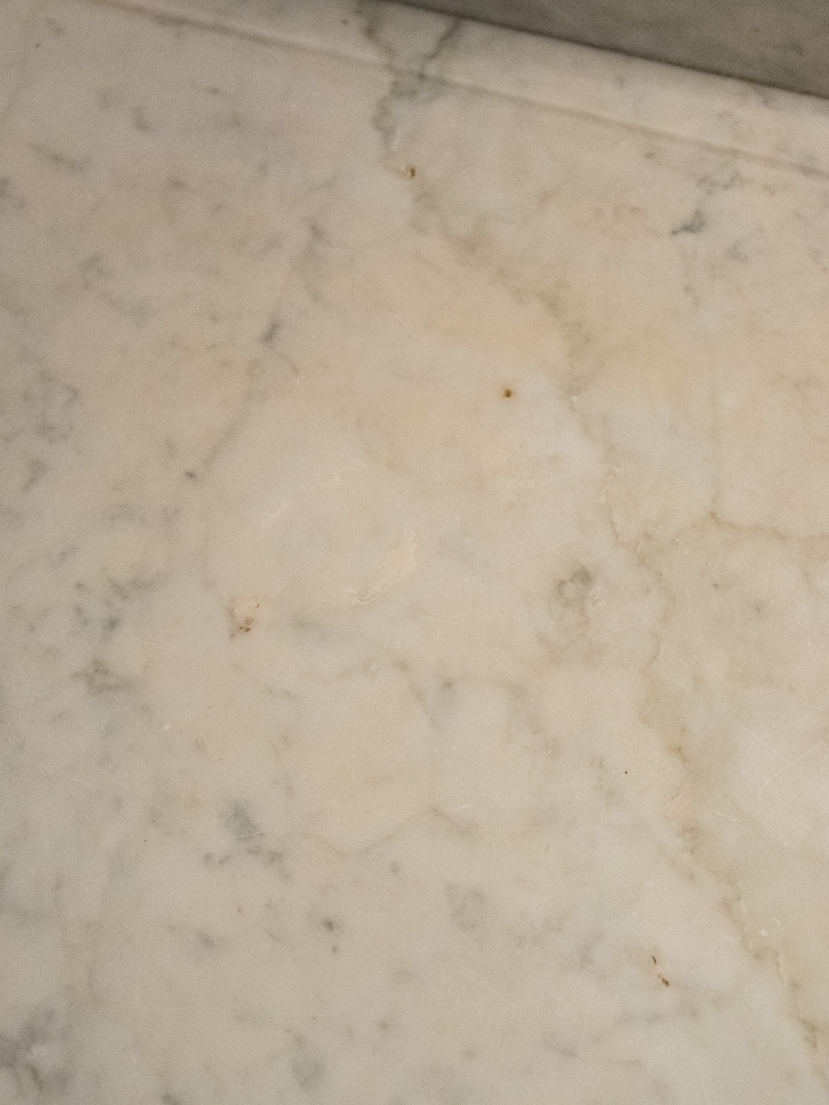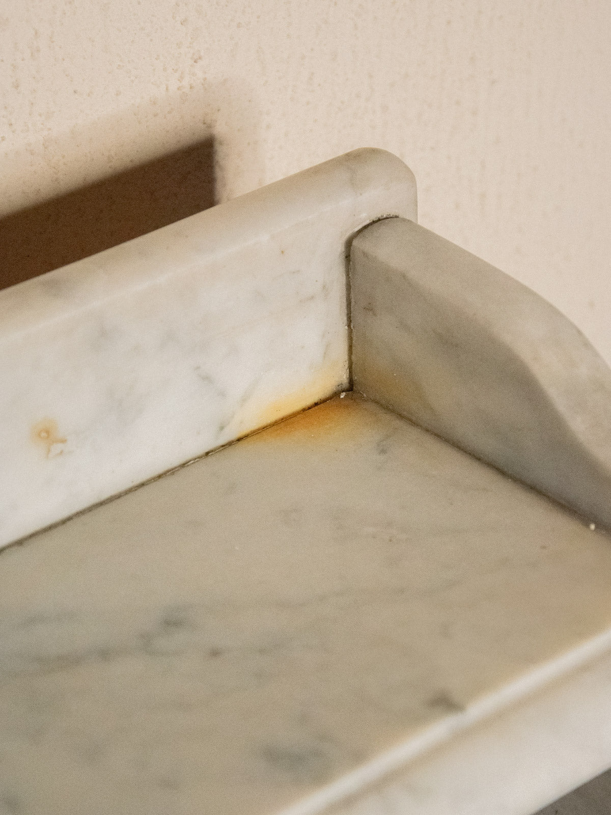 Sublimez votre salle de bains avec ce meuble de toilette qui marie un plateau et des rebords en marbre à une structure en bois chaleureuse, révélant une élégance sobre et intemporelle. Une étagère en marbre surplombe le plateau pour exposer savons et flacons, tandis que deux tiroirs et une niche sous-jacente offrent un rangement pratique et organisé pour vos essentiels. Ses proportions équilibrées apportent une atmosphère raffinée, entre modernité et caractère. Quelques fissures superficielles sur le marbre et légères traces du temps.