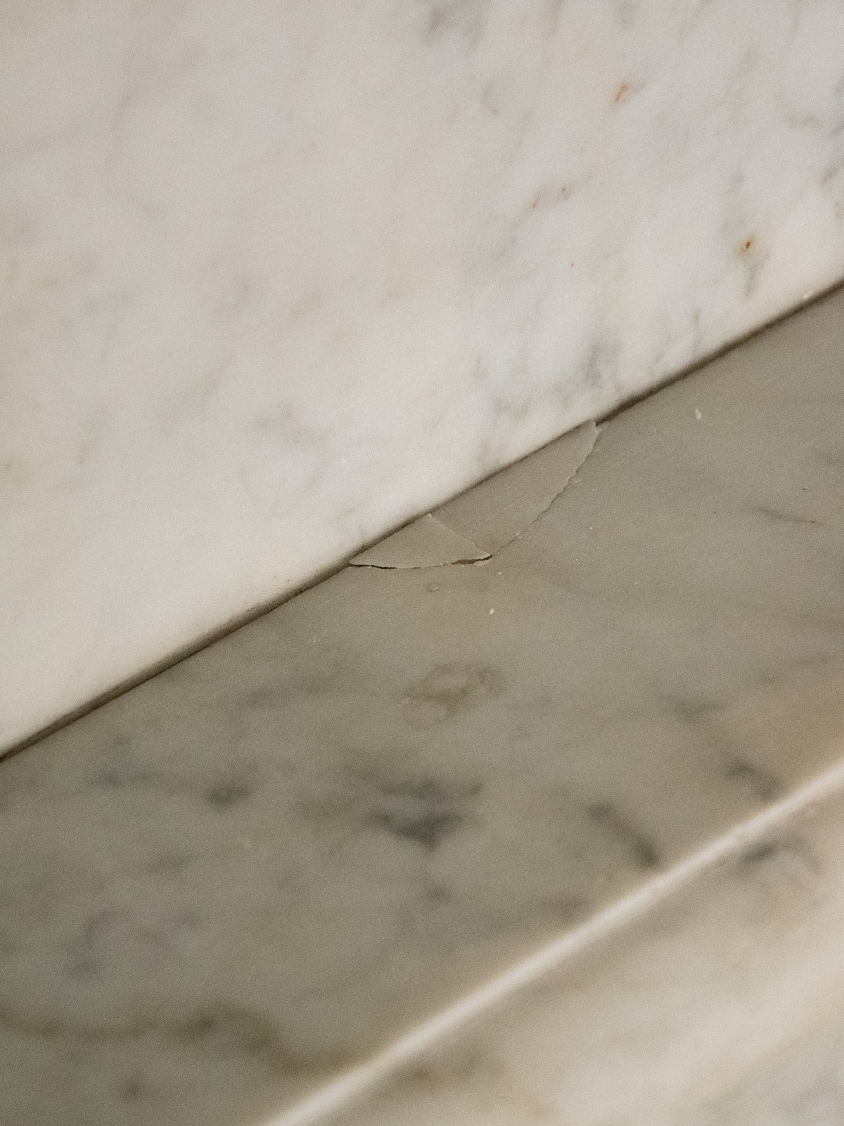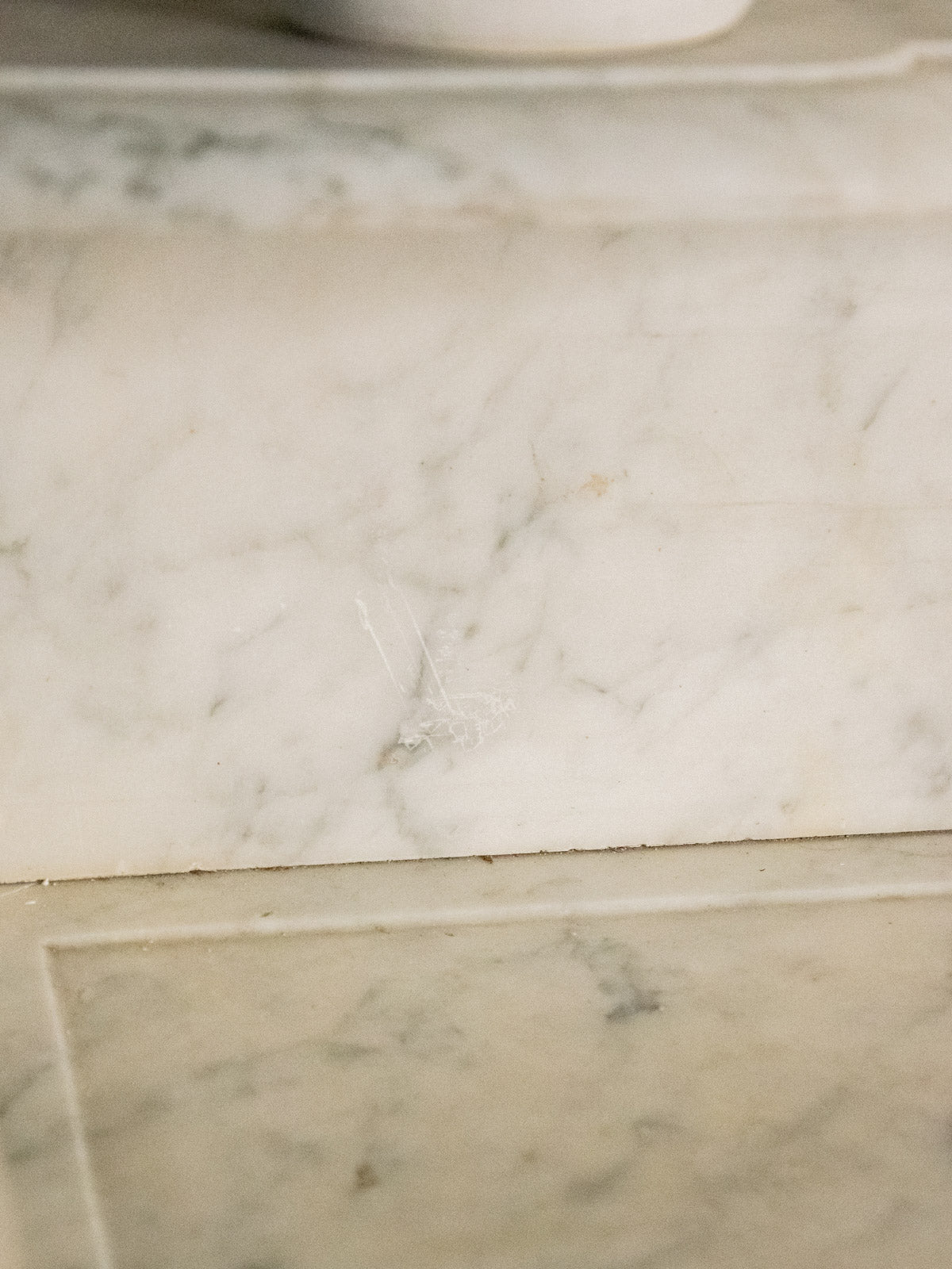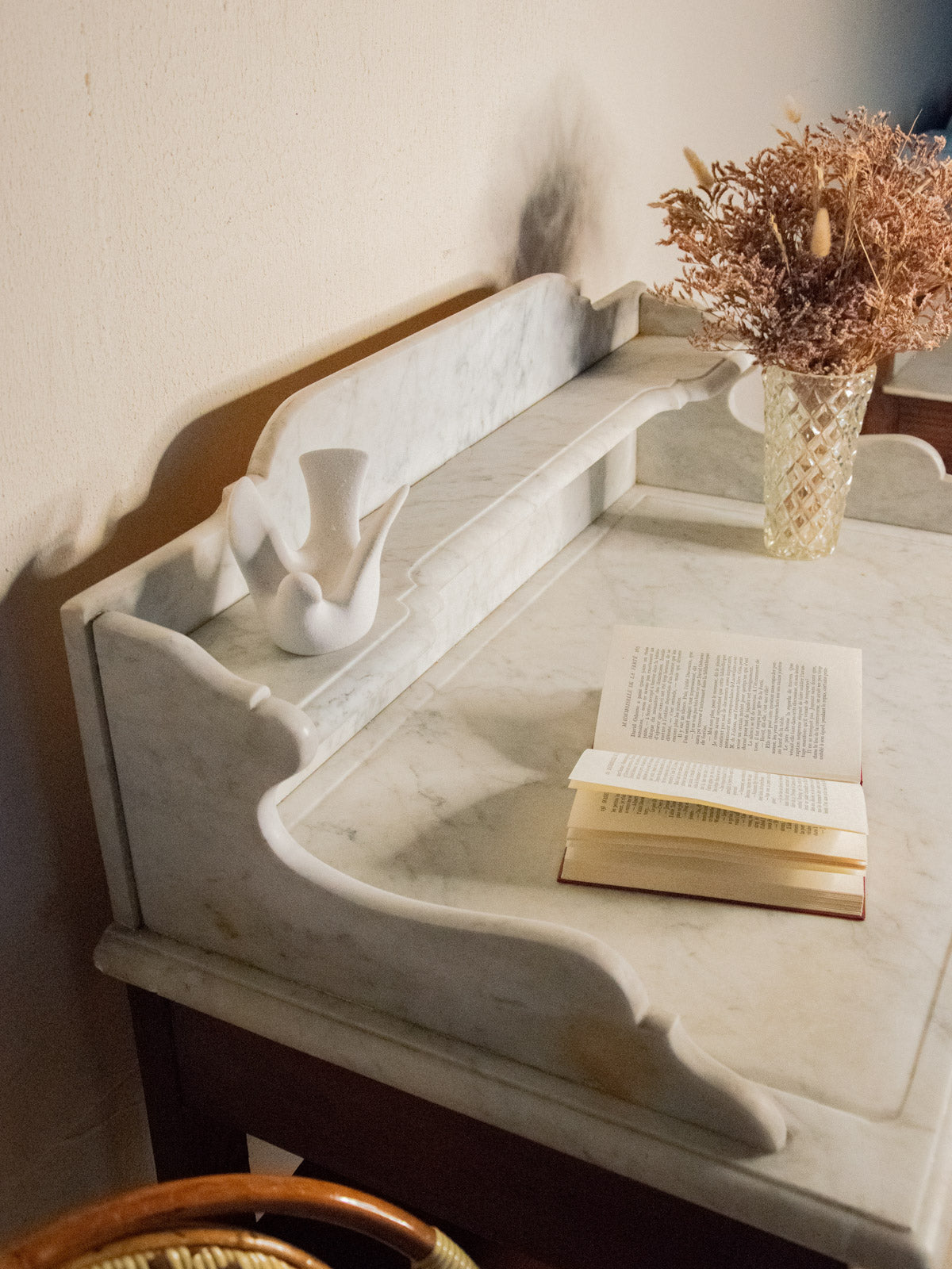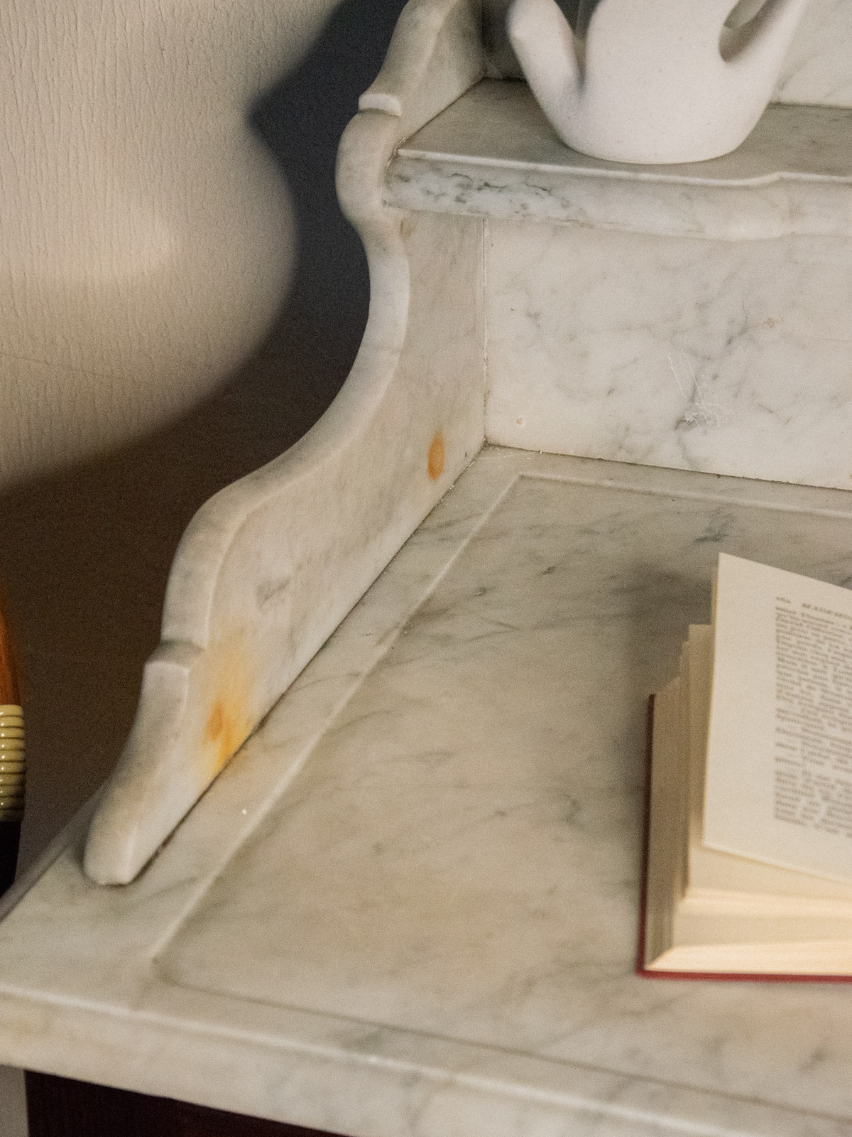 Sublimez votre salle de bains avec ce meuble de toilette qui marie un plateau et des rebords en marbre à une structure en bois chaleureuse, révélant une élégance sobre et intemporelle. Une étagère en marbre surplombe le plateau pour exposer savons et flacons, tandis que deux tiroirs et une niche sous-jacente offrent un rangement pratique et organisé pour vos essentiels. Ses proportions équilibrées apportent une atmosphère raffinée, entre modernité et caractère. Quelques fissures superficielles sur le marbre et légères traces du temps.