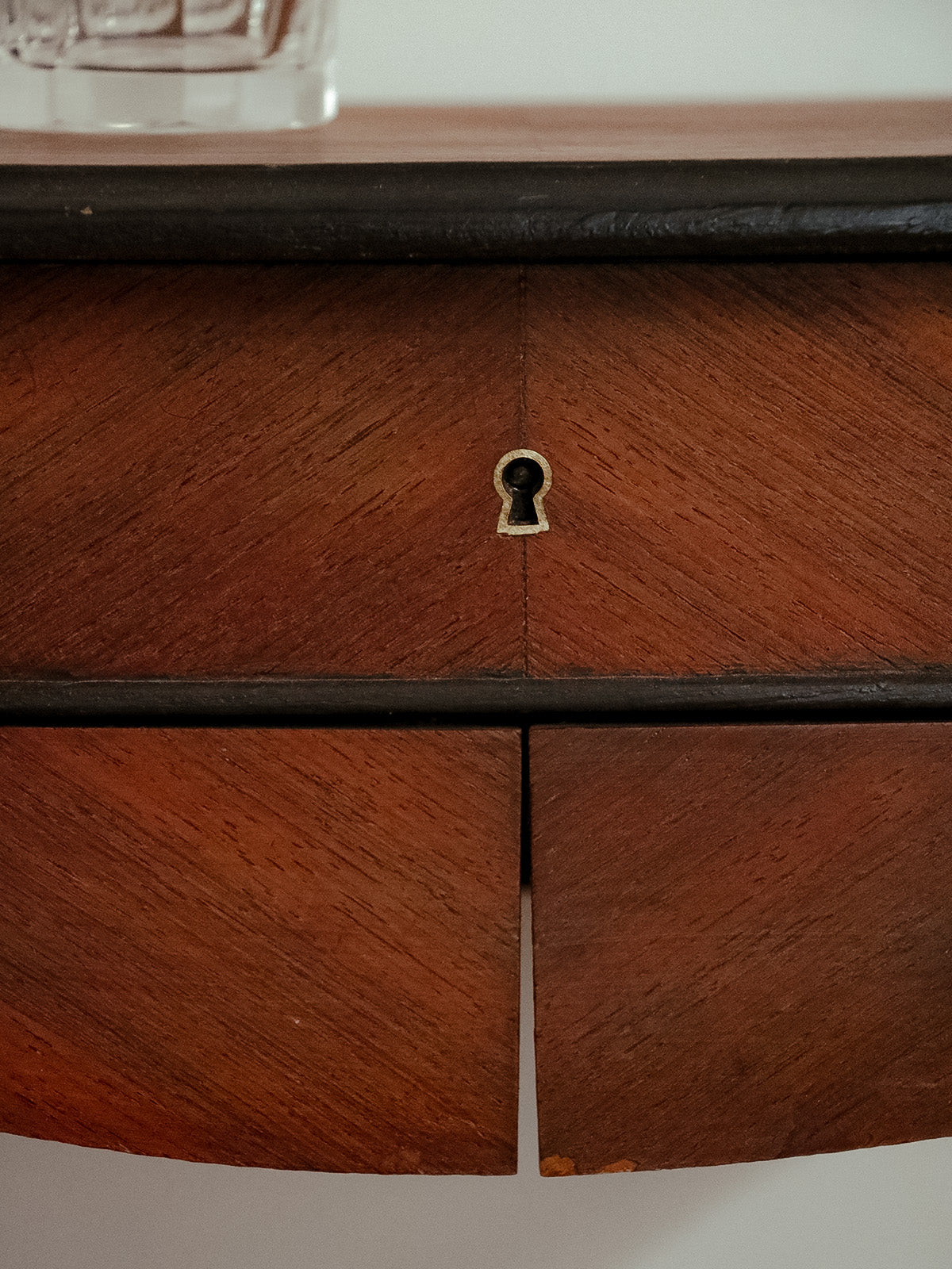 Sublimez votre coin beauté avec cette coiffeuse au plaquage bois façon marqueterie, posée sur un piètement noir courbé qui lui confère une silhouette élégante et graphique; son format compact invite à l'intégrer facilement dans une chambre ou un dressing. Son plateau se soulève et ses deux petits tiroirs proposent un rangement discret pour soins et accessoires, parfait pour une routine quotidienne raffinée. Elle est vendue sans clé. Légères traces du temps sur les tiroirs qui participent à son charme.