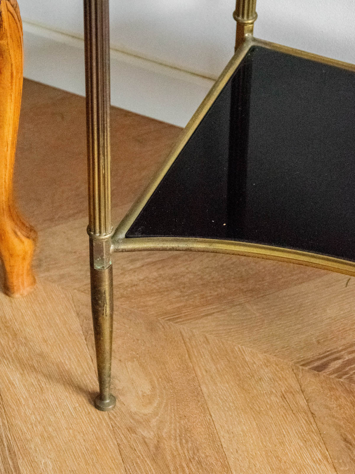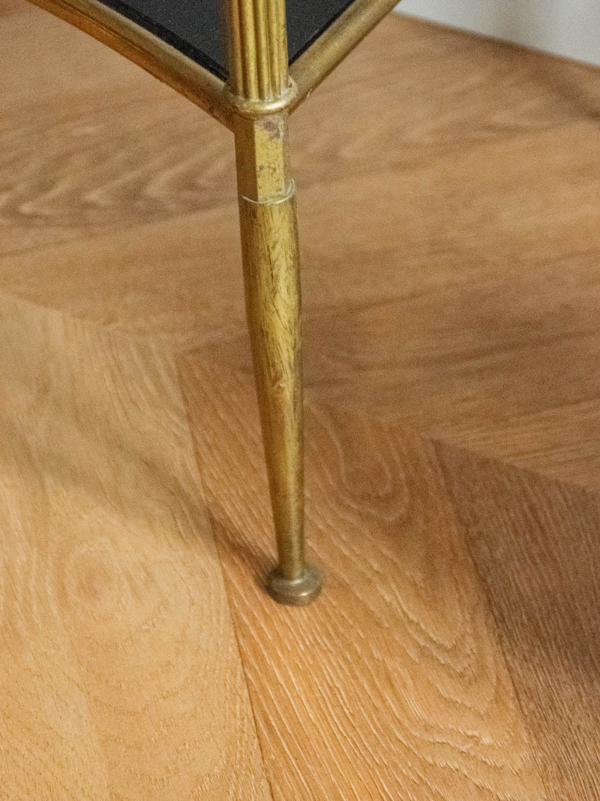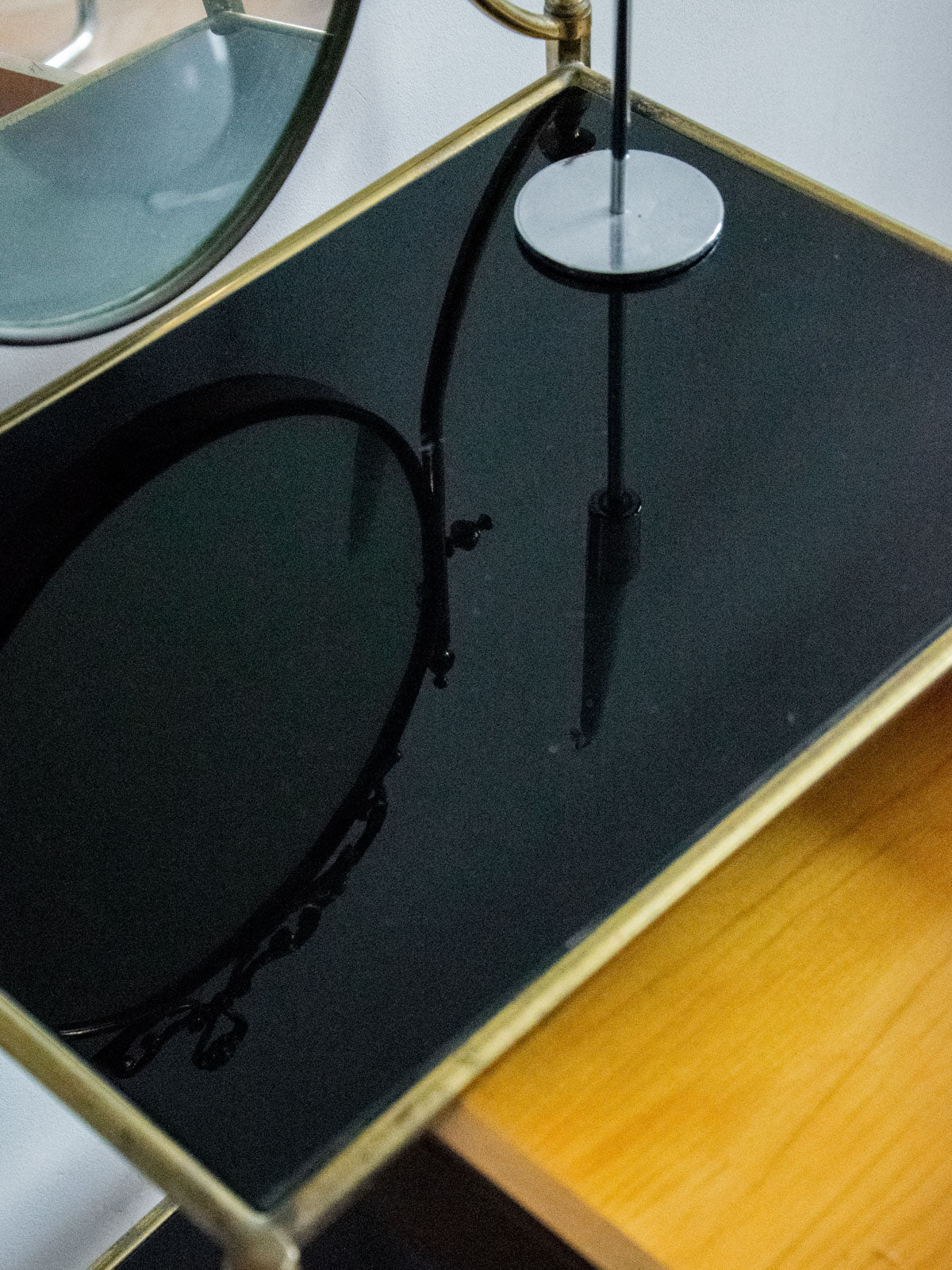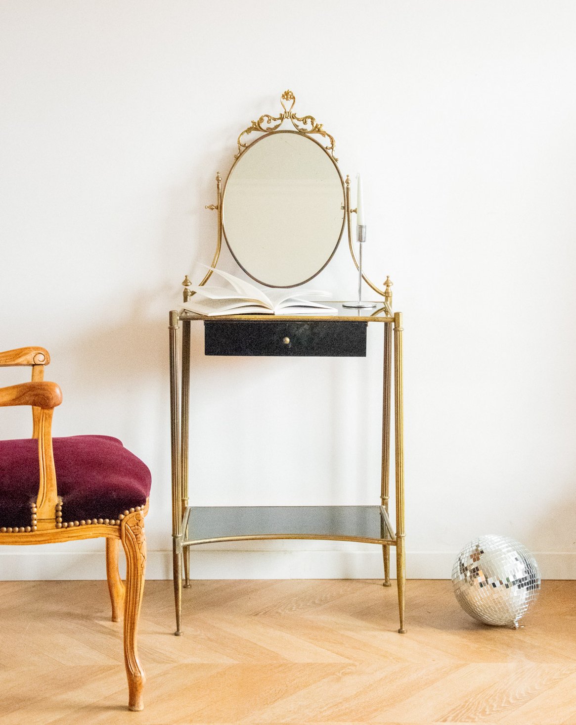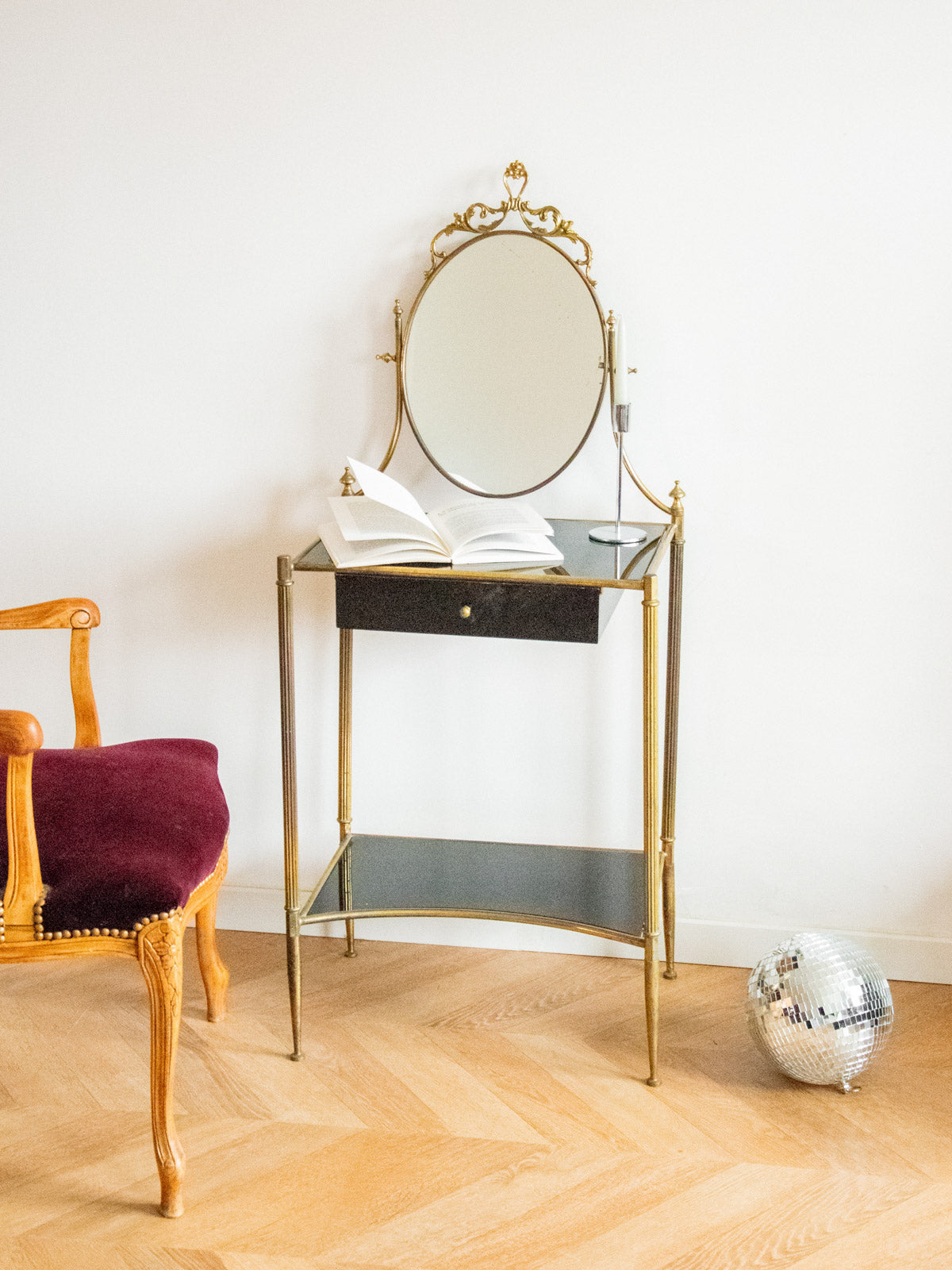 Sublimez votre coin maquillage ou votre entrée avec cette coiffeuse en laiton et verre noir, dotée d'un miroir intégré qui souligne une élégance graphique. Un tiroir discret et une petite tablette offrent un rangement malin pour vos accessoires et soins, tandis que le plateau accueille vos essentiels avec aisance. Ses proportions élancées et sa finition contrastée apportent une atmosphère contemporaine et chaleureuse, idéale pour un intérieur urbain raffiné.