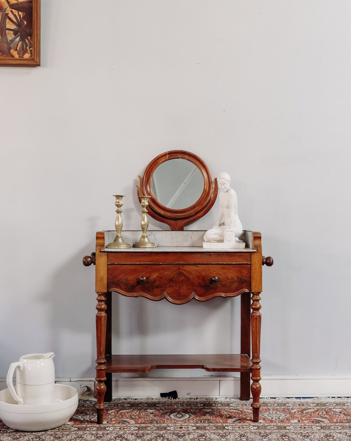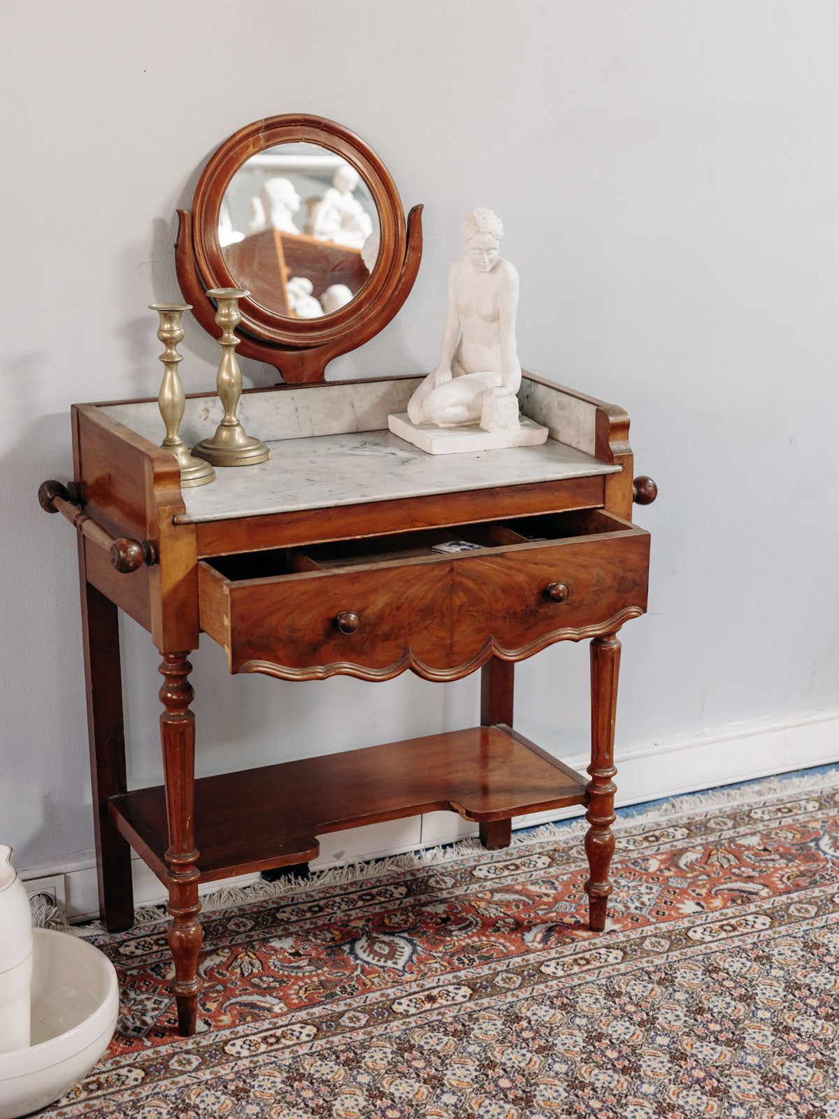 Sublimez votre coin maquillage avec cette petite coiffeuse au plateau en marbre blanc et miroir rond pivotant, où l'élégance se marie à la praticité. Les poignées latérales ouvrent sur un large tiroir compartimenté, parfait pour organiser bijoux et cosmétiques, tandis que le plateau bas offre un espace supplémentaire pour paniers ou livres. Son format compact s'intègre facilement dans une chambre ou une entrée, apportant une présence raffinée sans encombrement. Le petit miroir à besoin d'assistance sur le mur.