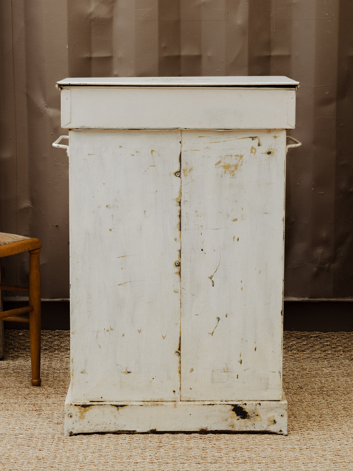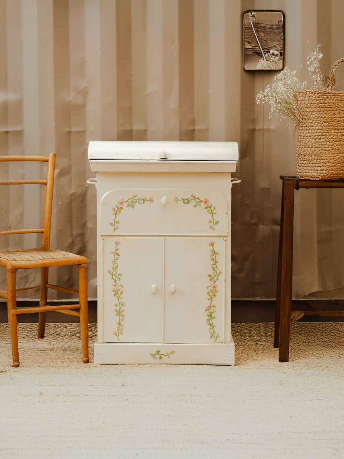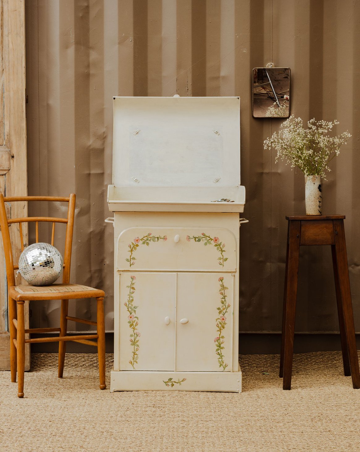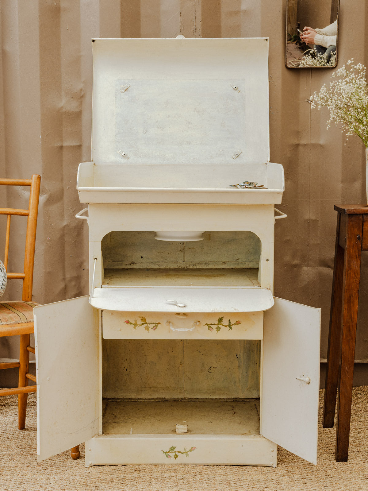Découvrez cette coiffeuse ancienne tout métal, subtilement rehaussée d'une peinture réalisée à la main qui lui confère une patine singulière. Le plateau se relève pour laisser apparaître une vasque non d'origine et révèle l'ancien emplacement d'un miroir. Munie d'une niche discrète sous une porte relevable et deux portes inférieures qui dissimulent un tiroir à façade décorée, offrant un rangement malin.