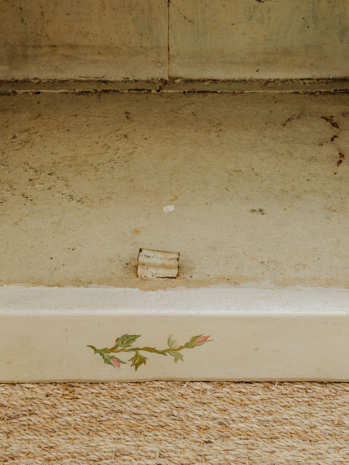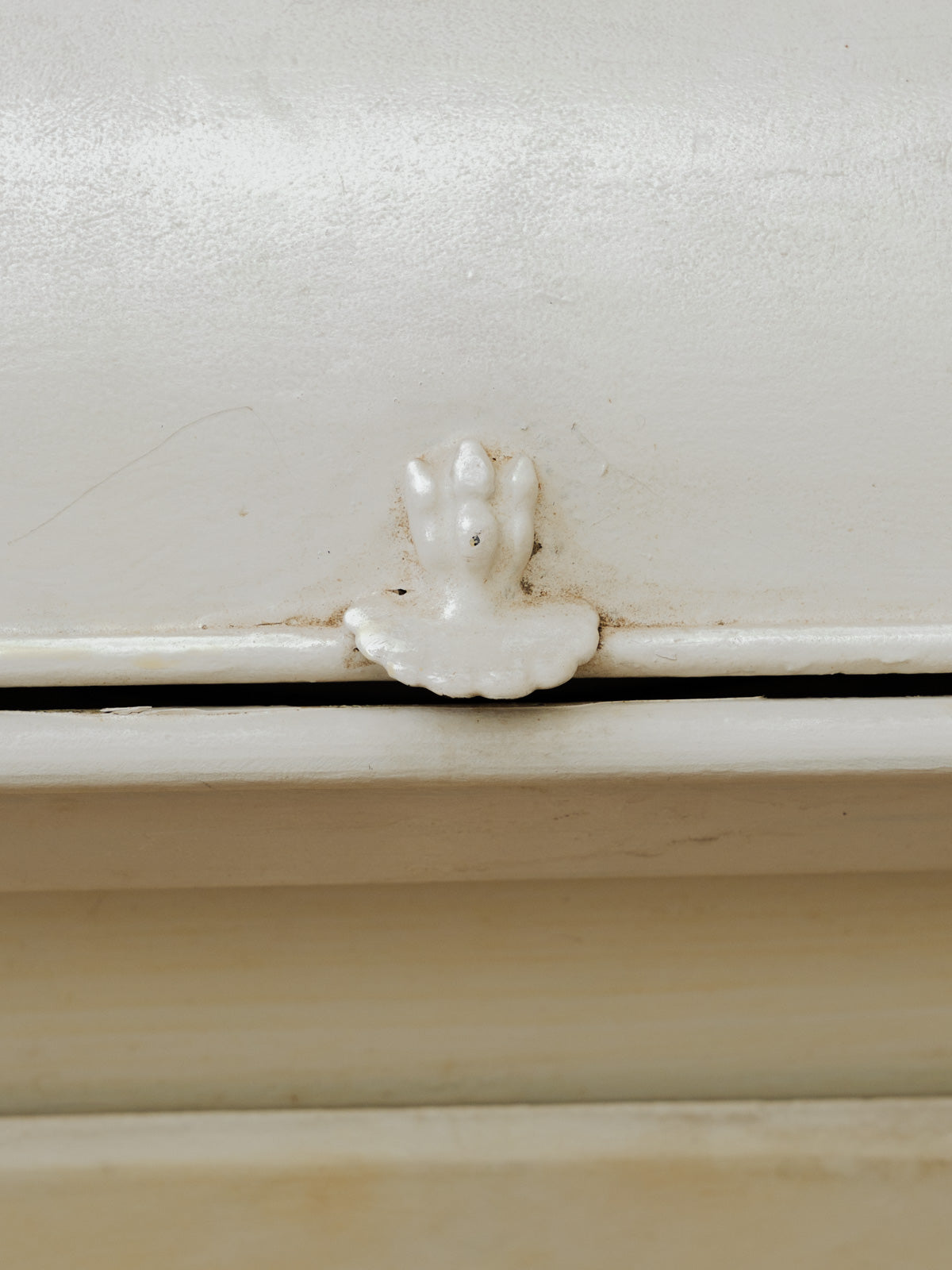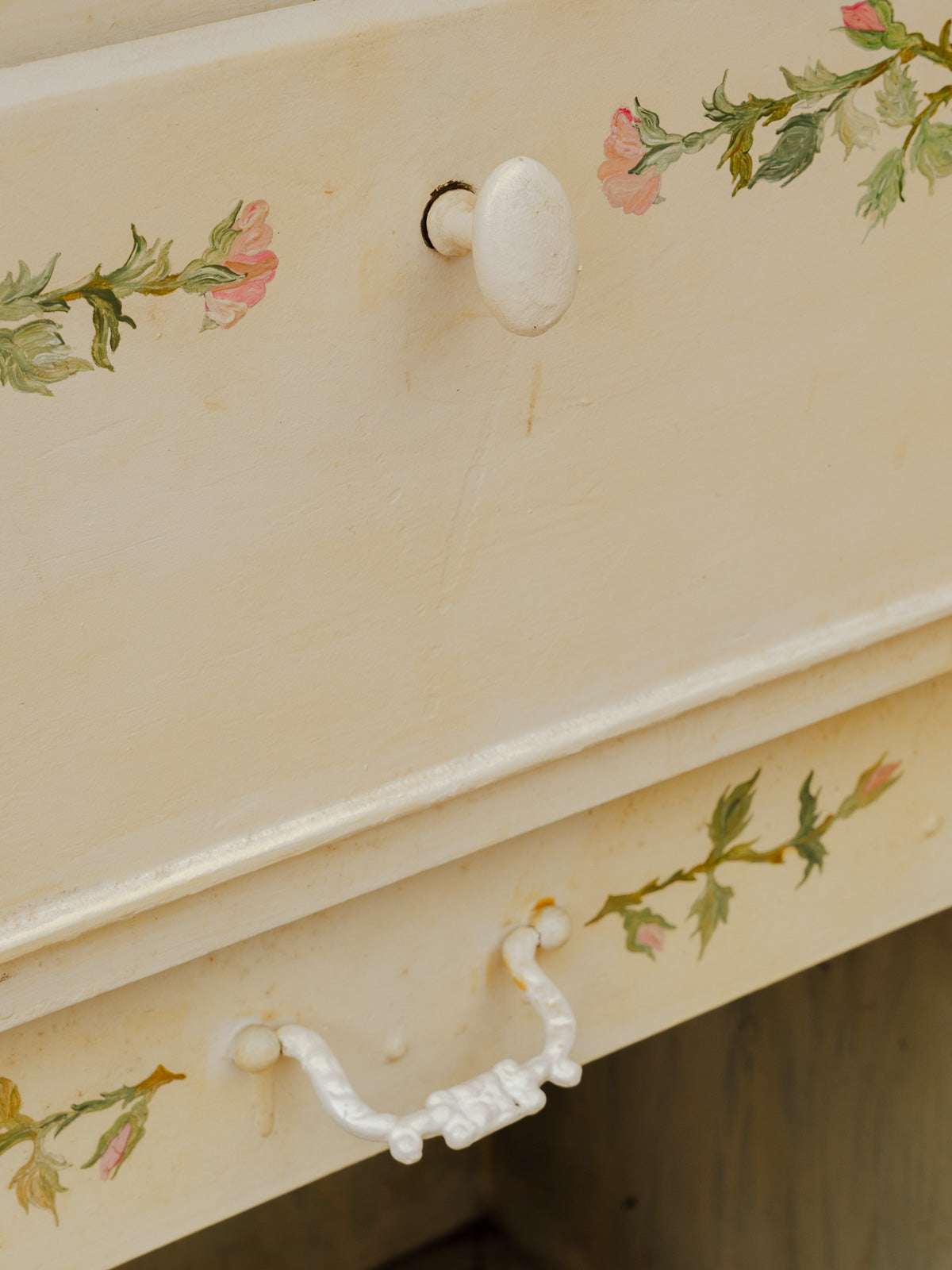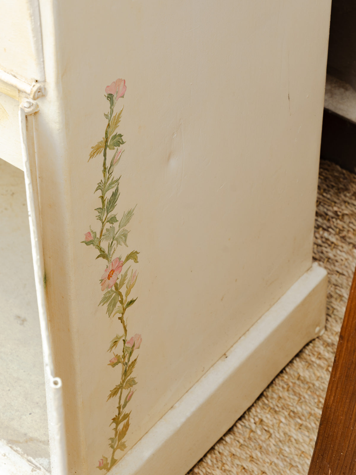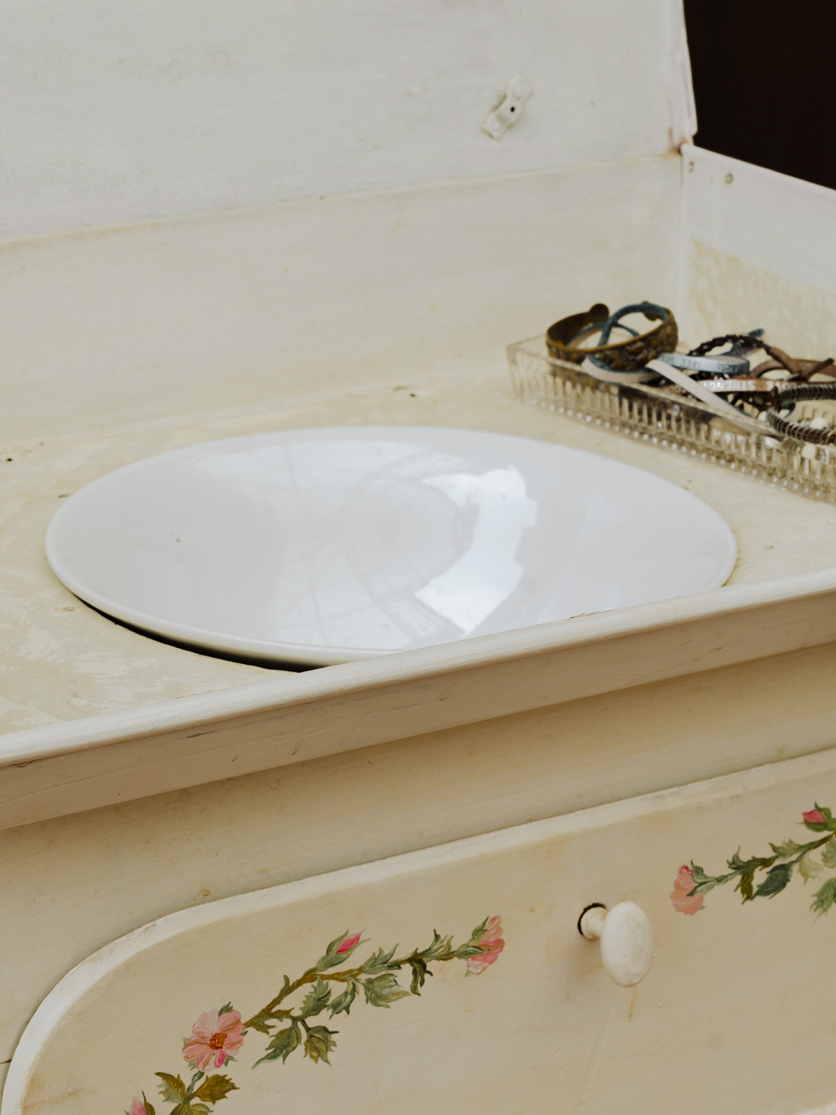 Découvrez cette coiffeuse ancienne tout métal, subtilement rehaussée d'une peinture réalisée à la main qui lui confère une patine singulière. Le plateau se relève pour laisser apparaître une vasque non d'origine et révèle l'ancien emplacement d'un miroir. Munie d'une niche discrète sous une porte relevable et deux portes inférieures qui dissimulent un tiroir à façade décorée, offrant un rangement malin.
