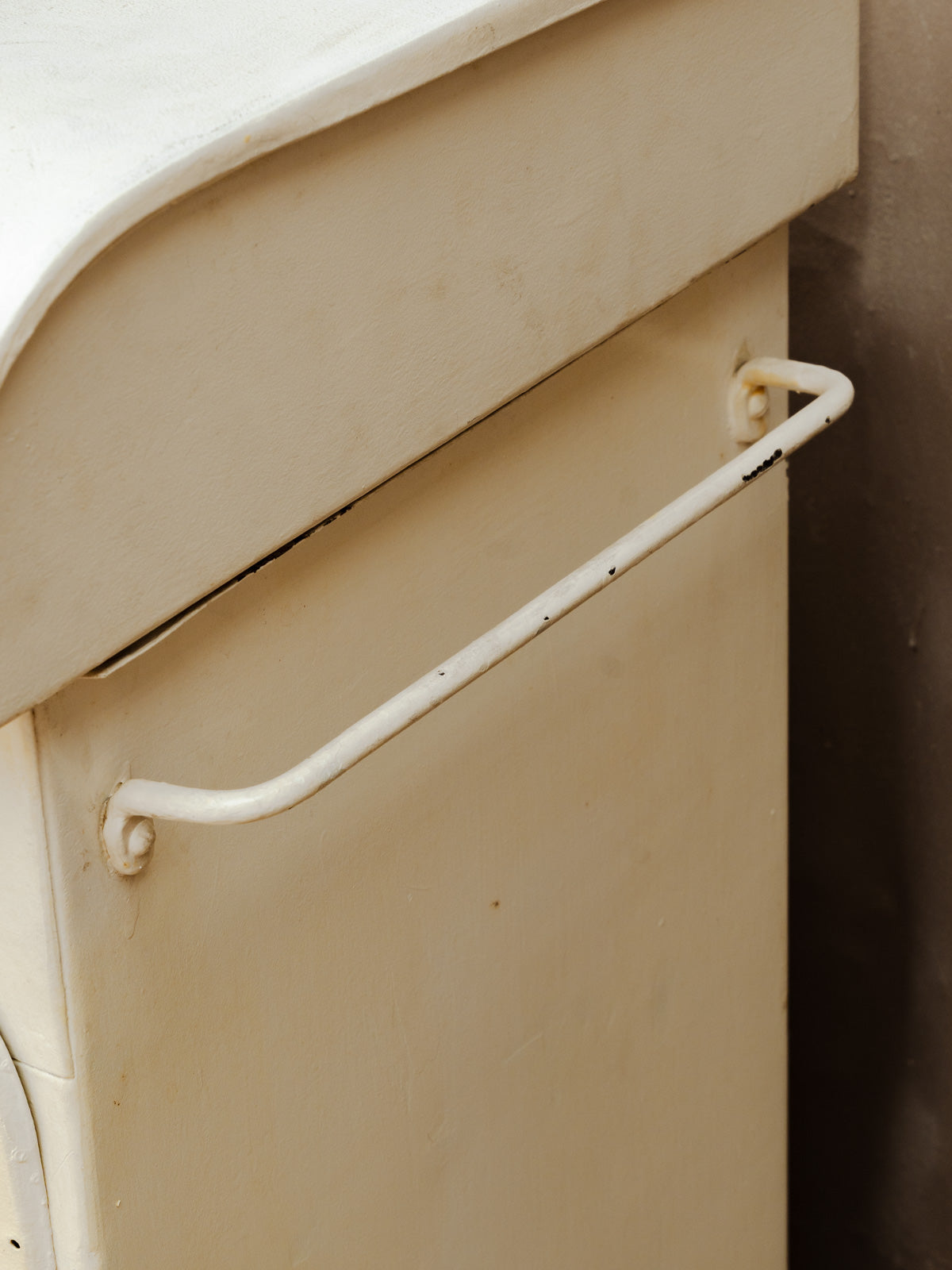 Des porte-serviettes latéraux complètent l'ensemble, parfait pour une salle de bains au charme rétro. Quelques marques d'usage qui font son authenticité.