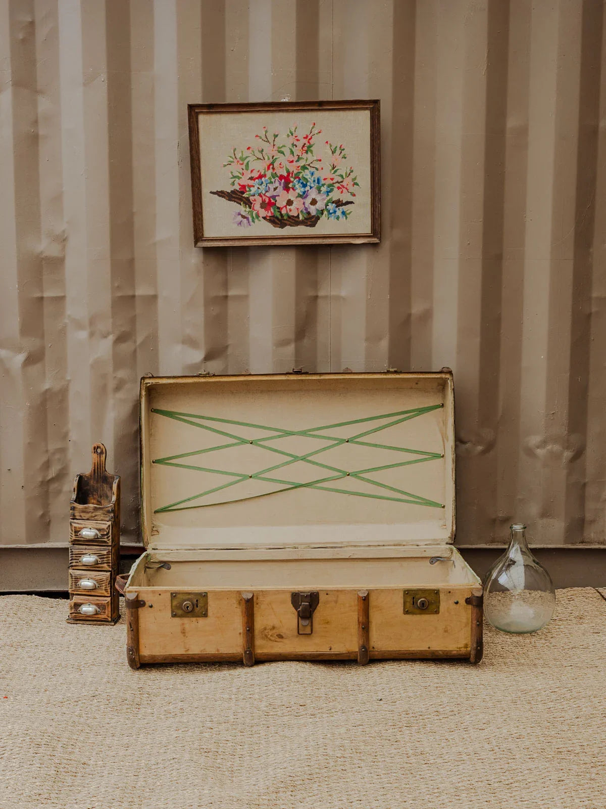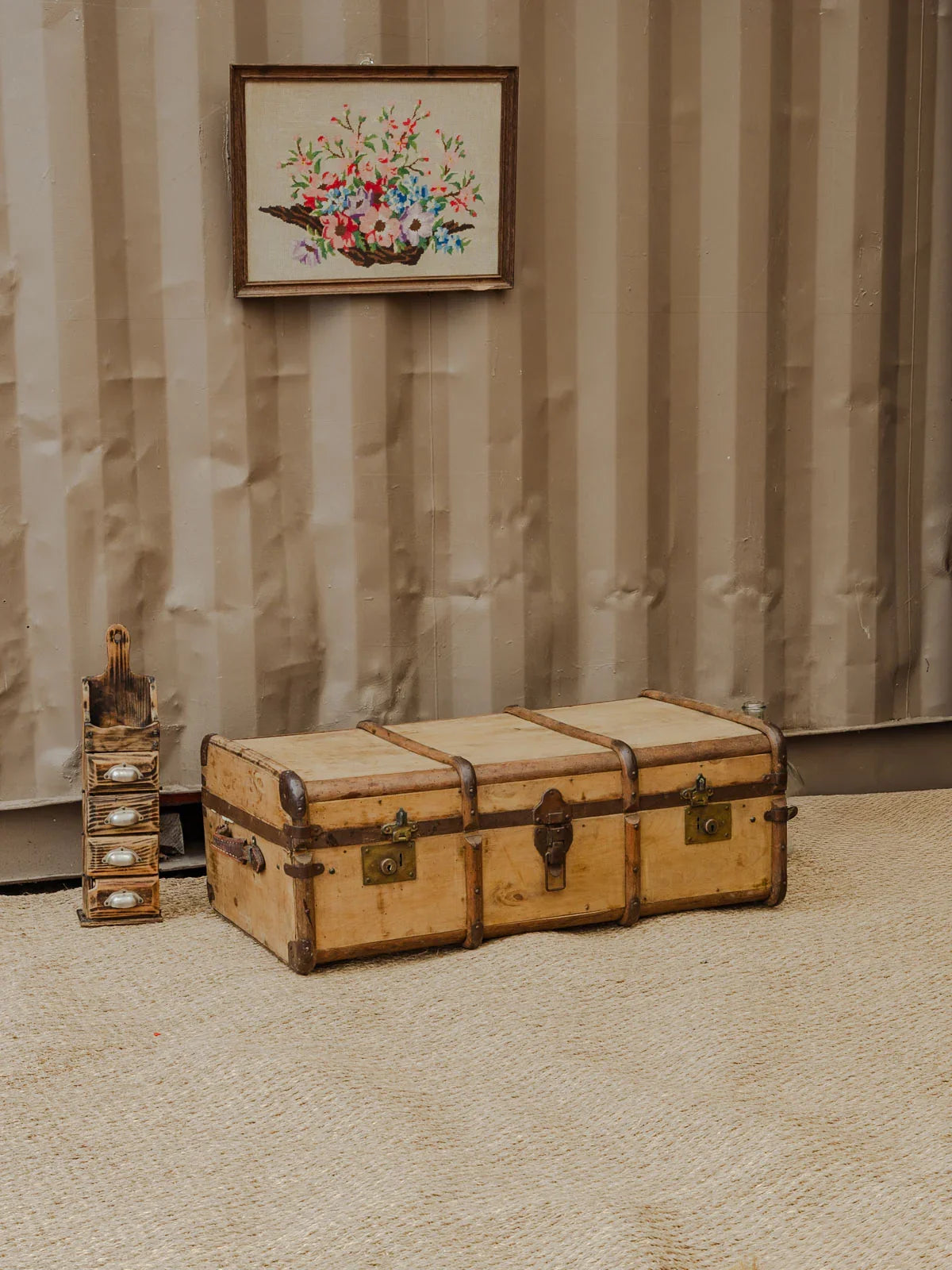Découvrez cette malle en bois au charme vintage, doublée d'un intérieur beige qui souligne son élégance. Sa structure offre une capacité généreuse, idéale pour ranger linge, coussins ou objets de voyage tout en servant d'assise ou de table d'appoint dans un intérieur chaleureux. La serrure est sans clé mais la fermeture se fait solidement grâce à des loquets métalliques, soulignant son authenticité. Quelques traces du temps présentes.