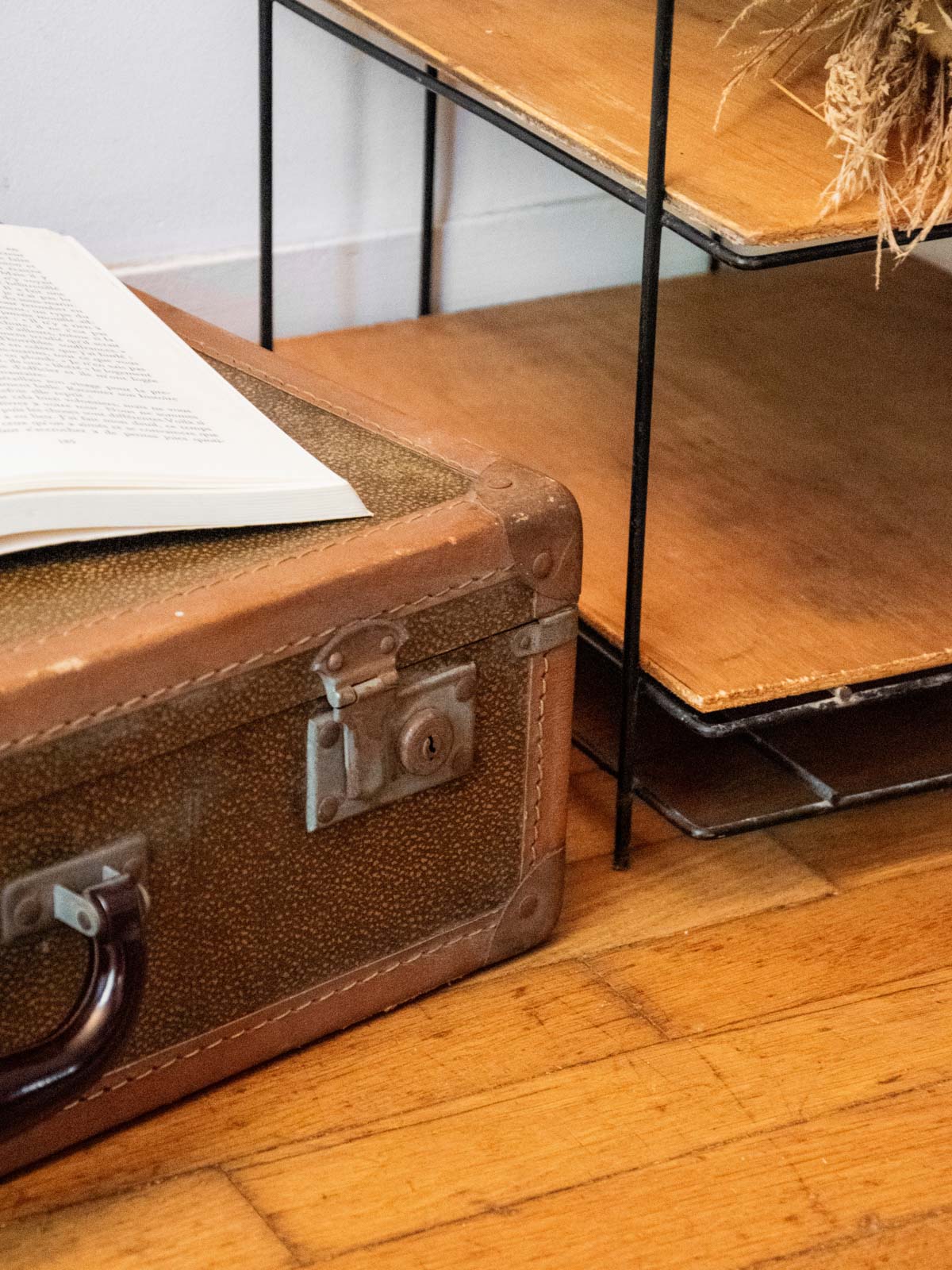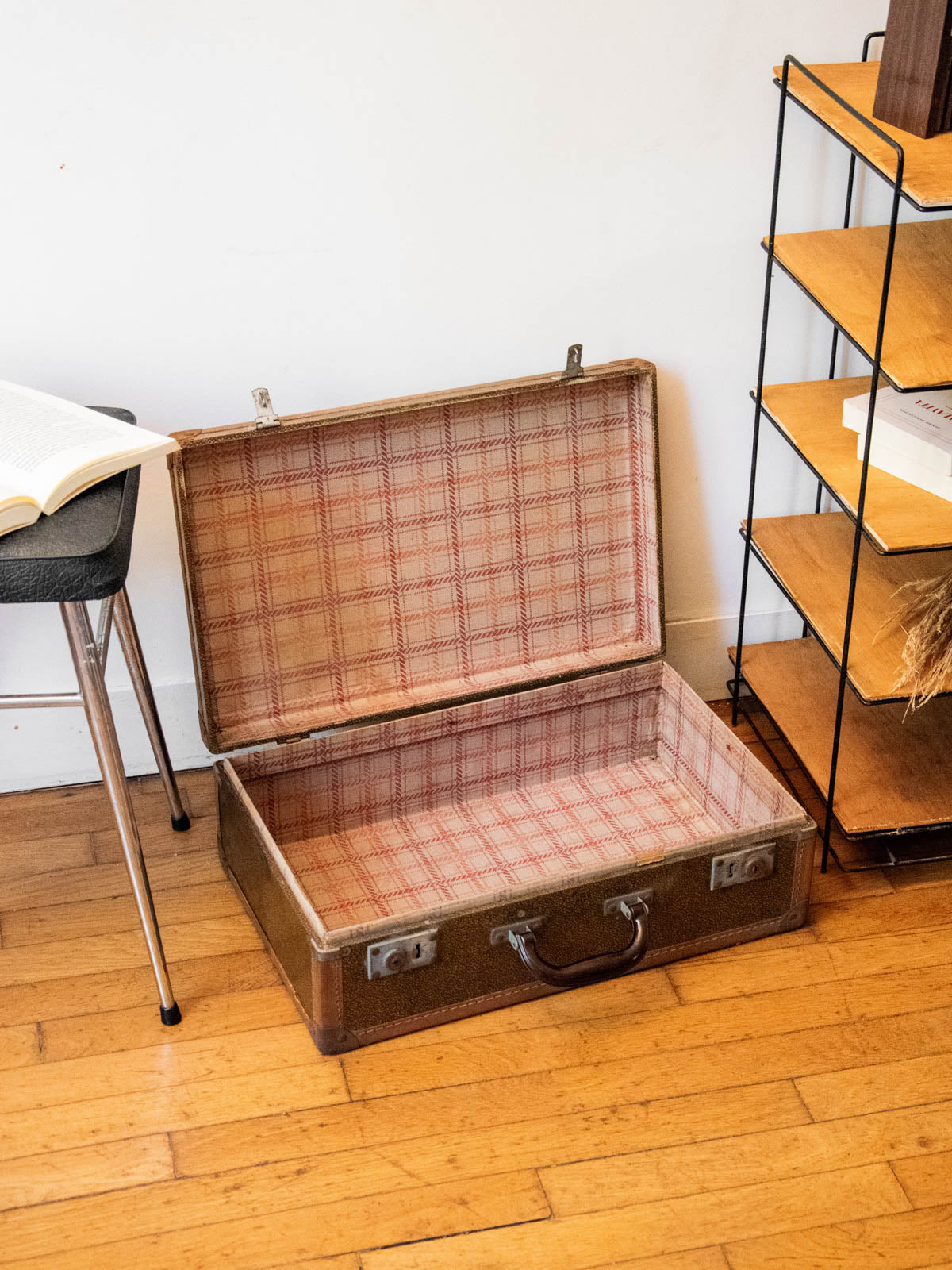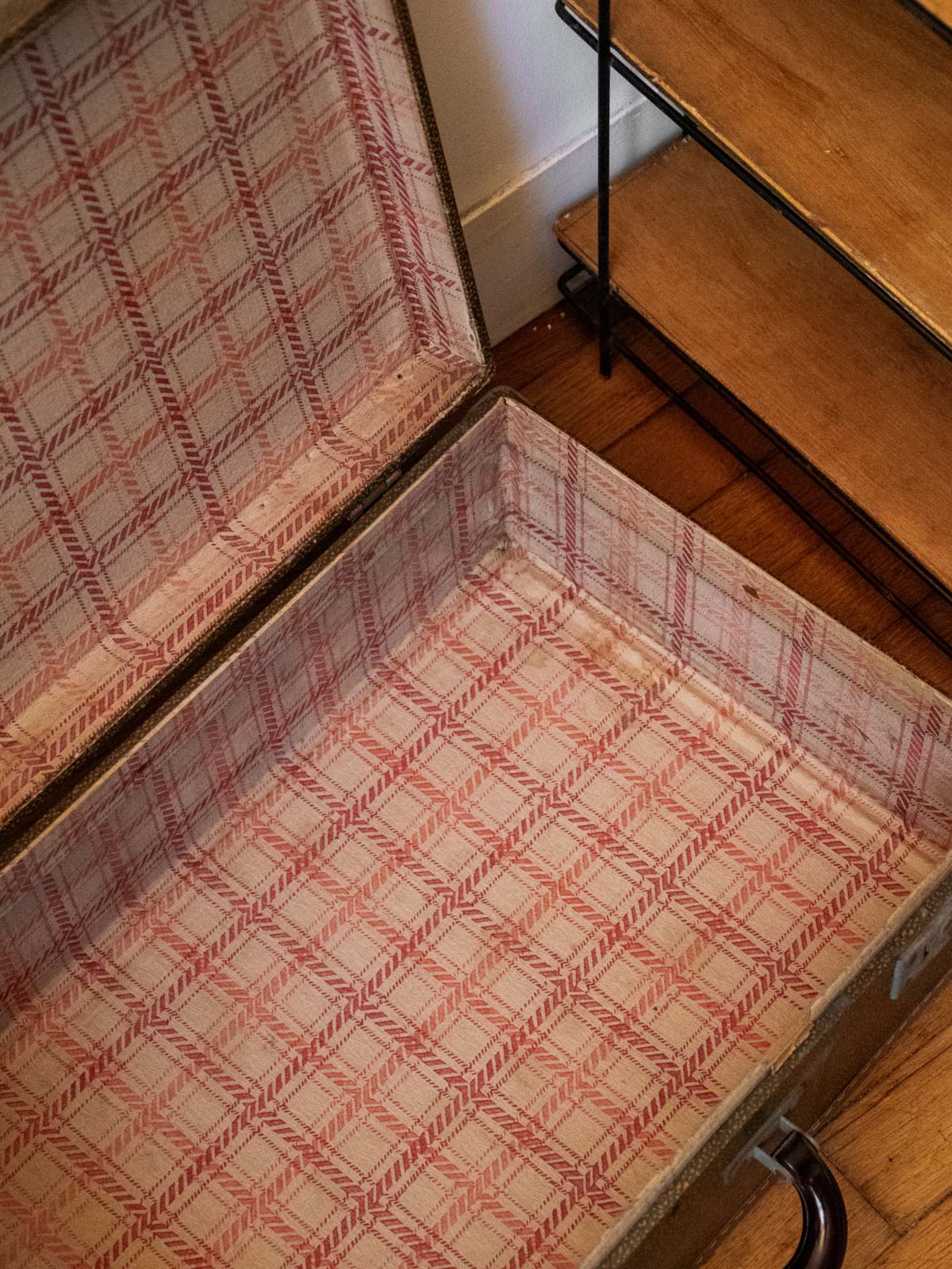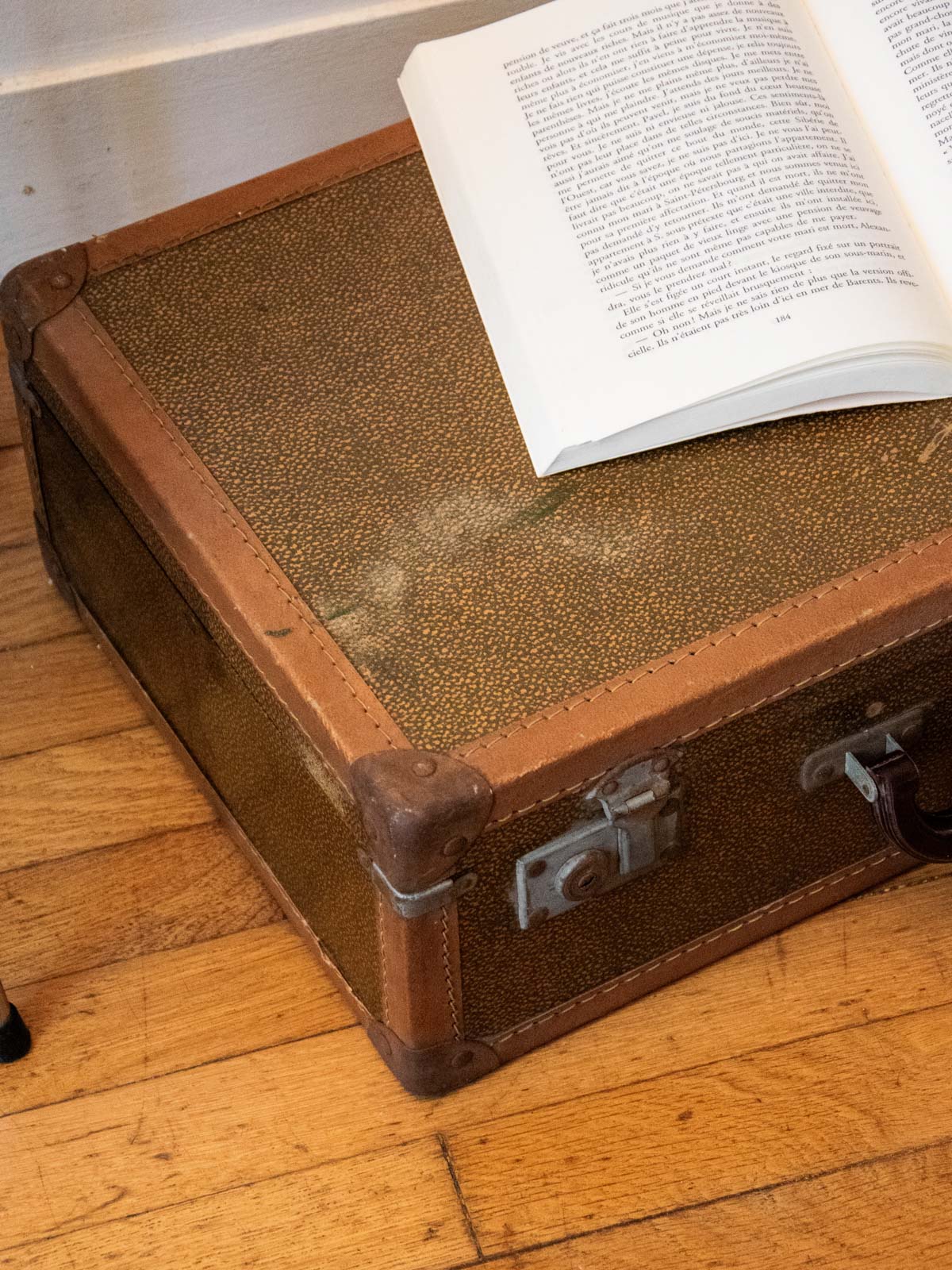 Offrez une touche rétro avec cette valise ancienne transformée en malle de voyage, en bois souligné d'un intérieur habillé de papier peint. Son format compact la rend idéale comme table basse ou caisse de rangement, apportant un rangement discret et un plateau original dans un salon ou une entrée ; la fermeture est fonctionnelle. La matière patinée et le papier à motifs créent une ambiance chaleureuse et nostalgique, facile à intégrer à des décors contemporains. Quelques traces d'usage présentes.