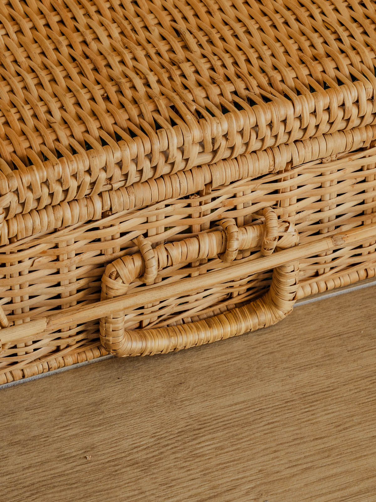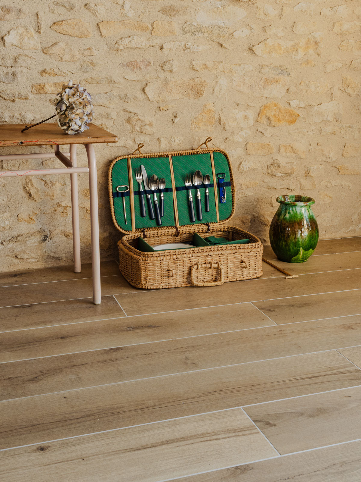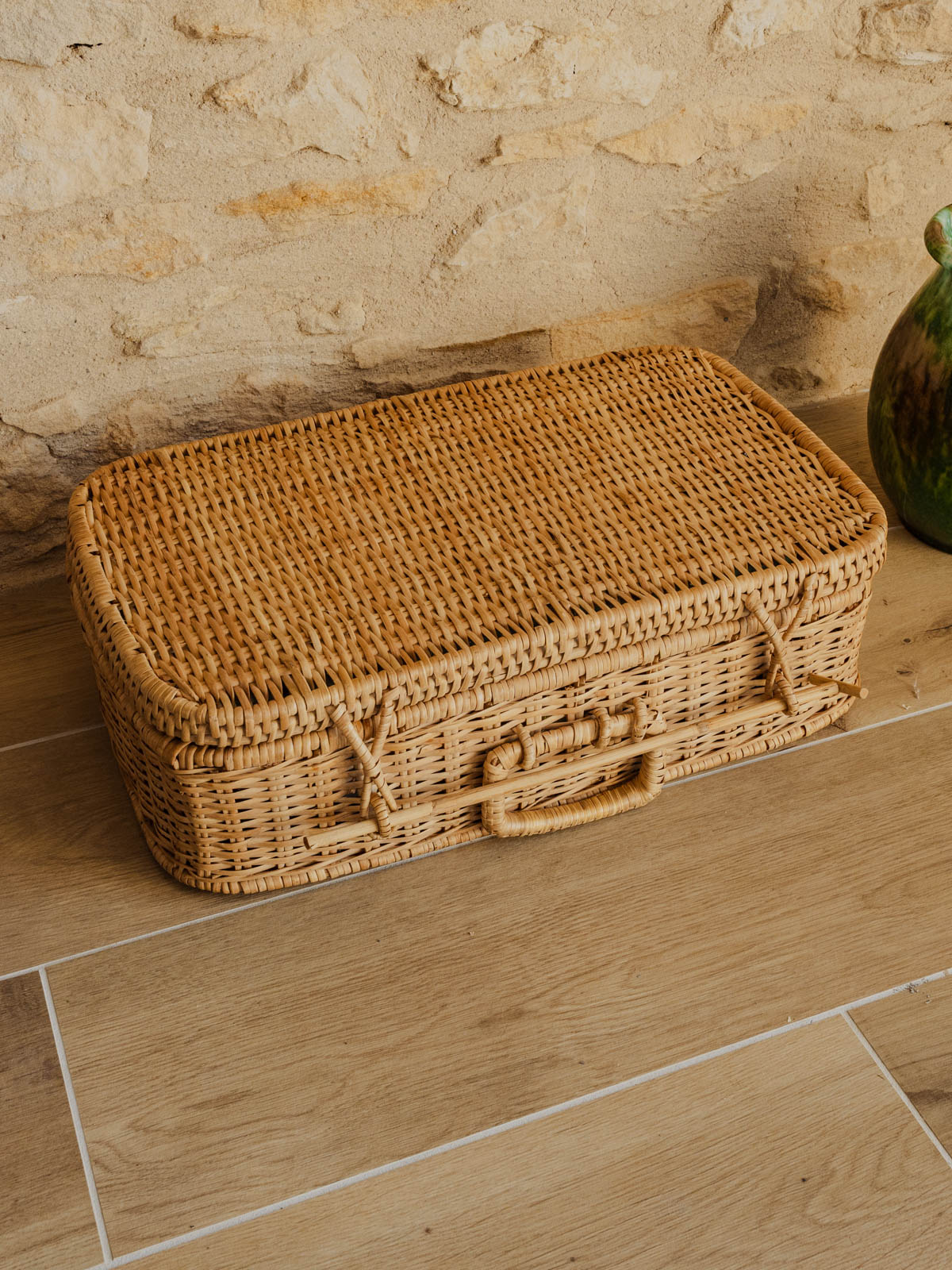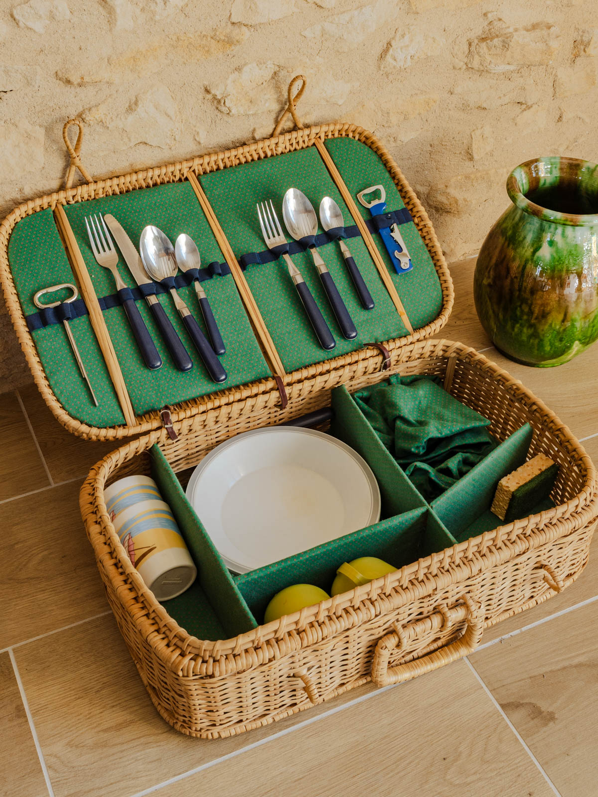 Invitez l'art du pique-nique avec cette malle en rotin et osier, au tressage lumineux qui diffuse une élégance naturelle. Son intérieur compartimenté accueille un service pour deux — assiettes creuses blanches, tasses à café vertes, verres à motifs, couverts, limonadier et éponge — et se ferme solidement grâce à une tige de maintien, idéale pour escapades champêtres ou déjeuners improvisés en terrasse. Sa patine douce crée une ambiance chaleureuse. Quelques traces du temps présentes.