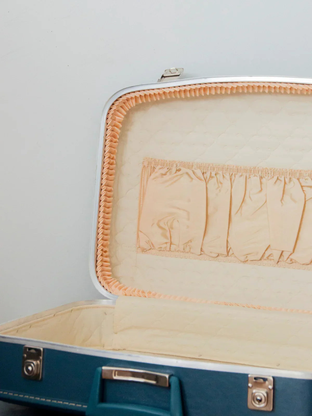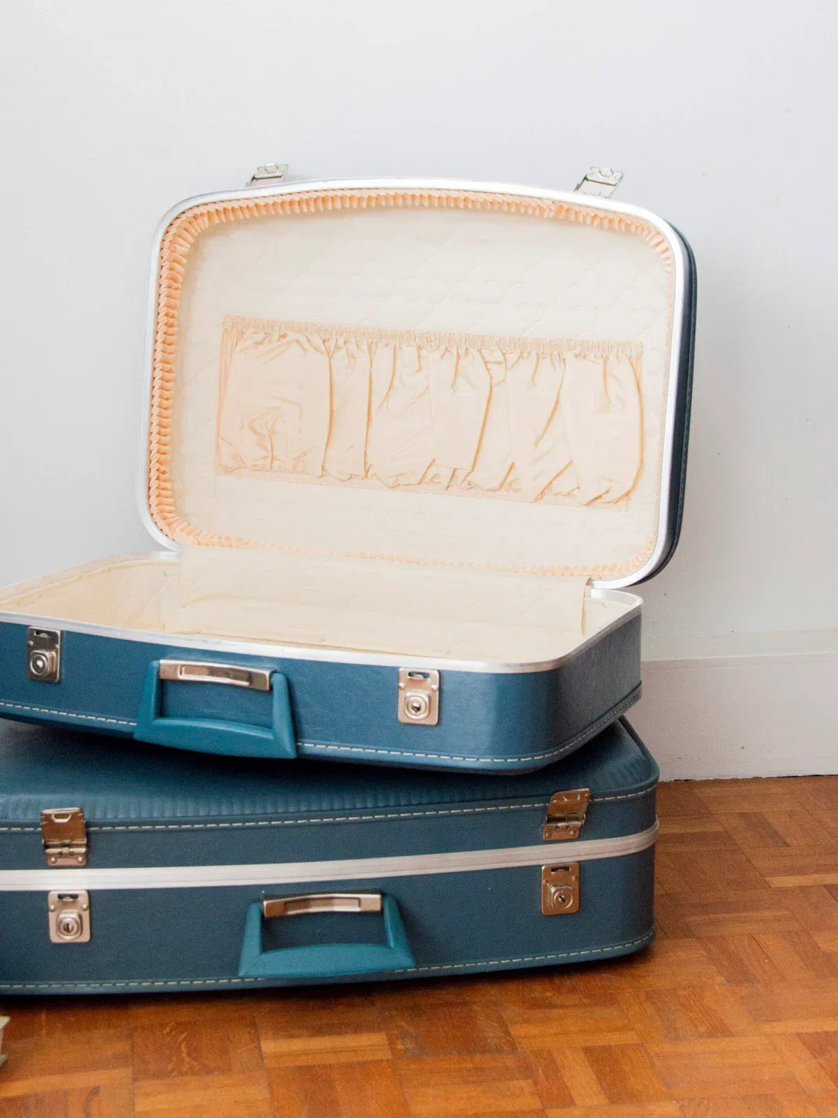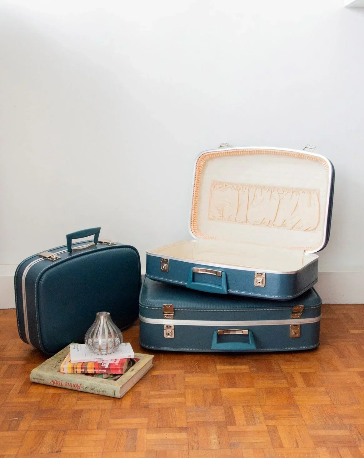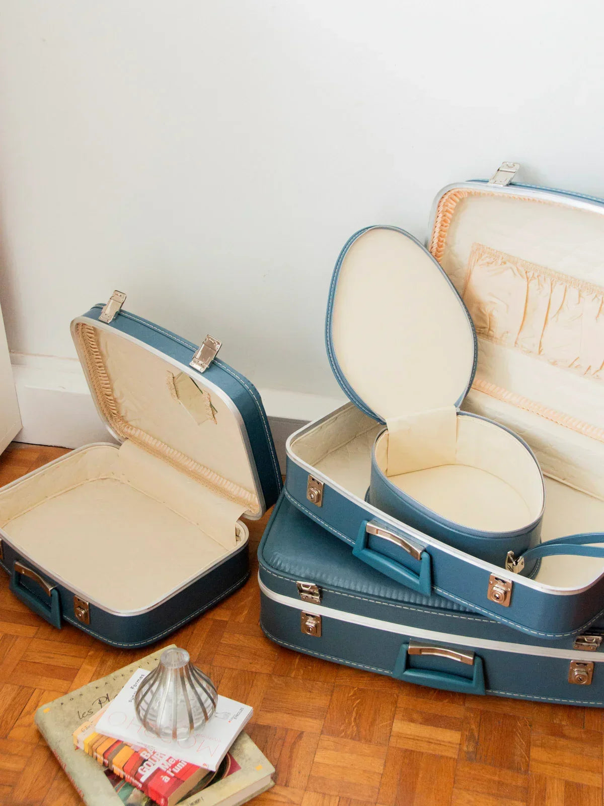 Découvrez un lot vintage des années 1960 composé de trois valises d'hôtesse de l'air et d'une boîte à chapeau en similicuir bleu, cerclées de métal et dotées de fermoirs à serrure (clés incluses). Leurs formats complémentaires offrent des capacités de rangement pratiques, tandis que les intérieurs capitonnés ivoire protègent chapeaux et accessoires — la petite valise intégrant un miroir. L'ensemble, au charme rétro sophistiqué, se prête autant au voyage qu'à une mise en scène décorative inspirée des années 60.