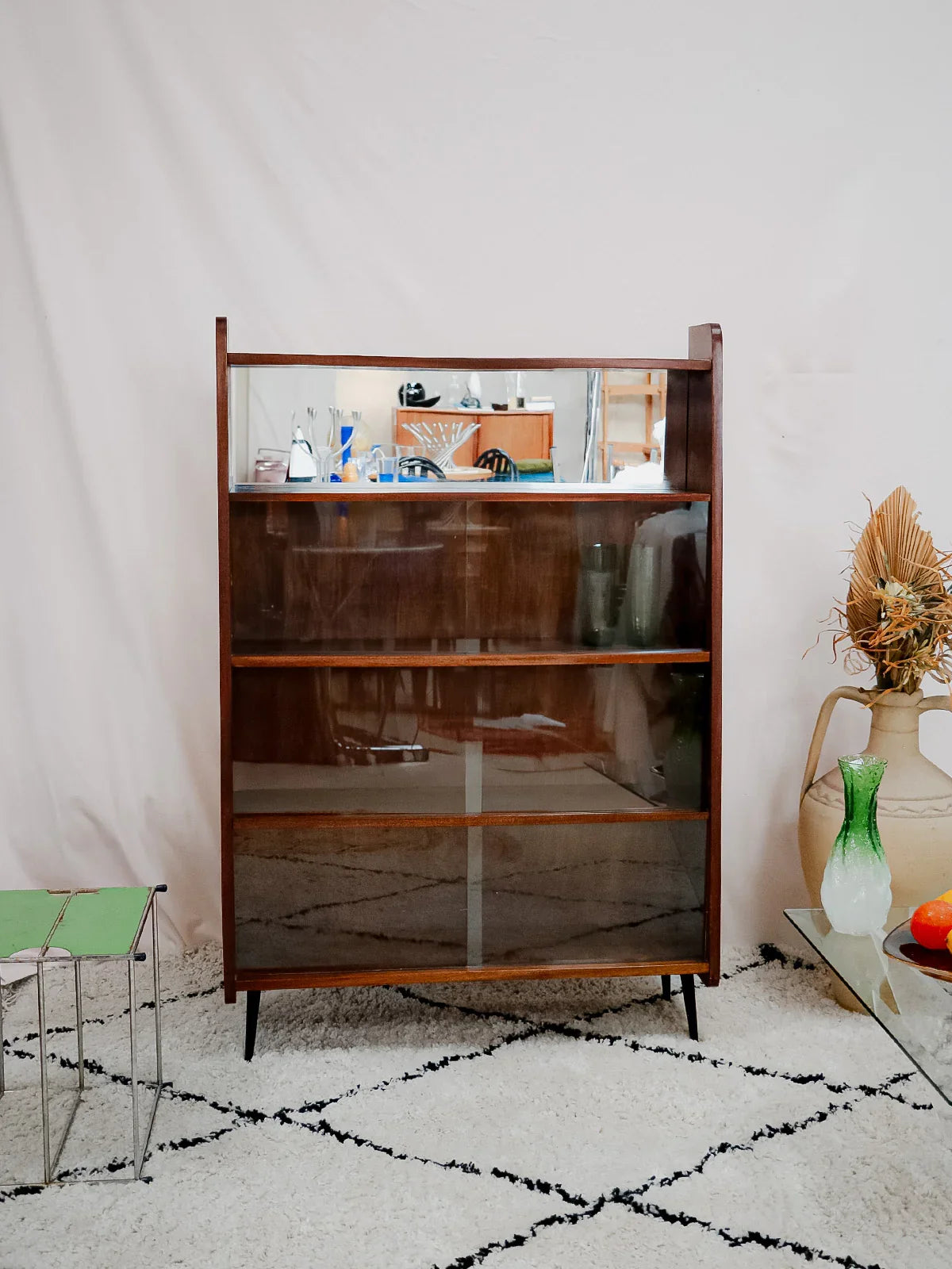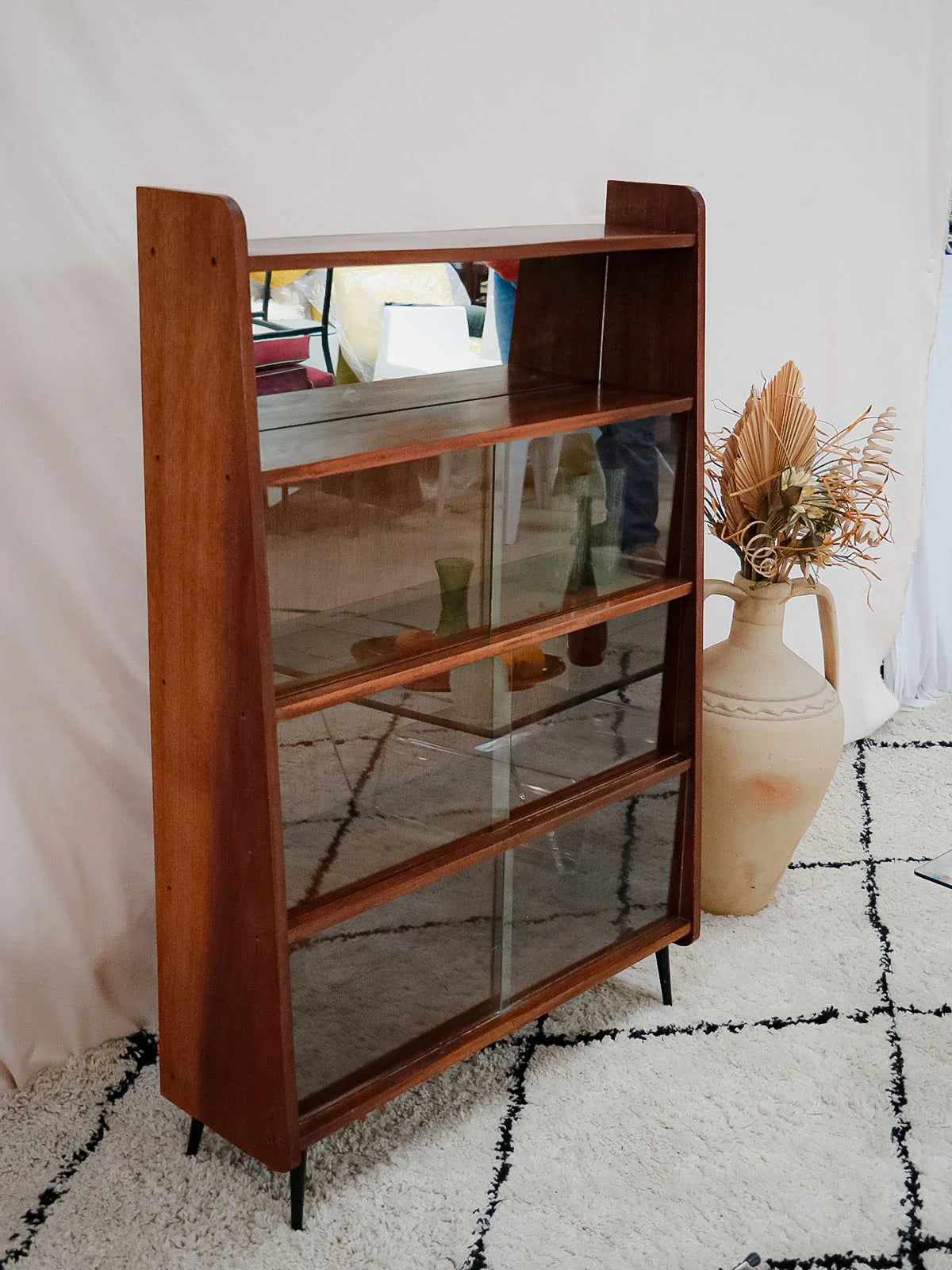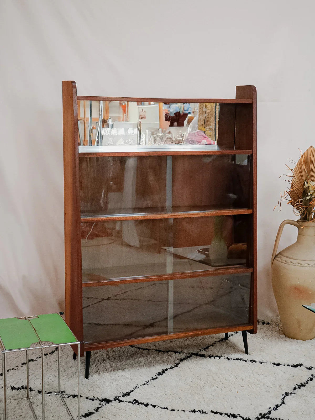 Découvrez cette bibliothèque des années 50 signée Fonteneau, habillée d'un plaquage acajou chaleureux et dessinée dans des proportions élancées qui s'intègrent facilement à un salon ou un bureau. Son agencement pratique, trois étagères avec vitrines et une étagère équipée d'un miroir, permet d'exposer livres et objets tout en jouant sur la profondeur ; les pieds en métal noir apportent une touche graphique et contemporaine. Une pièce française au charme discret, idéale pour une ambiance raffinée et contenue.