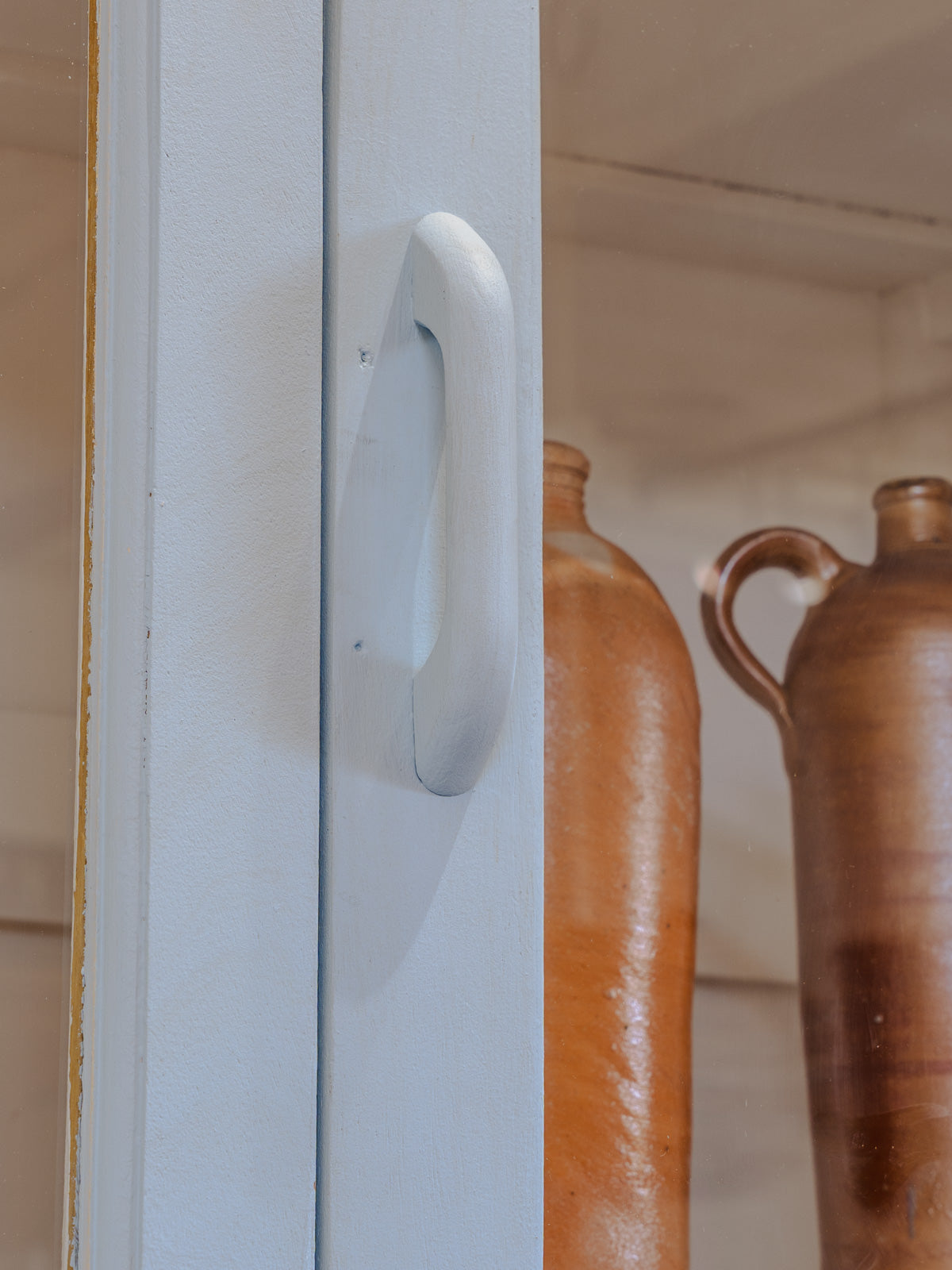 Découvrez cette paire de bibliothèques vitrées en manguier, peinte d'un bleu clair délicat et dotée d'une présence chaleureuse et élégante dans la pièce. Leur format offre une belle capacité de rangement : deux étagères vitrées en partie haute pour exposer livres et objets, et des placards bas munis d'une étagère intérieure et de poignées peintes pour un rangement discret. Possibles à assembler côte à côte, elles créent une ambiance sereine et raffinée, idéale pour salon ou bureau. Quelques traces du temps présentes.