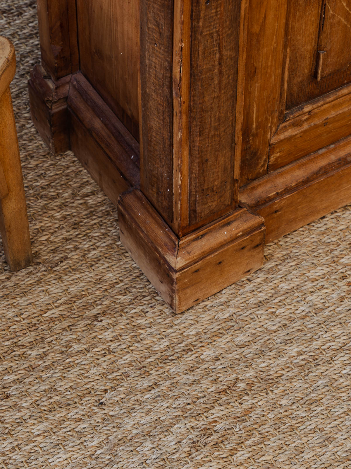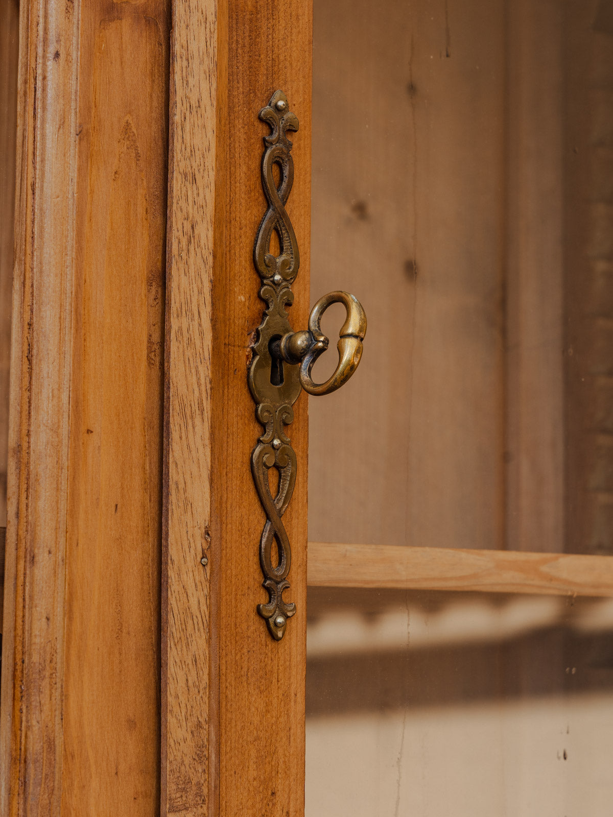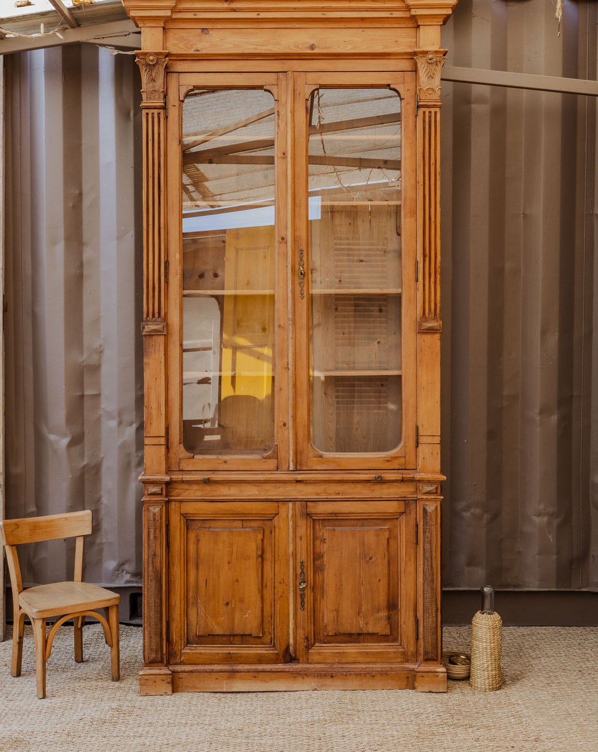 Découvrez cette vitrine en pitchpin, aux portes vitrées et au dessin floral délicat sur le haut qui lui confère une allure poétique et raffinée. Son format propose une belle capacité de rangement avec quatre étagères intérieures et un caisson bas doté d'une étagère à l'intérieur rayé bleu et blanc, tandis qu'un plateau central se tire grâce à des poignées métalliques pour un usage polyvalent. Deux serrures avec clés d'origine assurent son côté fonctionnel et sécurisé. Quelques traces du temps présentes qui racontent son histoire.