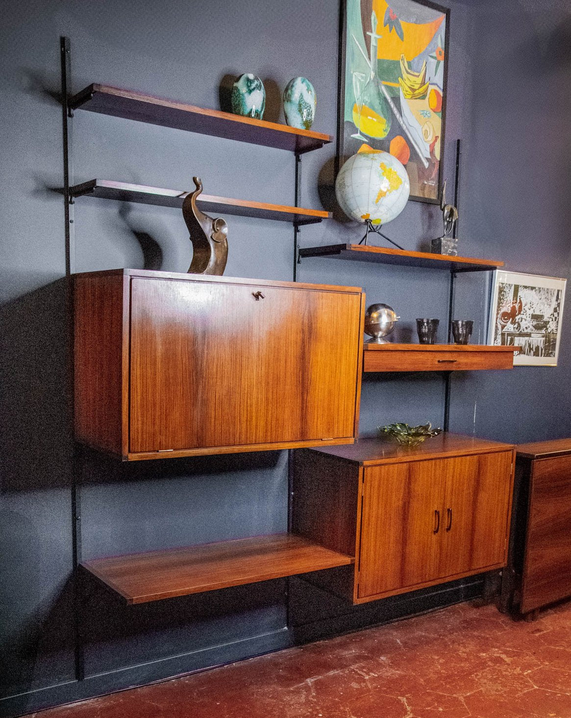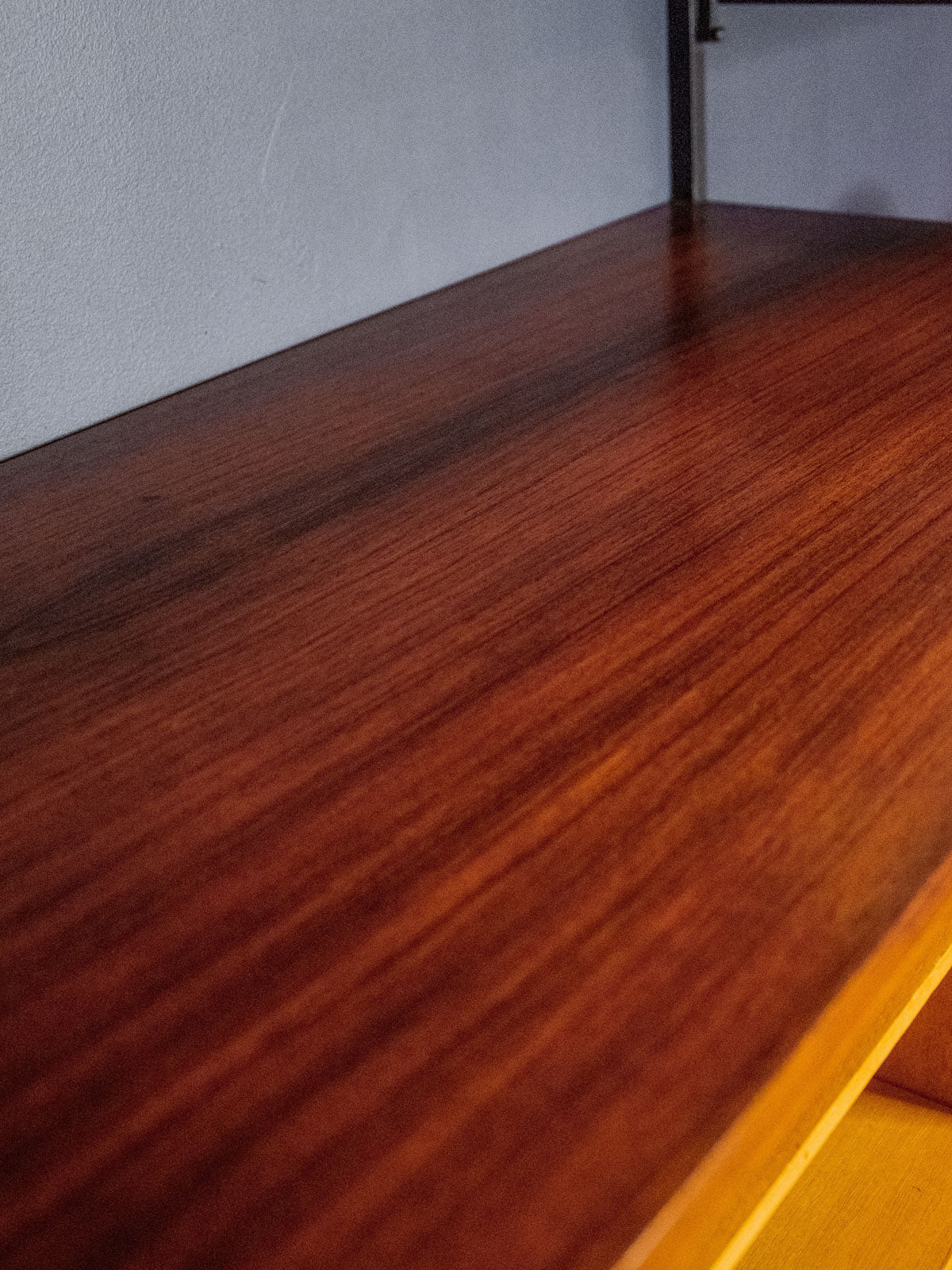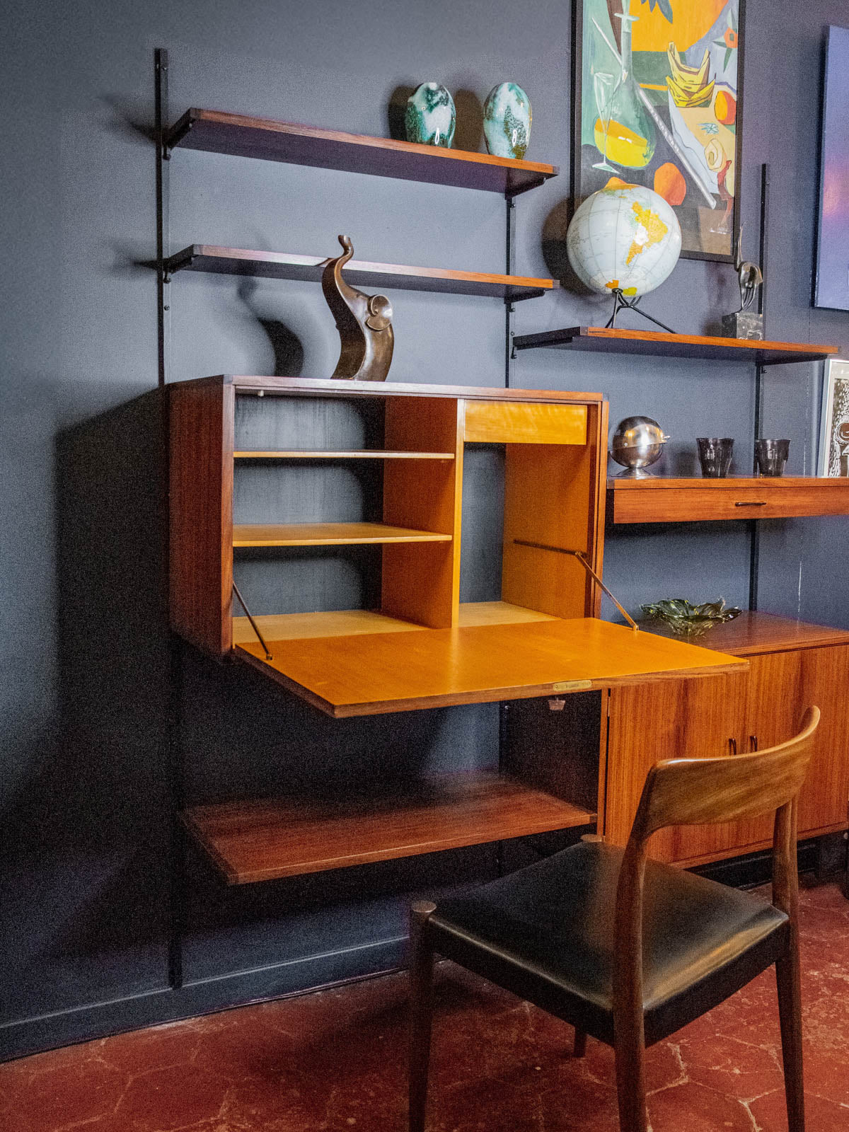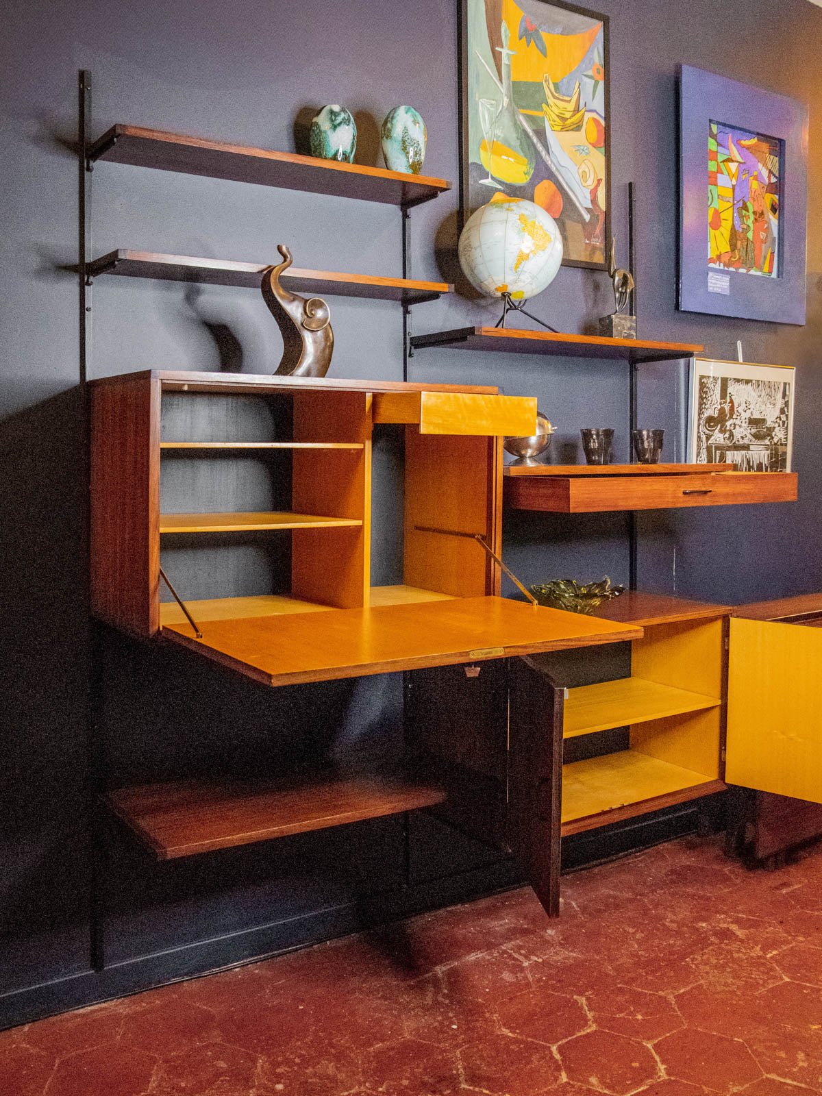 Adoptez cette bibliothèque murale modulable en palissandre, habillée d'une structure métallique qui allie noblesse du bois et esprit industriel. Ses cinq étagères, la double porte révélant une tablette, le tiroir et le compartiment secrétaire — lui-même doté d'un tiroir et d'étagères — offrent des rangements pensés pour exposer livres et objets tout en dissimulant bureau et documents. Sa silhouette équilibrée s'intègre aussi bien dans un séjour que dans un bureau, créant une ambiance chaleureuse et organisée.