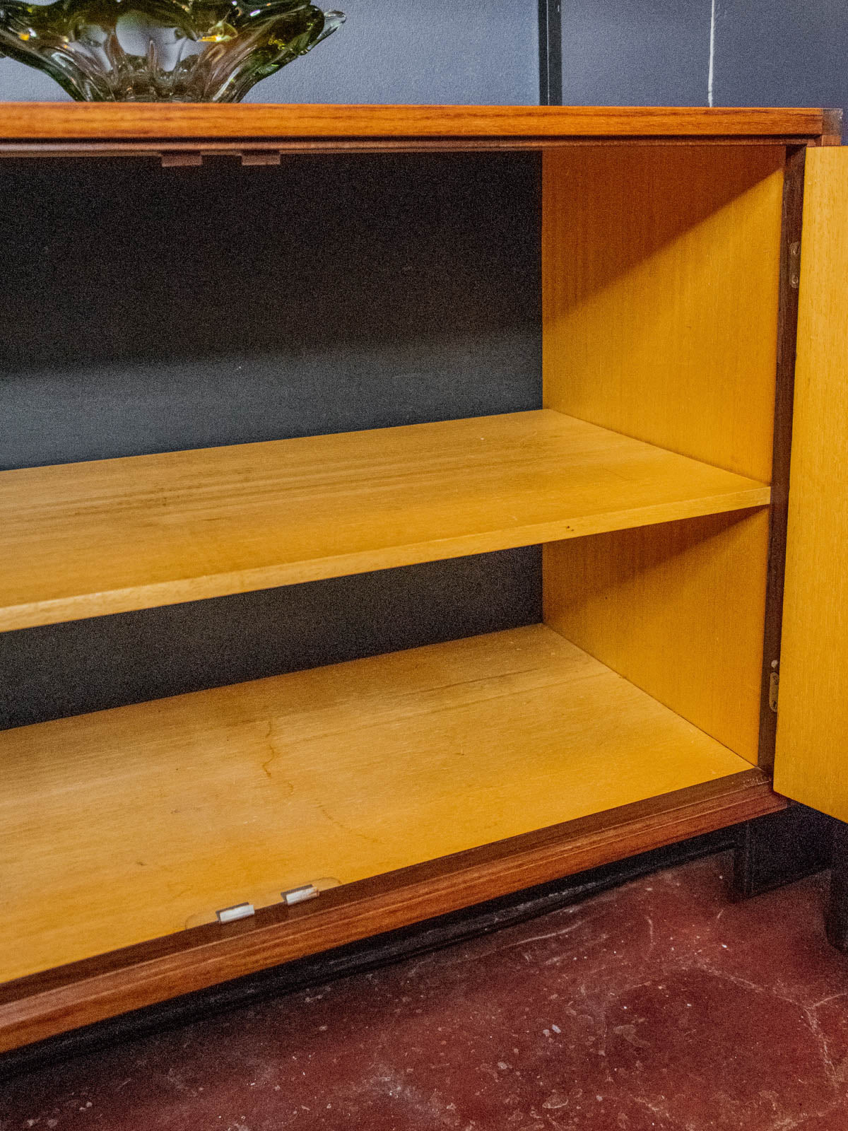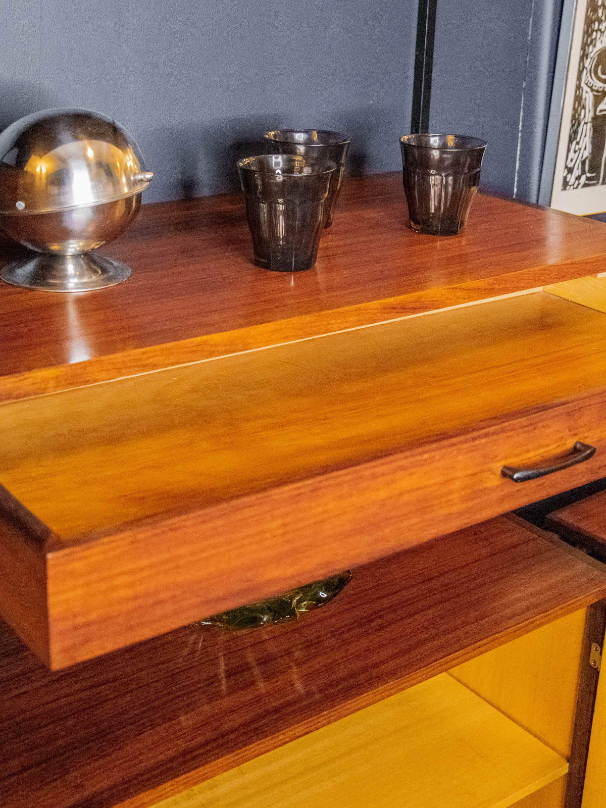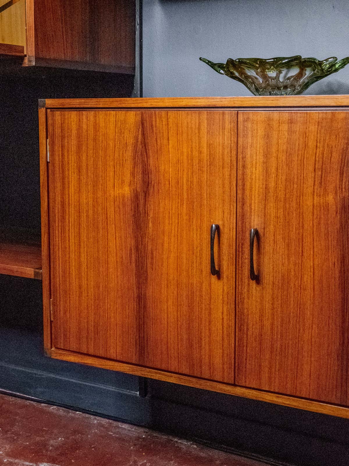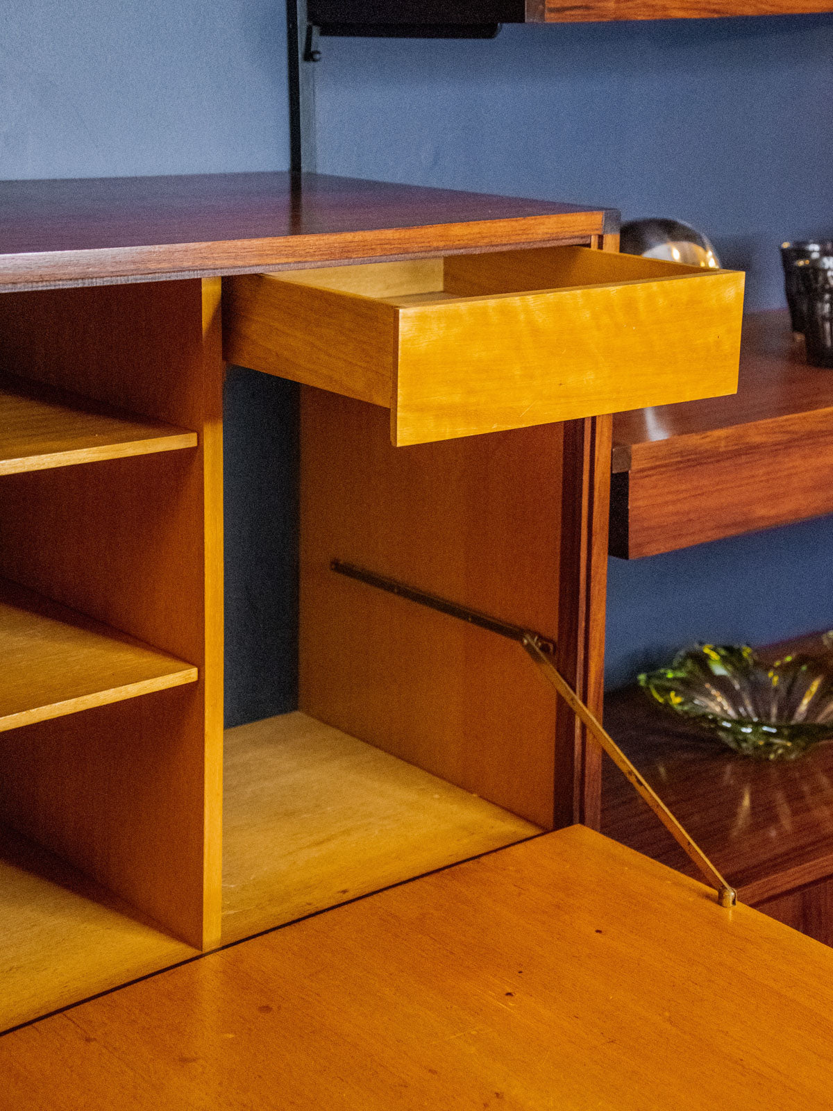 Adoptez cette bibliothèque murale modulable en palissandre, habillée d'une structure métallique qui allie noblesse du bois et esprit industriel. Ses cinq étagères, la double porte révélant une tablette, le tiroir et le compartiment secrétaire — lui-même doté d'un tiroir et d'étagères — offrent des rangements pensés pour exposer livres et objets tout en dissimulant bureau et documents. Sa silhouette équilibrée s'intègre aussi bien dans un séjour que dans un bureau, créant une ambiance chaleureuse et organisée.