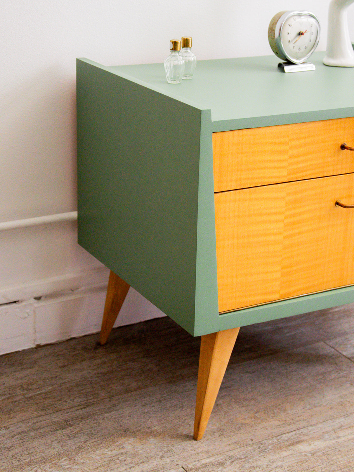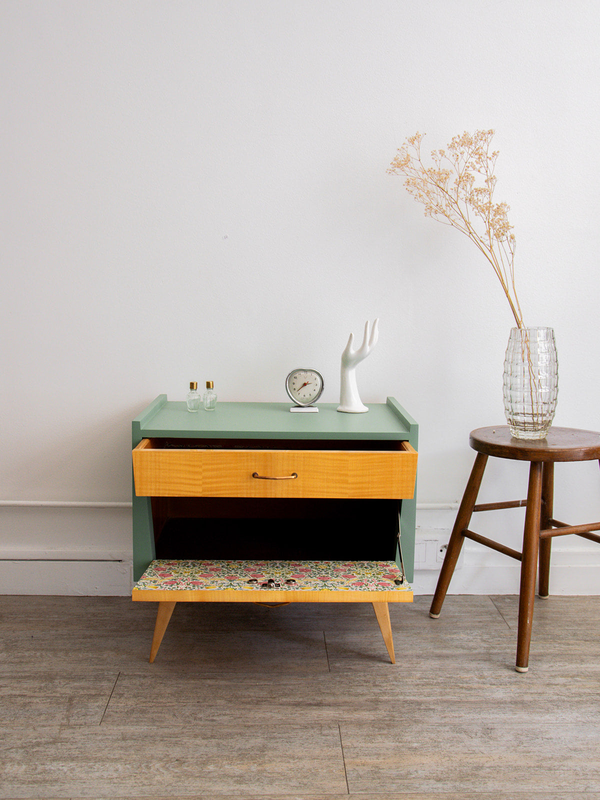 Apportez une touche d’élégance à votre chambre avec ce chevet vert en bois. Son tiroir laqué, agrémenté d’une poignée dorée, offre un espace de rangement pratique tout en ajoutant du style. La niche tapissée à l’intérieur et les pieds compas en bois brut complètent son allure moderne et chaleureuse. Idéal pour optimiser votre espace tout en restant chic, il s’intègre harmonieusement dans tout type de décoration.