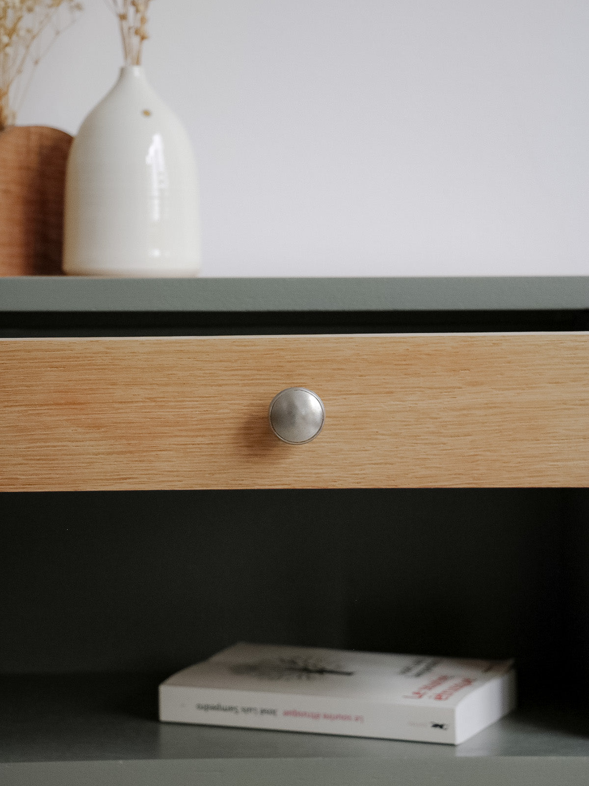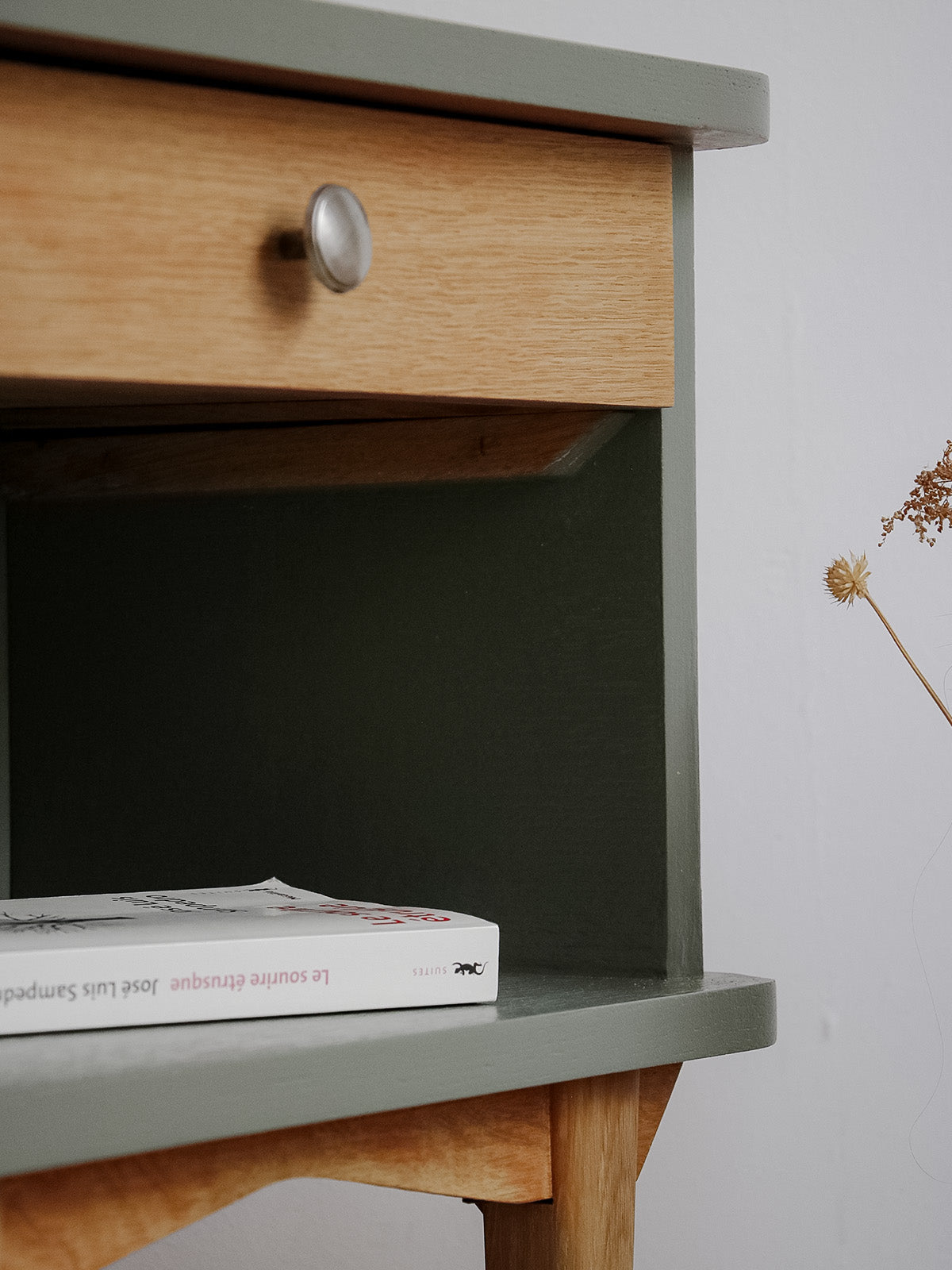 Ajoutez ce chevet restauré, peint dans le vert laurier, où le plaquage chêne diffuse une chaleureuse texture et un grain raffiné; doté d'un tiroir pratique et d'une niche pensée pour accueillir livres ou lampe de chevet, il associe rangement discret et proportions compactes adaptées aux petits espaces; son style sobre, entre modernité et patine soignée, installe une atmosphère apaisée et élégante dans la chambre ou un coin lecture.