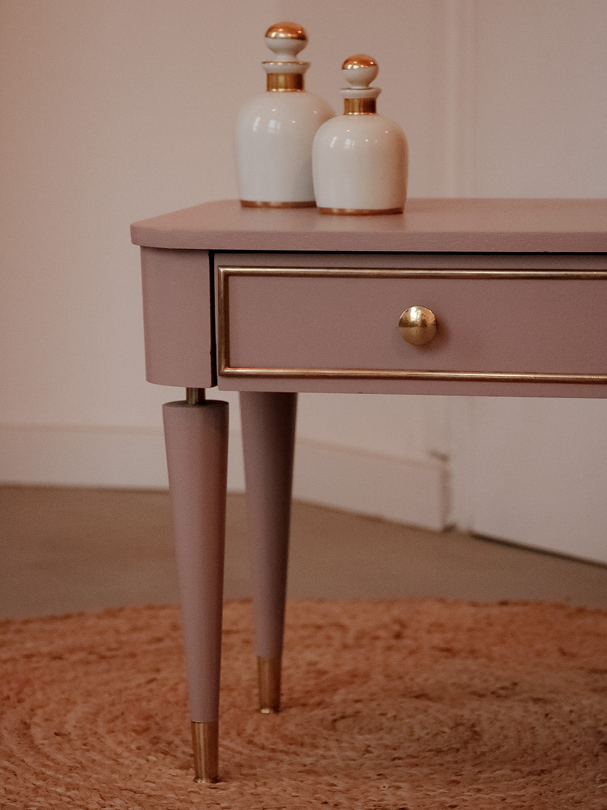 Adoptez ce petit chevet restauré entièrement dans un rose délicat, réalisé en bois et souligné d'une poignée en laiton qui apporte une touche chaleureuse et raffinée. Ses proportions compactes et son unique tiroir offrent un rangement discret pour vos indispensables de nuit, tandis que son plateau accueille lampe et livres sans encombrer l'espace. Idéal pour une chambre au décor doux, il insuffle une atmosphère tendre et soignée.