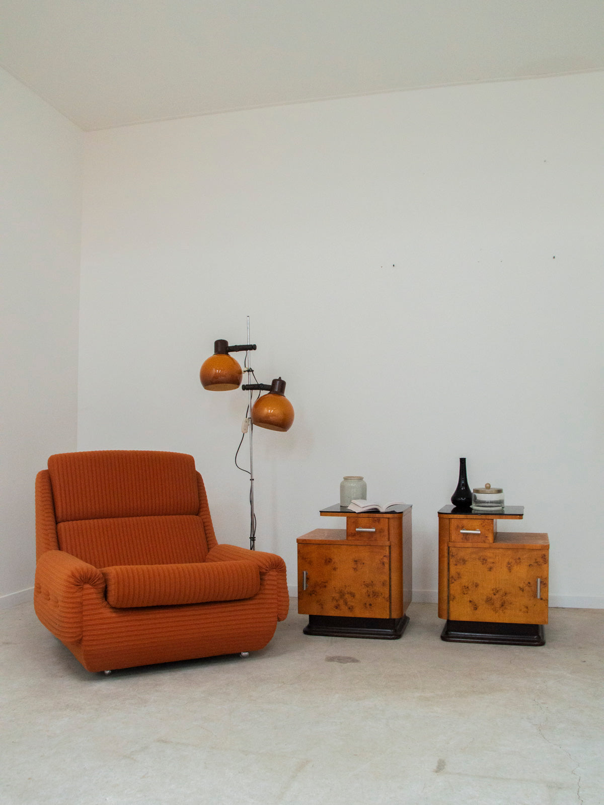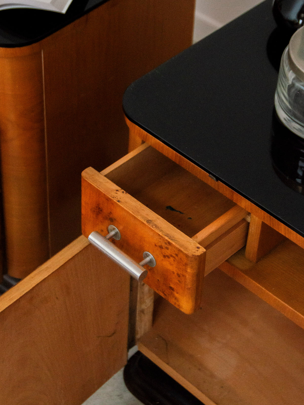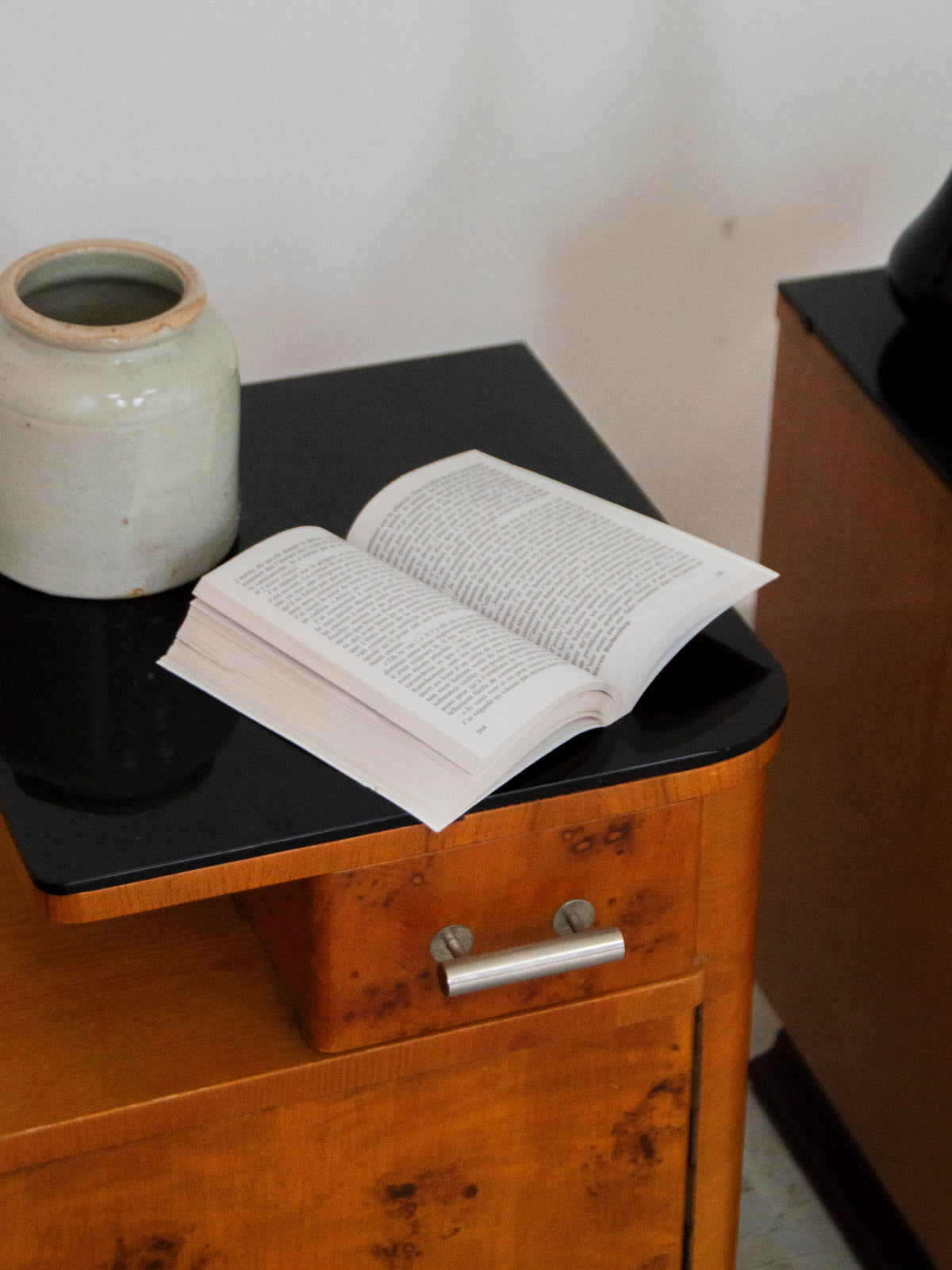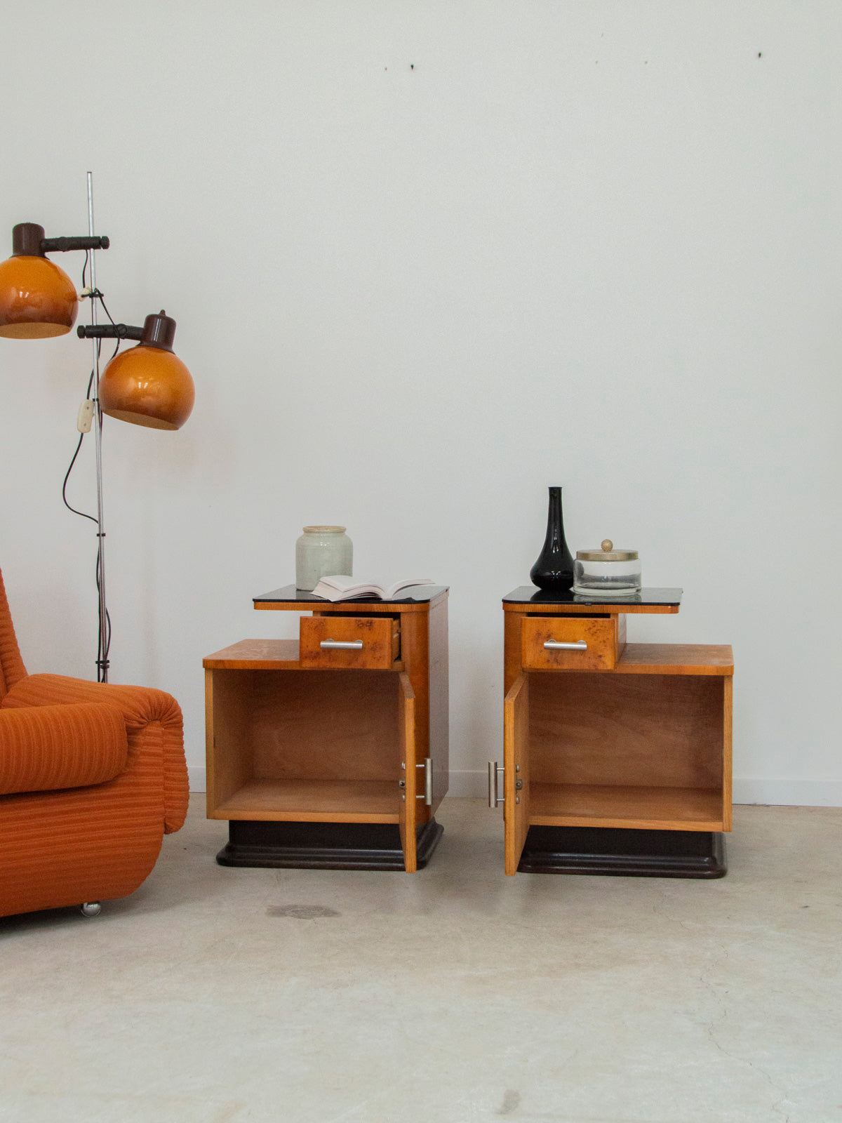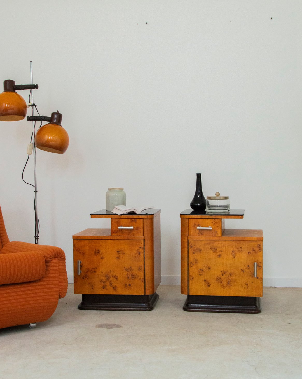 Sublimez votre chambre avec cette paire de chevets en bois clair à la loupe, délicatement tachetée, qui apporte une texture chaleureuse et singulière. Le plateau en verre noir posé en surface crée un contraste graphique et protège le bois, tandis qu'un tiroir et un placard offrent un rangement discret pour vos essentiels de nuit. Le grand pied et la construction massive assurent une assise stable et de belles proportions, idéale pour une atmosphère élégante et contemporaine.