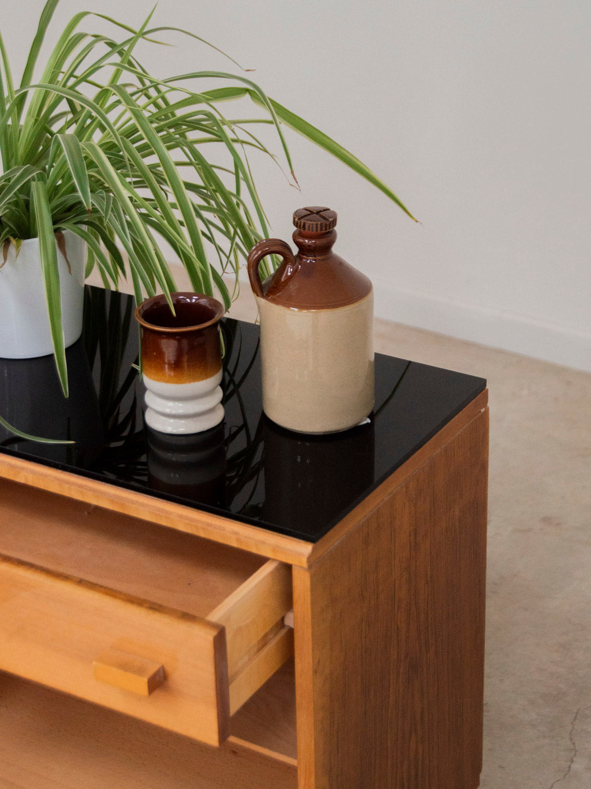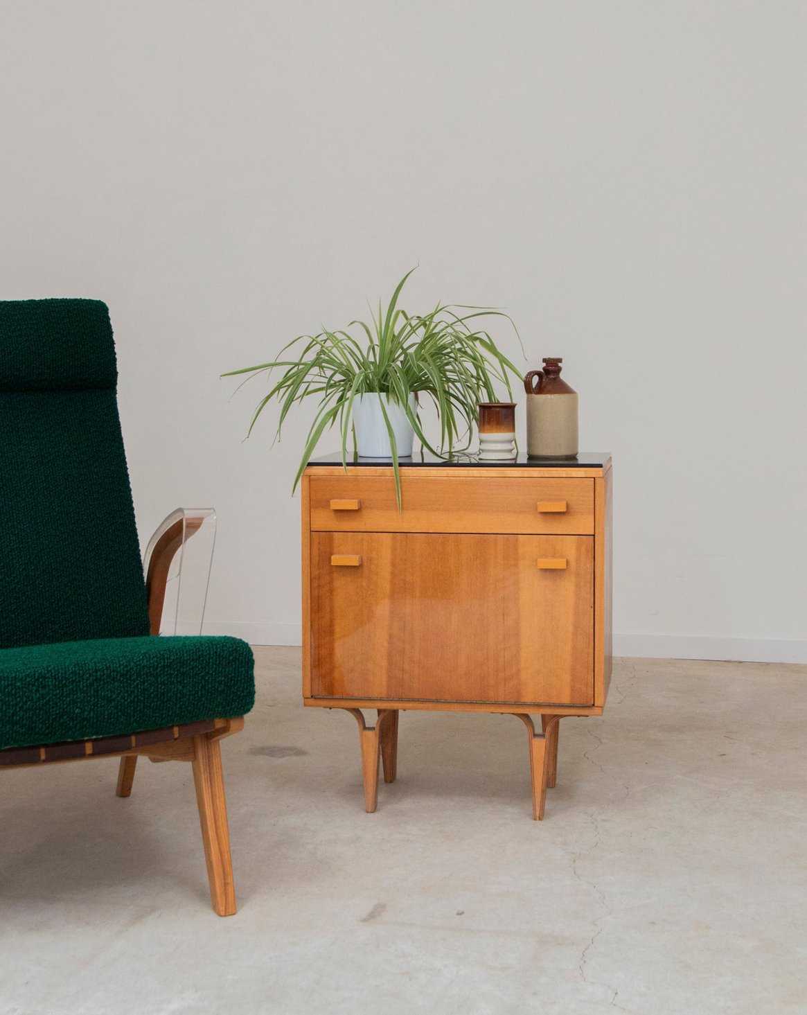 Découvrez ce petit chevet en bois clair au plateau en verre noir, alliant simplicité contemporaine et élégance discrète. Son tiroir pratique et son placard rabattant équipé d'une tablette intérieure offrent un rangement soigné pour livres, chargeurs ou linge, pensé pour les proportions compactes d'une chambre ou d'une entrée. Le contraste du bois lumineux et du verre sombre crée une atmosphère raffinée et apaisante, idéale pour harmoniser un intérieur minimaliste ou plus chaleureux.