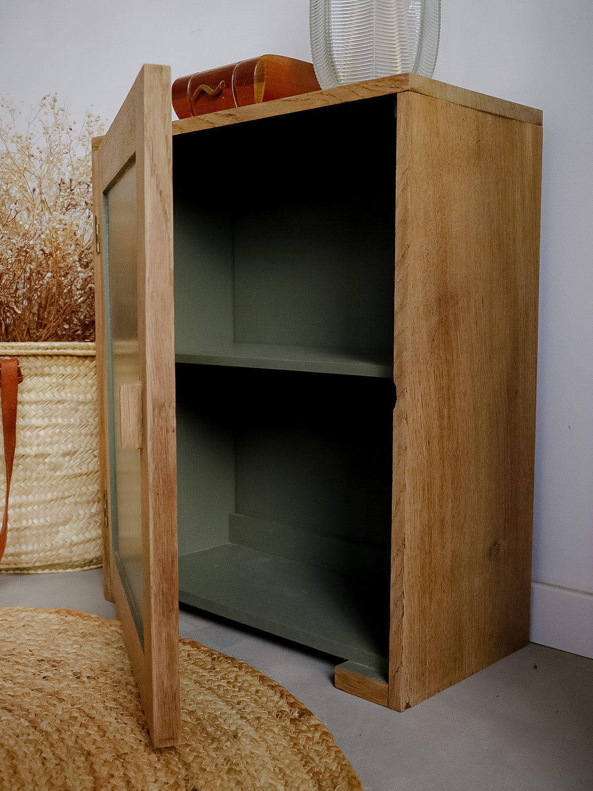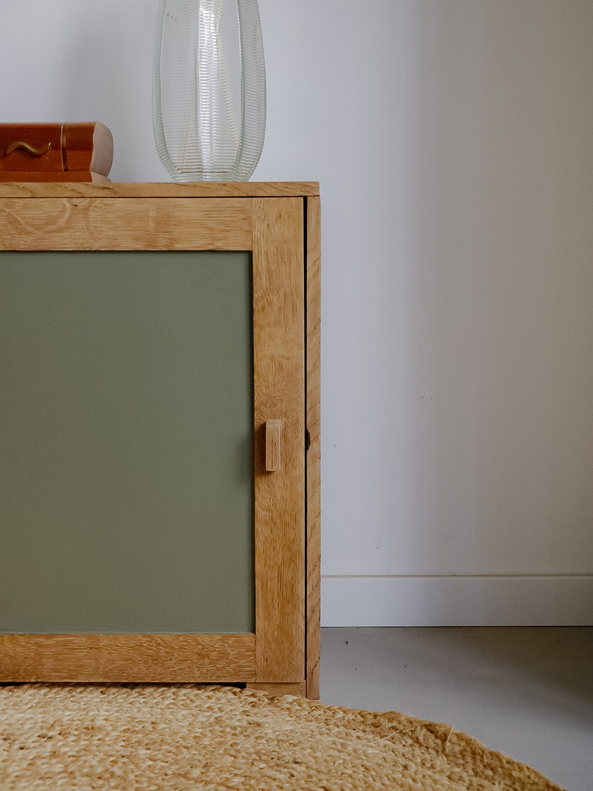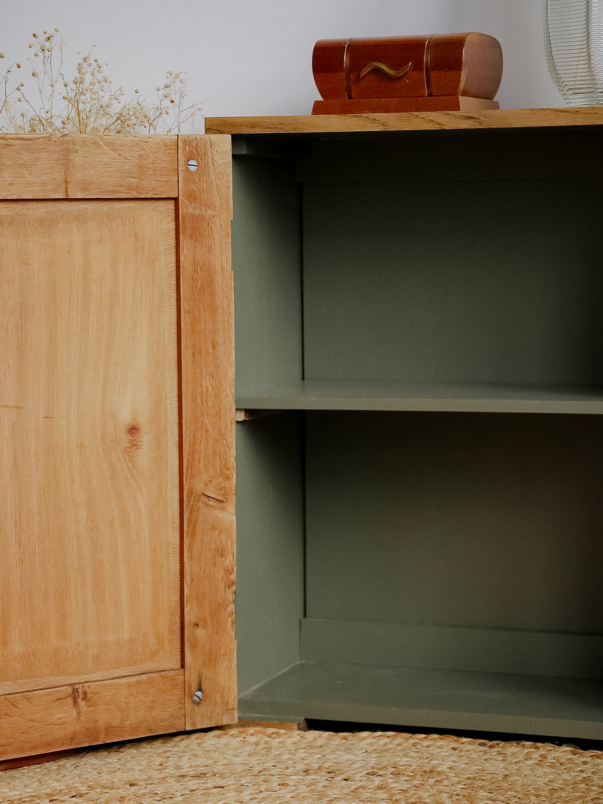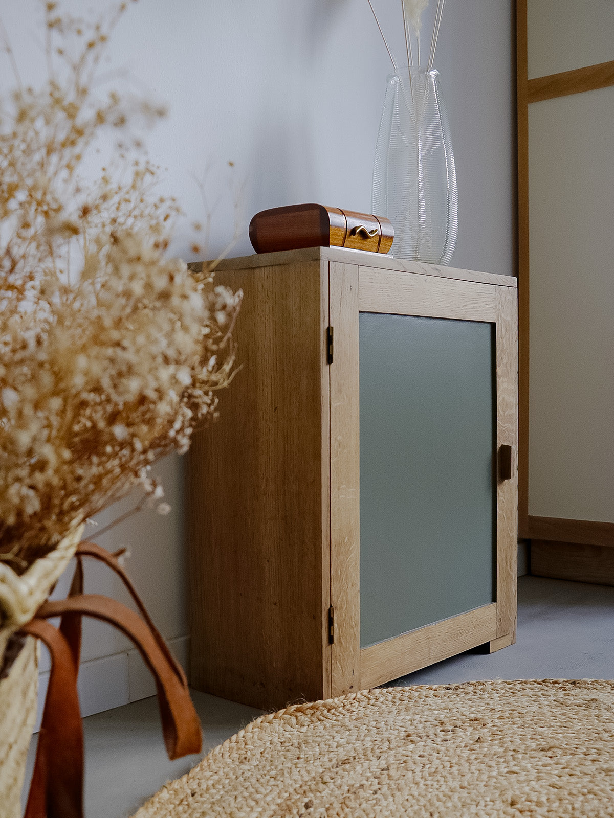 Apportez une note chaleureuse et naturelle à votre chambre avec ce chevet en chêne massif, doté d'une porte restaurée en vert et d'une étagère intérieure soulignée de la même teinte. Sa silhouette compacte propose un rangement malin pour livres et objets du quotidien, tandis que la finition bois met en valeur la matière et la durabilité. Il conjugue fonctionnalité et élégance discrète pour une ambiance accueillante et apaisée.