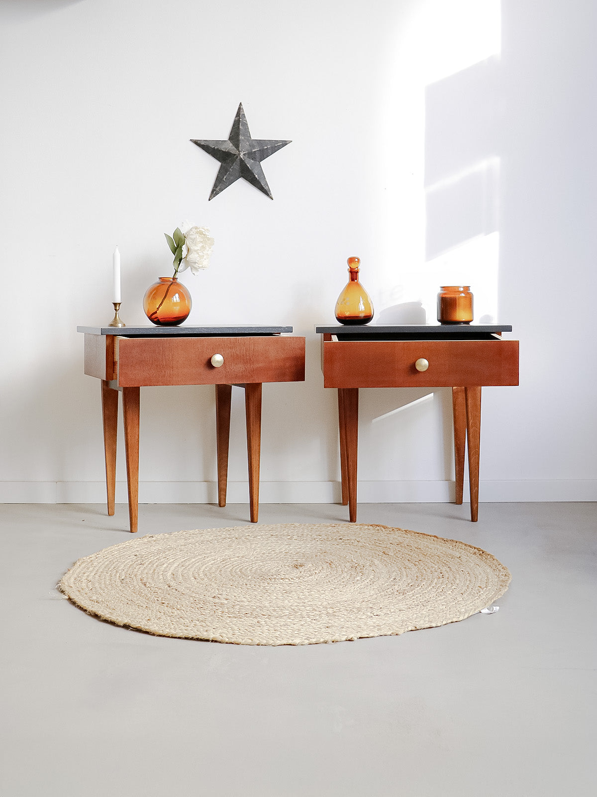 Sublimez votre chambre avec cette paire de chevets des années 70 en bois, où un plateau noir restauré dialogue avec un empiètement en plaquage chêne pour une allure à la fois sobre et chaleureuse. Chaque meuble propose un tiroir pratique agrémenté de poignées en laiton, offrant un rangement discret pour vos indispensables de nuit. Leur proportions compactes les rendent faciles à intégrer pour une ambiance vintage et raffinée.