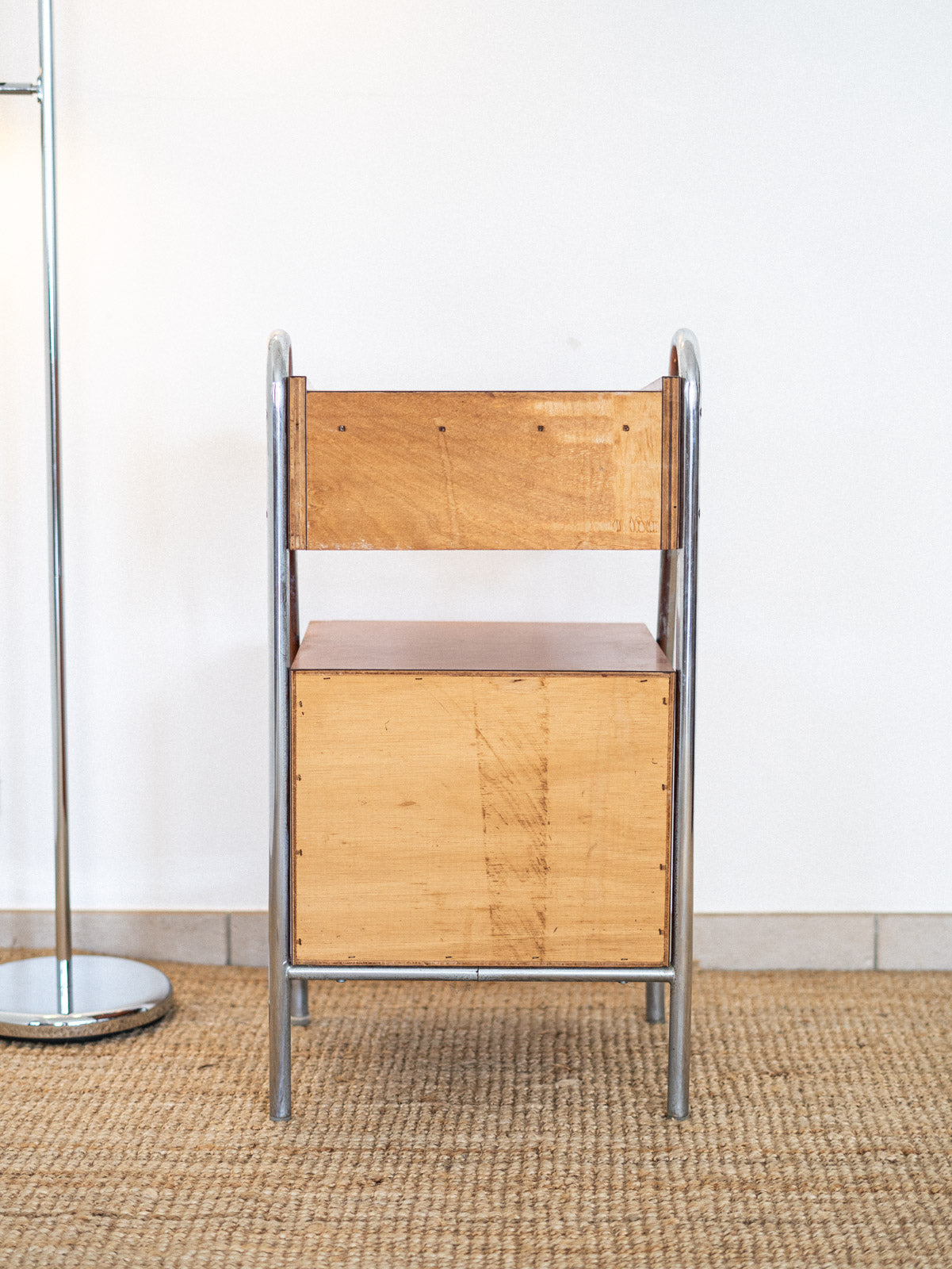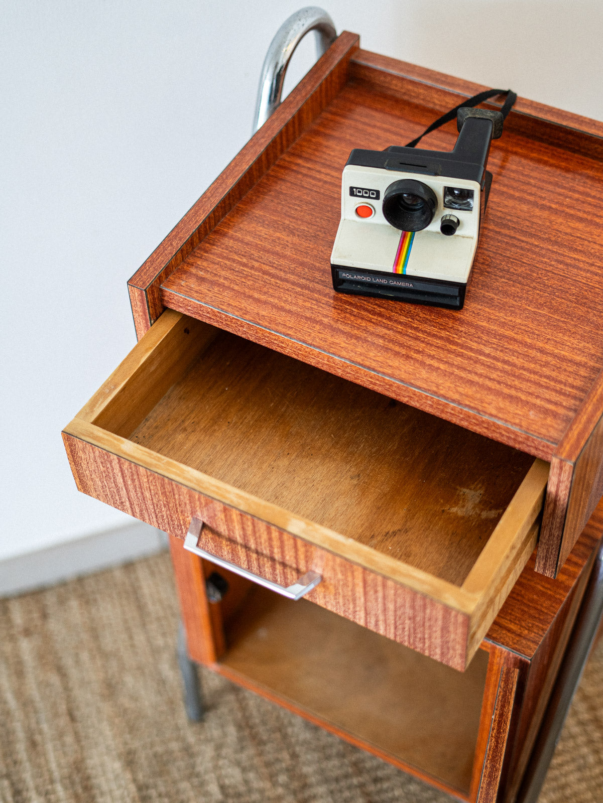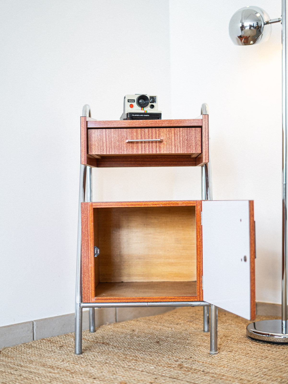 Adoptez cette table de chevet d'internat des années 60 alliant métal chromé et plateau en formica. Ses lignes industrielles et ses proportions élancées offrent un rangement pensé avec un tiroir et une porte pour garder livres et objets à portée de main. La poignée en métal chromé souligne le caractère utilitaire et apporte une note rétro, idéale dans une chambre, un bureau ou une entrée au style sobre et chaleureux.
