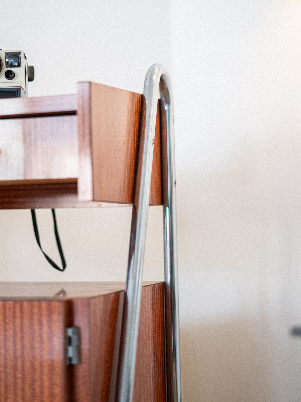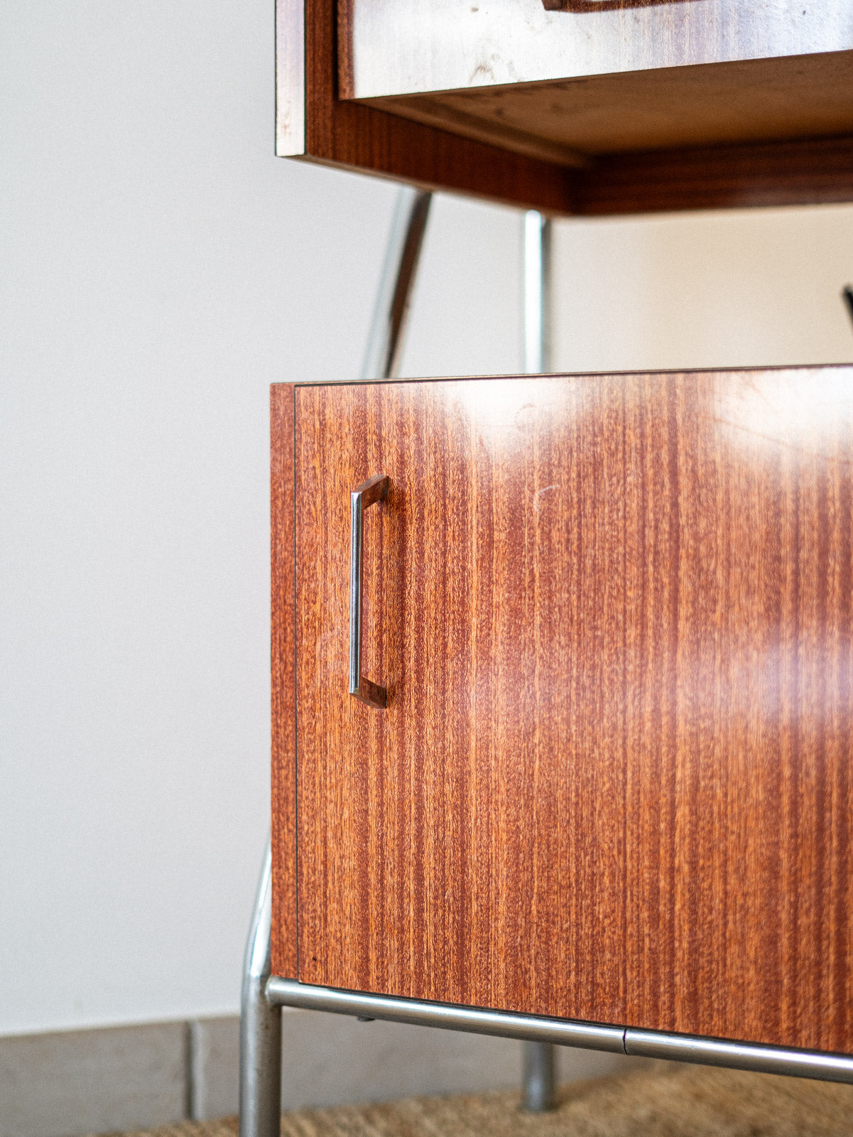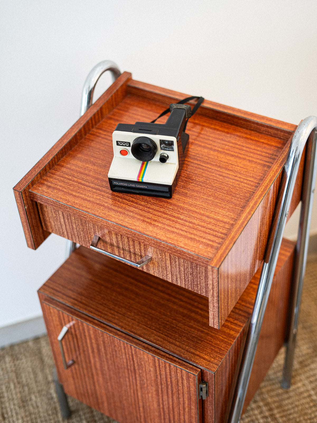 Adoptez cette table de chevet d'internat des années 60 alliant métal chromé et plateau en formica. Ses lignes industrielles et ses proportions élancées offrent un rangement pensé avec un tiroir et une porte pour garder livres et objets à portée de main. La poignée en métal chromé souligne le caractère utilitaire et apporte une note rétro, idéale dans une chambre, un bureau ou une entrée au style sobre et chaleureux.