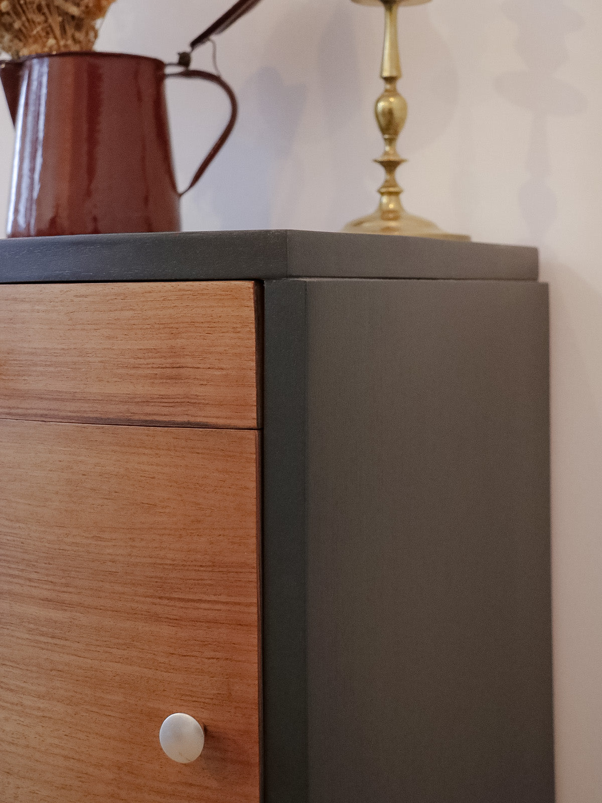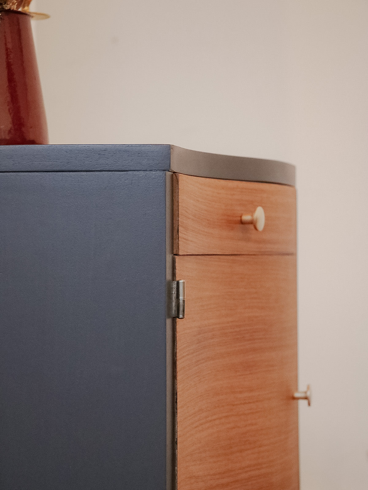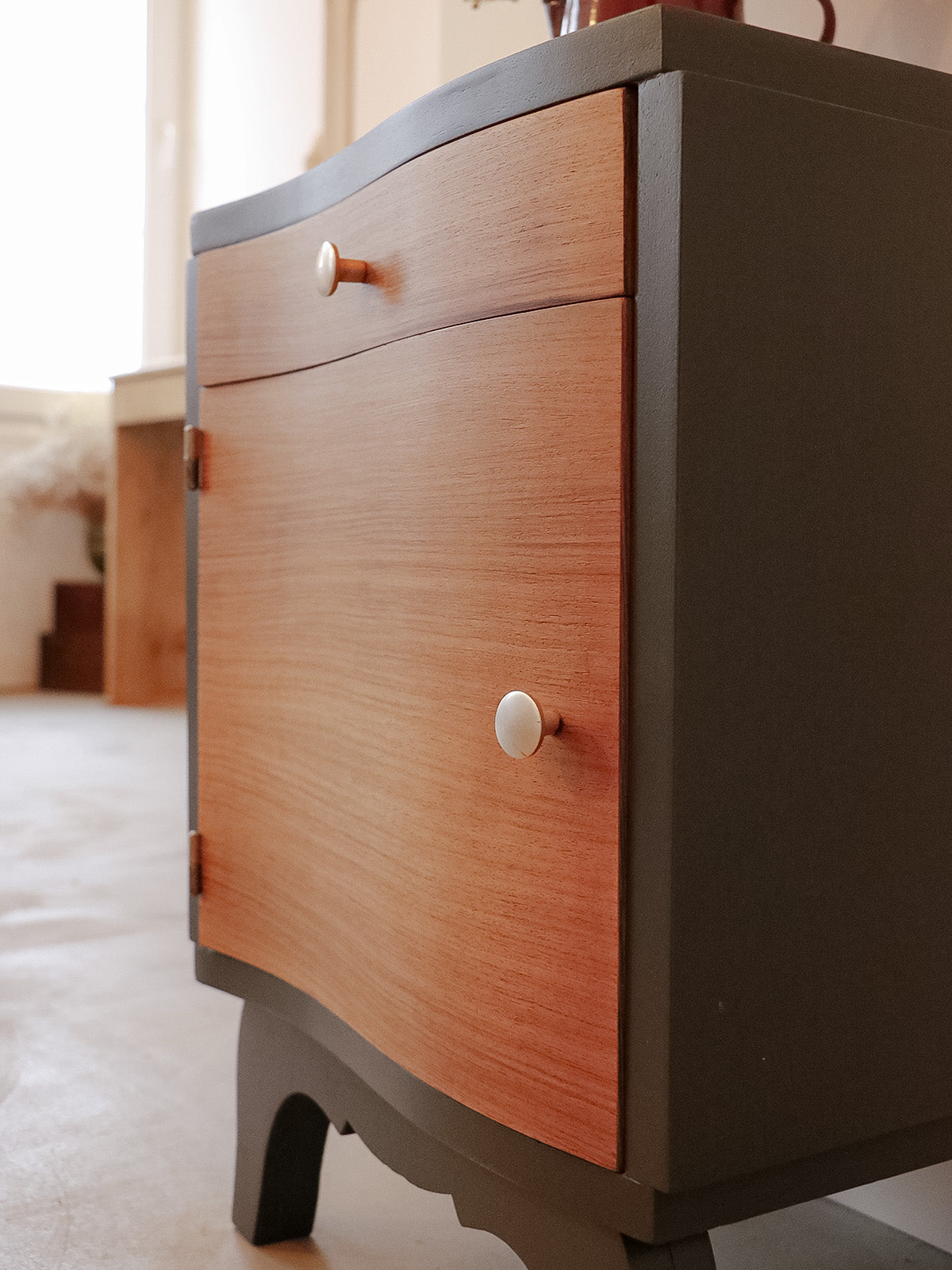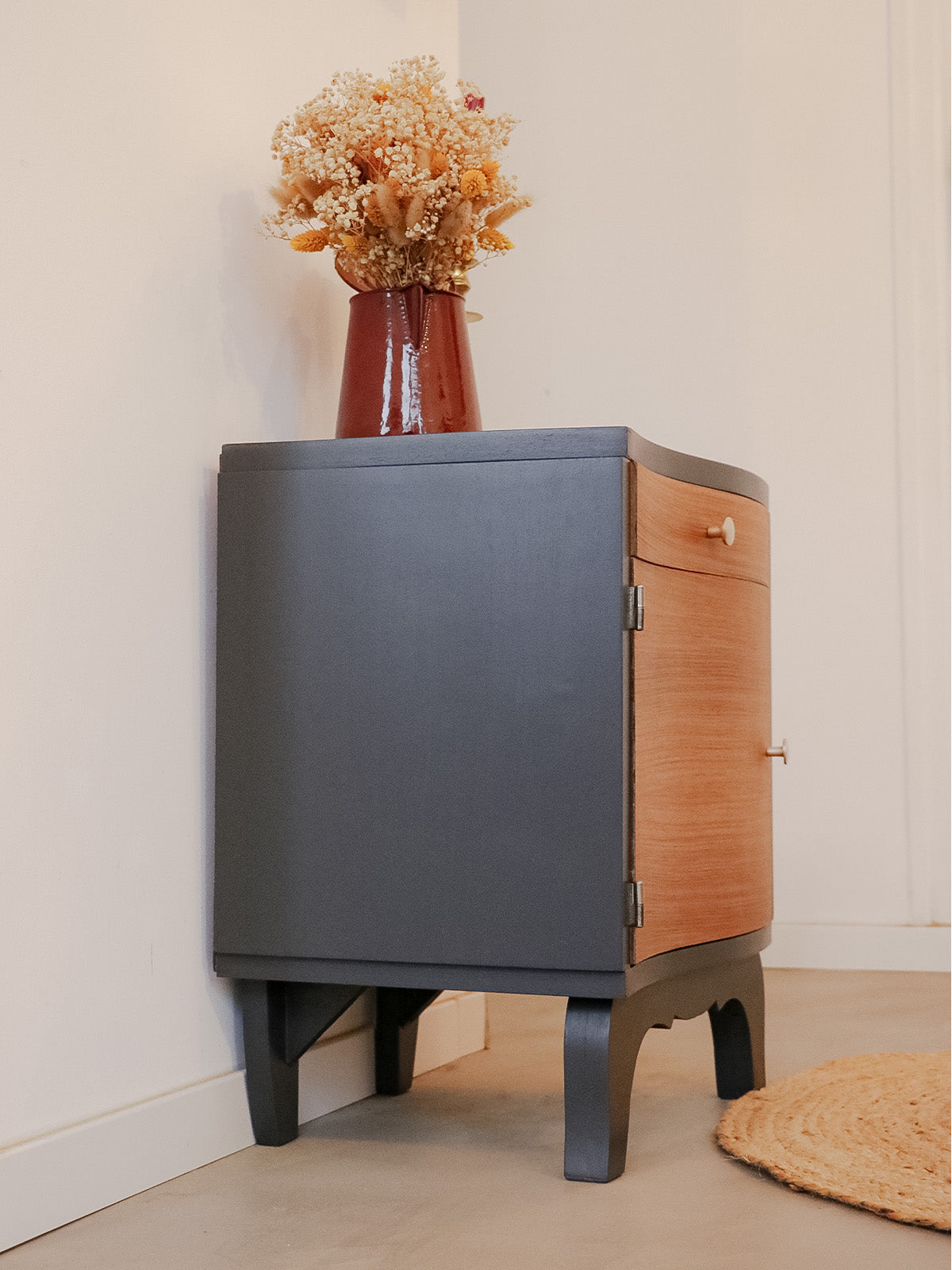 Sublimez votre chambre avec ce chevet des années 40/50 en bois courbé et plaquage teck, habillé d'une teinte « Off black » qui lui confère une élégance sobre et contemporaine. Poncé avec soin et reverni, il présente une surface lisse et une patine raffinée ; son tiroir accueille les petits objets du quotidien tandis que le placard offre un rangement discret pour livres ou lampe. Compact et distingué, il installe une note rétro chaleureuse dans votre intérieur.