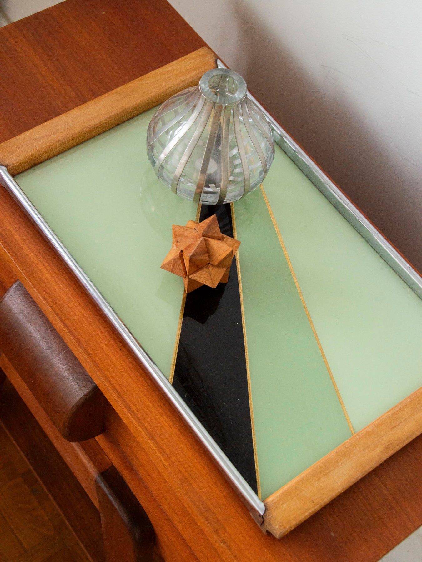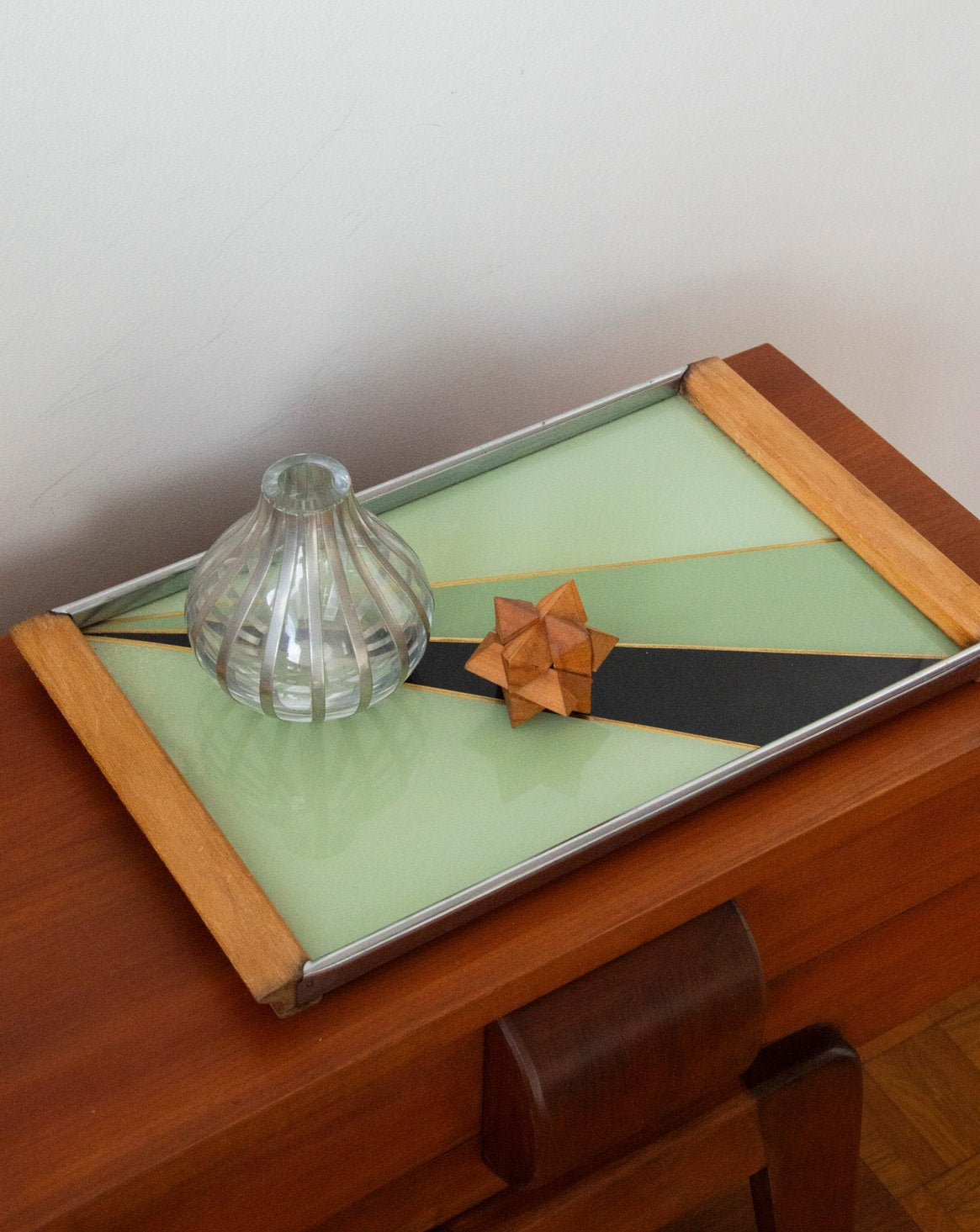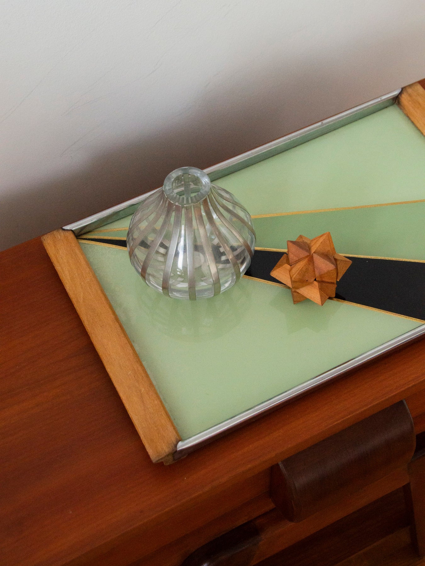 Sublimez votre table avec ce plateau Art Déco italien en verre, bois blond et métal, dont le décor géométrique est souligné d'un liseré doré. Sa surface généreuse et ses proportions équilibrées accueillent un service élégant ou se prêtent à l'usage décoratif, plateau d'apéritif ou centre de table. La palette de verts clair et foncé associée au noir et à la chaleur du bois crée une atmosphère raffinée et graphique.