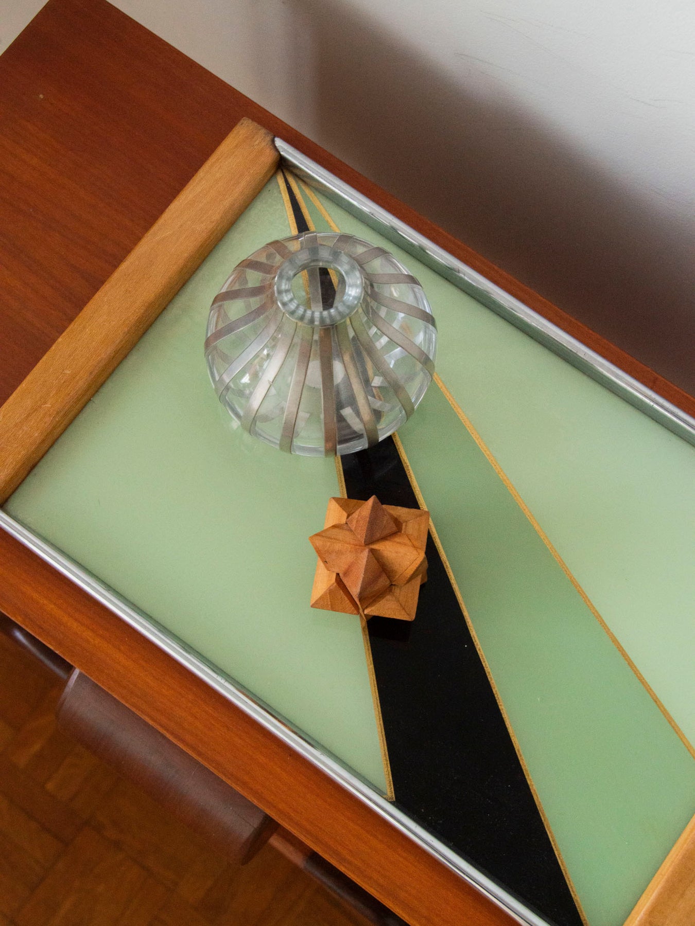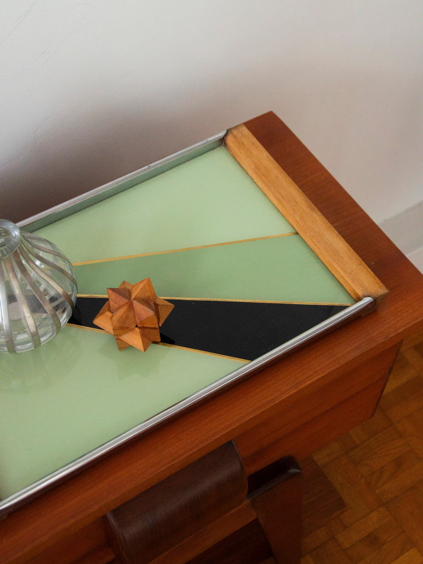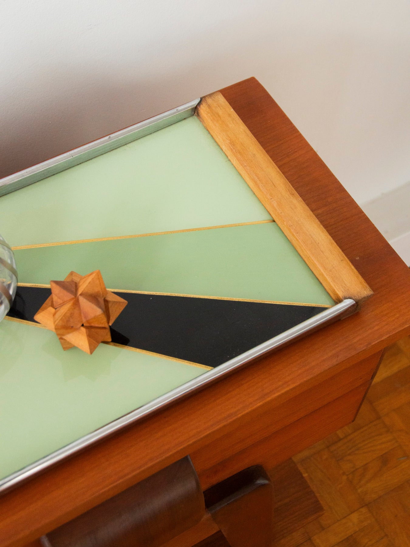 Sublimez votre table avec ce plateau Art Déco italien en verre, bois blond et métal, dont le décor géométrique est souligné d'un liseré doré. Sa surface généreuse et ses proportions équilibrées accueillent un service élégant ou se prêtent à l'usage décoratif, plateau d'apéritif ou centre de table. La palette de verts clair et foncé associée au noir et à la chaleur du bois crée une atmosphère raffinée et graphique.