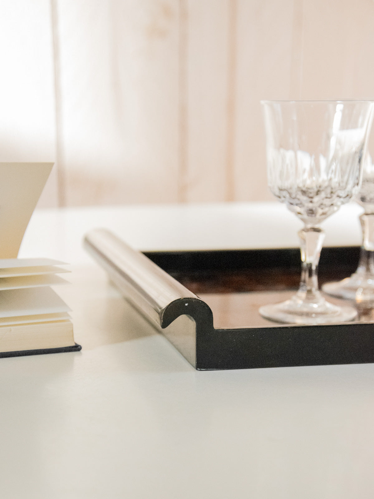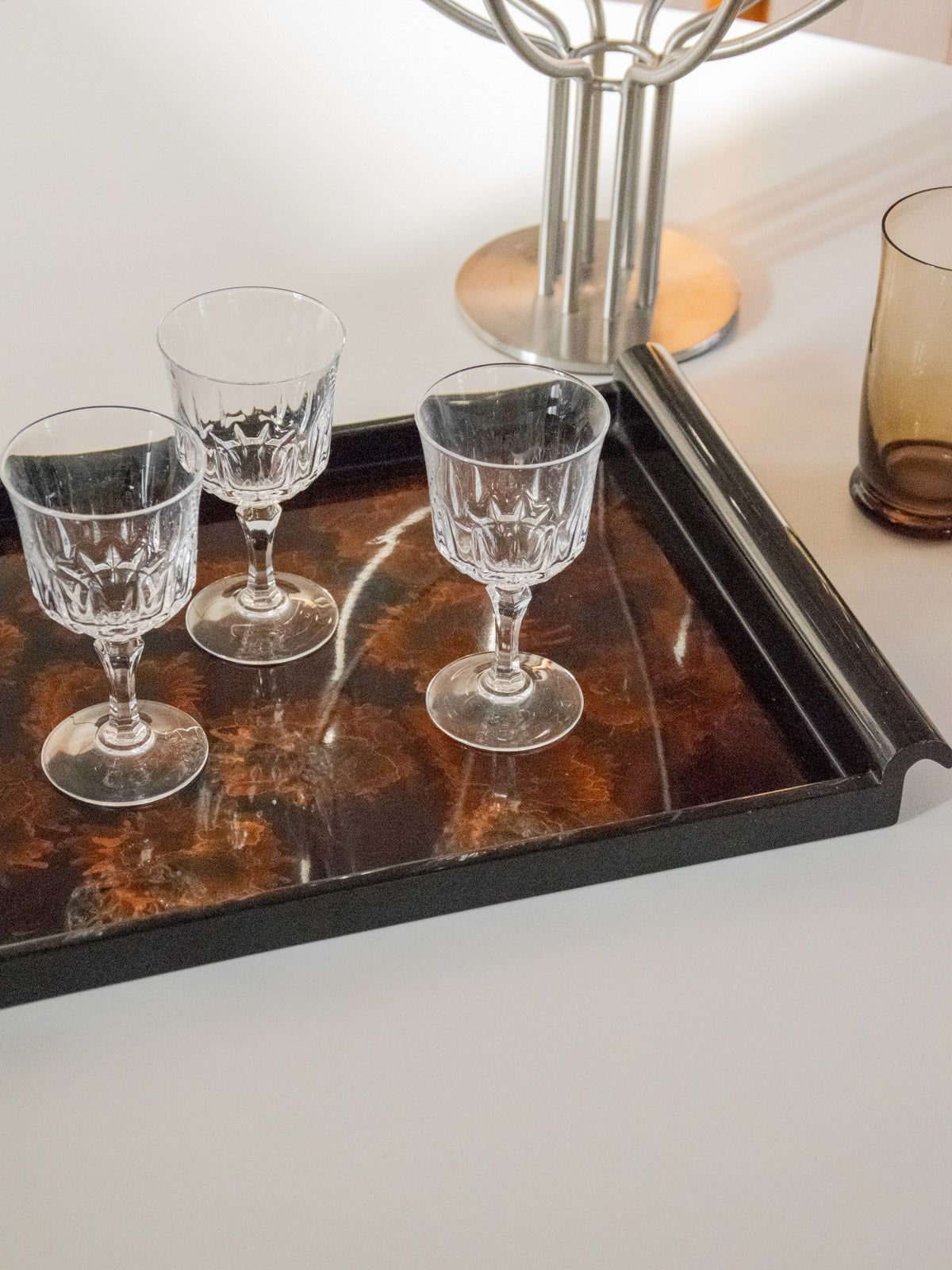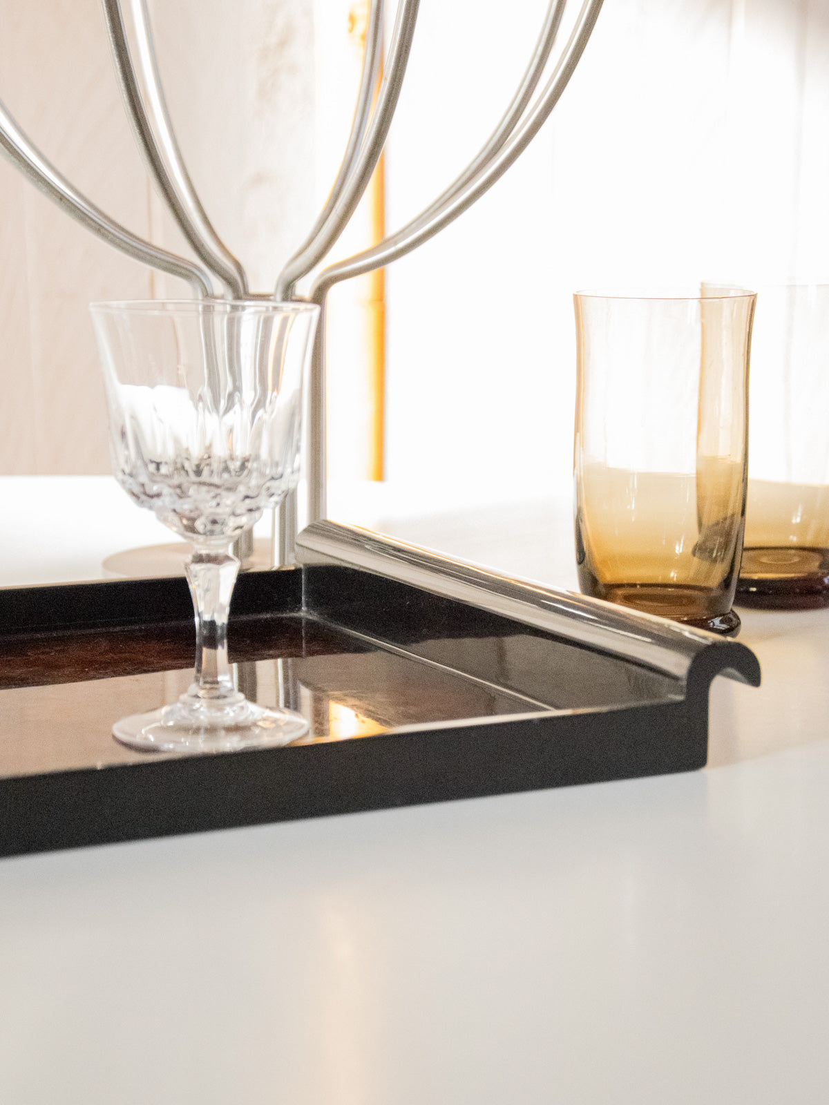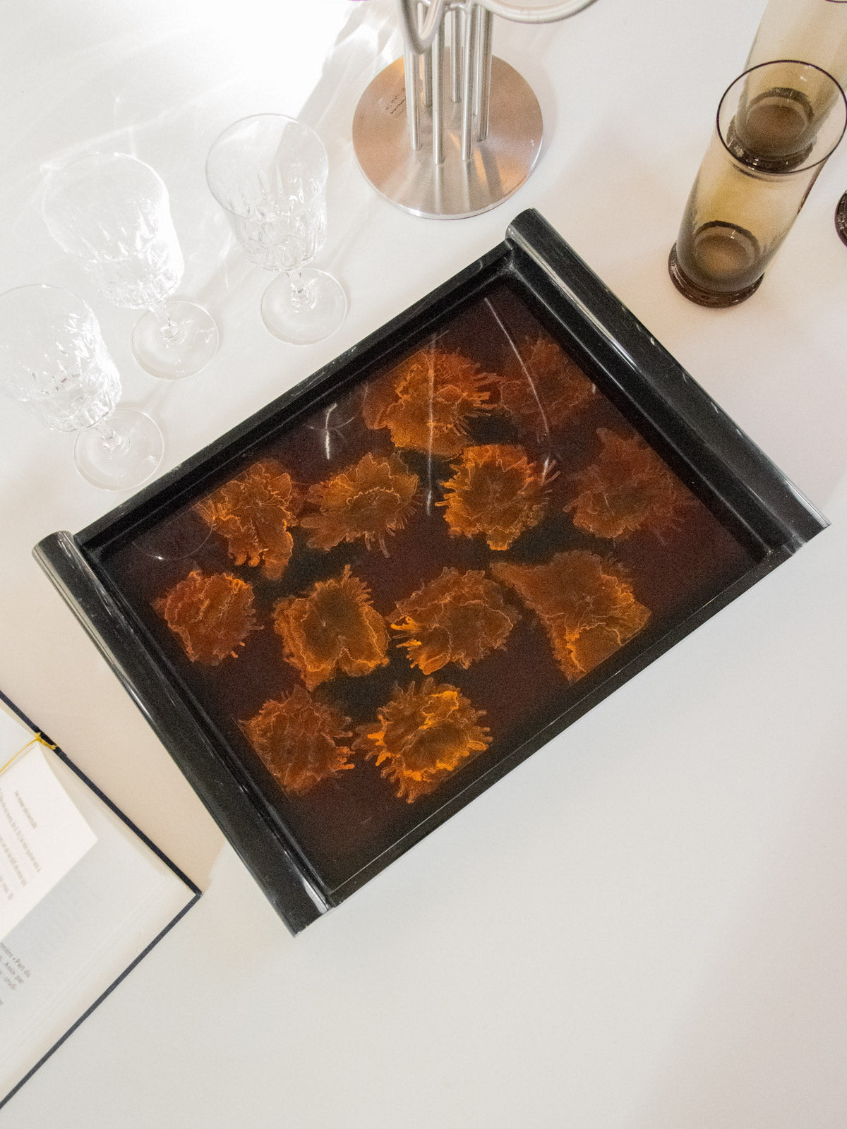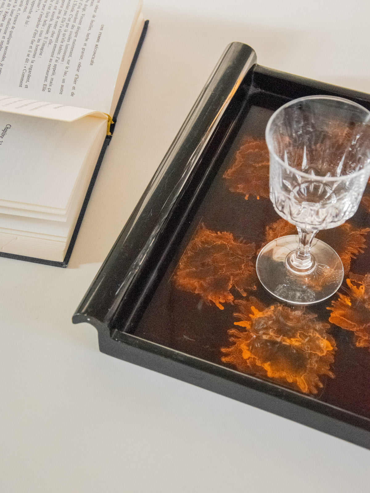 Adoptez ce plateau noir laqué au motif évoquant une fleur, dont la brillance souligne un dessin délicat et graphique. Conçu pour servir ou sublimer une composition d'objets, il offre des proportions pensées pour l'apéritif ou un plateau d'appoint sur une console. Le rendu laqué apporte une note contemporaine et soignée à une ambiance sobre et raffinée. Légères traces du temps présentes.
