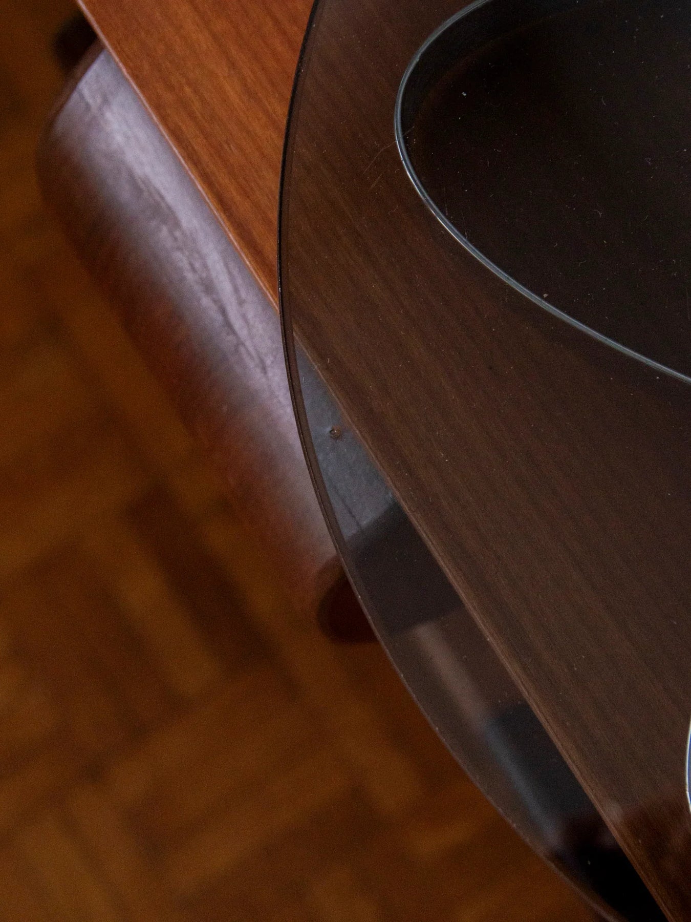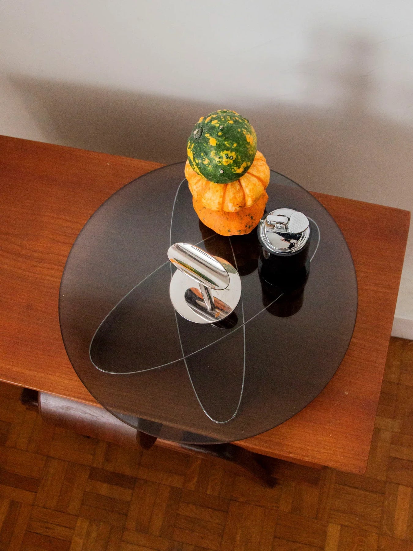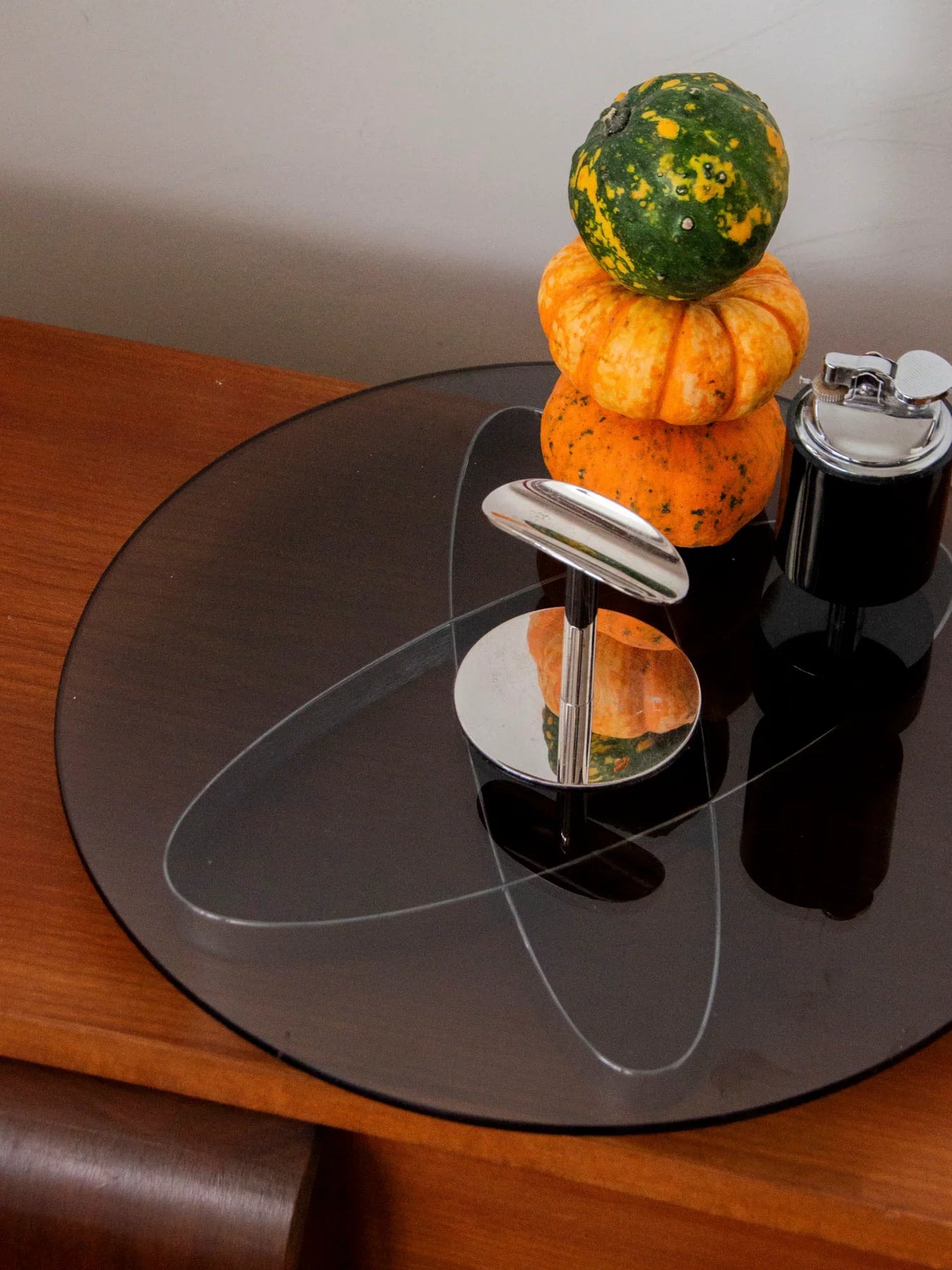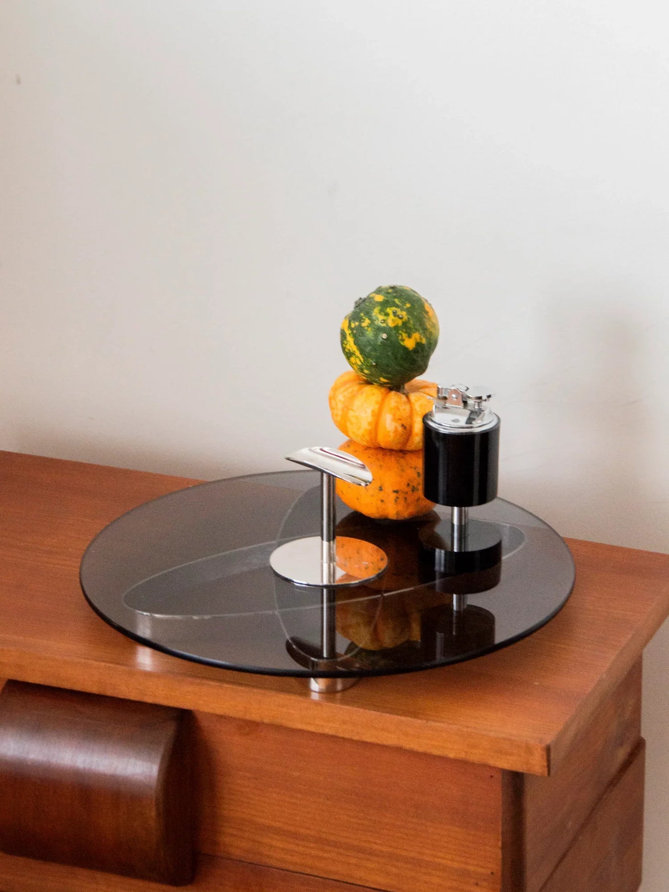 Sublimez vos apéritifs avec ce plateau à fromages des années 70 en verre fumé et chrome, où la rondeur du plateau dialogue avec un piètement sculptural pour un rendu résolument Space Age. Son format, peu encombrant, il offre une surface idéale pour présenter fromages, fruits secs et amuse-bouches lors de vos soirées, tandis que le verre fumé apporte une chaleur subtile et le chrome une touche graphique. Pièce rétro-chic au charme affirmé, en très bon état.