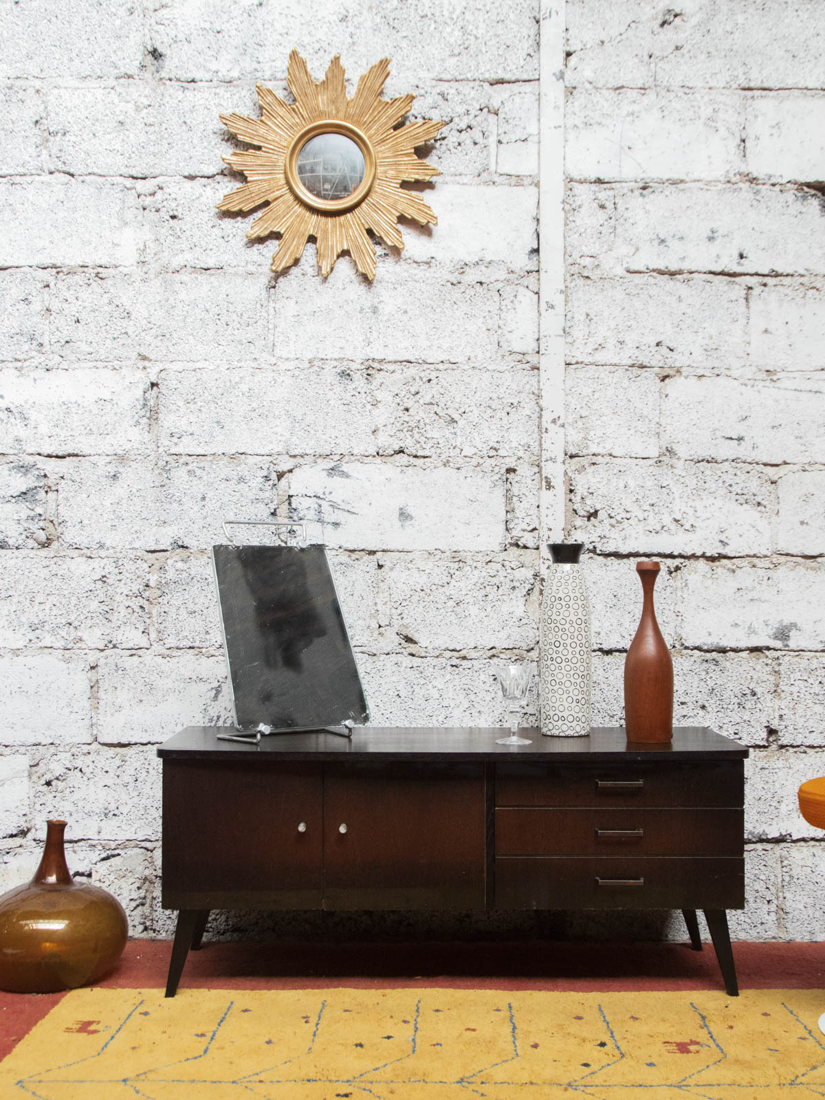 Sublimez votre intérieur avec cette enfilade en bois noir au style épuré, posée sur de fins pieds compas qui lui confèrent une allure légère et graphique. Ses trois tiroirs et deux placards offrent un rangement modulable, parfait pour organiser vaisselle, linge ou objets du quotidien tout en libérant le plan de surface. La teinte sombre et la matière bois apportent une ambiance sobre et chaleureuse, idéale dans une entrée ou un salon. Usures visibles sur les photos.